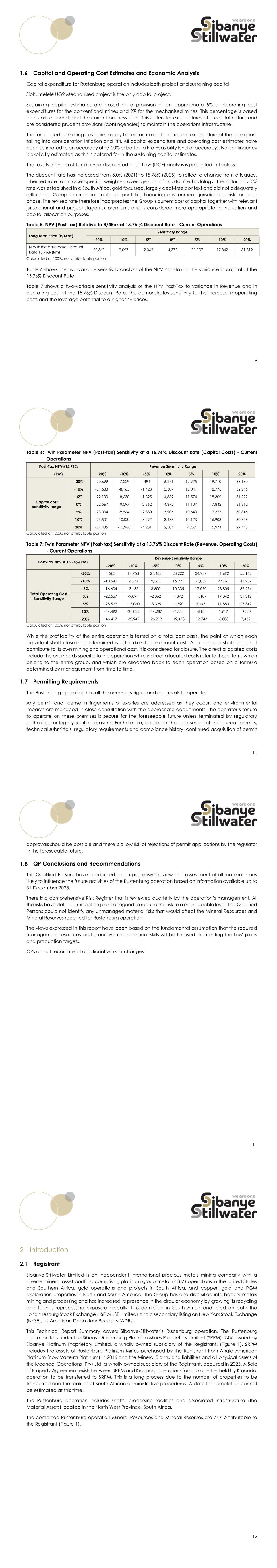 9 1.6 Capital and Operating Cost Estimates and Economic Analysis Capital expenditure for Rustenburg operation includes both project and sustaining capital. Siphumelele UG2 Mechanised project is the only capital project. Sustaining capital estimates are based on a provision of an approximate 5% of operating cost expenditures for the conventional mines and 9% for the mechanised mines. This percentage is based on historical spend, and the current business plan. This caters for expenditures of a capital nature and are considered prudent provisions (contingencies) to maintain the operations infrastructure. The forecasted operating costs are largely based on current and recent expenditure at the operation, taking into consideration inflation and PPI. All capital expenditure and operating cost estimates have been estimated to an accuracy of +/-20% or better (a Pre-Feasibility level of accuracy). No contingency is explicitly estimated as this is catered for in the sustaining capital estimates. The results of the post-tax derived discounted cash-flow (DCF) analysis is presented in Table 5. The discount rate has increased from 5.0% (2021) to 15.76% (2025) to reflect a change from a legacy, inherited rate to an asset-specific weighted average cost of capital methodology. The historical 5.0% rate was established in a South Africa, gold focussed, largely debt-free context and did not adequately reflect the Group’s current international portfolio, financing environment, jurisdictional risk, or asset phase. The revised rate therefore incorporates the Group’s current cost of capital together with relevant jurisdictional and project-stage risk premiums and is considered more appropriate for valuation and capital allocation purposes. Table 5: NPV (Post-tax) Relative to R/4Eoz at 15.76 % Discount Rate - Current Operations Long Term Price (R/4Eoz) Sensitivity Range -20% -10% -5% 0% 5% 10% 20% NPV@ the base case Discount Rate 15.76% (Rm) -22,567 -9,097 -2,362 4,372 11,107 17,842 31,312 Calculated at 100%, not attributable portion Table 6 shows the two-variable sensitivity analysis of the NPV Post-tax to the variance in capital at the 15.76% Discount Rate. Table 7 shows a two-variable sensitivity analysis of the NPV Post-Tax to variance in Revenue and in operating cost at the 15.76% Discount Rate. This demonstrates sensitivity to the increase in operating costs and the leverage potential to a higher 4E prices. 10 Table 6: Twin Parameter NPV (Post-tax) Sensitivity at a 15.76% Discount Rate (Capital Costs) - Current Operations Post-Tax NPV@15.76% Revenue Sensitivity Range (Rm) -20% -10% -5% 0% 5% 10% 20% Capital cost sensitivity range -20% -20,699 -7,229 -494 6,241 12,975 19,710 33,180 -10% -21,633 -8,163 -1,428 5,307 12,041 18,776 32,246 -5% -22,100 -8,630 -1,895 4,839 11,574 18,309 31,779 0% -22,567 -9,097 -2,362 4,372 11,107 17,842 31,312 5% -23,034 -9,564 -2,830 3,905 10,640 17,375 30,845 10% -23,501 -10,031 -3,297 3,438 10,173 16,908 30,378 20% -24,435 -10,966 -4,231 2,504 9,239 15,974 29,443 Calculated at 100%, not attributable portion Table 7: Twin Parameter NPV (Post-tax) Sensitivity at a 15.76% Discount Rate (Revenue, Operating Costs) - Current Operations Post-Tax NPV @ 15.76%(Rm) Revenue Sensitivity Range -20% -10% -5% 0% 5% 10% 20% Total Operating Cost Sensitivity Range -20% 1,283 14,753 21,488 28,222 34,957 41,692 55,162 -10% -10,642 2,828 9,563 16,297 23,032 29,767 43,237 -5% -16,604 -3,135 3,600 10,335 17,070 23,805 37,274 0% -22,567 -9,097 -2,362 4,372 11,107 17,842 31,312 5% -28,529 -15,060 -8,325 -1,590 5,145 11,880 25,349 10% -34,492 -21,022 -14,287 -7,553 -818 5,917 19,387 20% -46,417 -32,947 -26,213 -19,478 -12,743 -6,008 7,462 Calculated at 100%, not attributable portion While the profitability of the entire operation is tested on a total cost basis, the point at which each individual shaft closure is determined is after direct operational cost. As soon as a shaft does not contribute to its own mining and operational cost, it is considered for closure. The direct allocated costs include the overheads specific to the operation while indirect allocated costs refer to those items which belong to the entire group, and which are allocated back to each operation based on a formula determined by management from time to time. 1.7 Permitting Requirements The Rustenburg operation has all the necessary rights and approvals to operate. Any permit and license infringements or expiries are addressed as they occur, and environmental impacts are managed in close consultation with the appropriate departments. The operator’s tenure to operate on these premises is secure for the foreseeable future unless terminated by regulatory authorities for legally justified reasons. Furthermore, based on the assessment of the current permits, technical submittals, regulatory requirements and compliance history, continued acquisition of permit 11 approvals should be possible and there is a low risk of rejections of permit applications by the regulator in the foreseeable future. 1.8 QP Conclusions and Recommendations The Qualified Persons have conducted a comprehensive review and assessment of all material issues likely to influence the future activities of the Rustenburg operation based on information available up to 31 December 2025. There is a comprehensive Risk Register that is reviewed quarterly by the operation’s management. All the risks have detailed mitigation plans designed to reduce the risk to a manageable level. The Qualified Persons could not identify any unmanaged material risks that would affect the Mineral Resources and Mineral Reserves reported for Rustenburg operation. The views expressed in this report have been based on the fundamental assumption that the required management resources and proactive management skills will be focused on meeting the LoM plans and production targets. QPs do not recommend additional work or changes. 12 2 Introduction 2.1 Registrant Sibanye-Stillwater Limited is an i