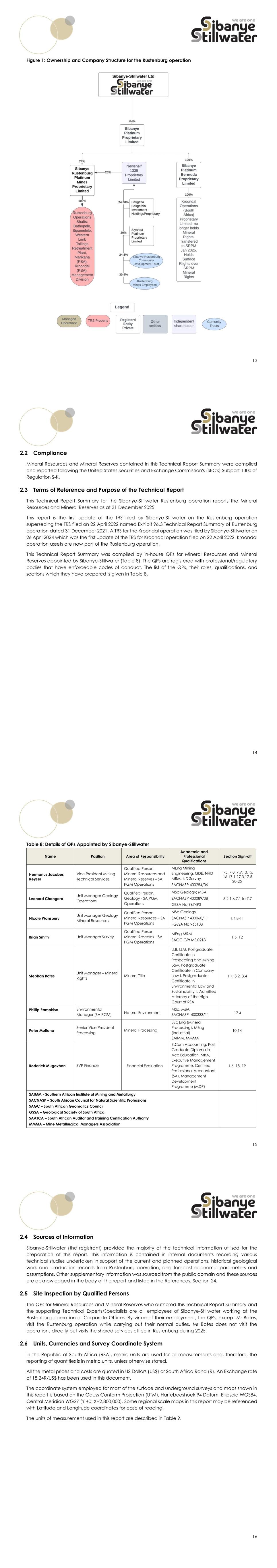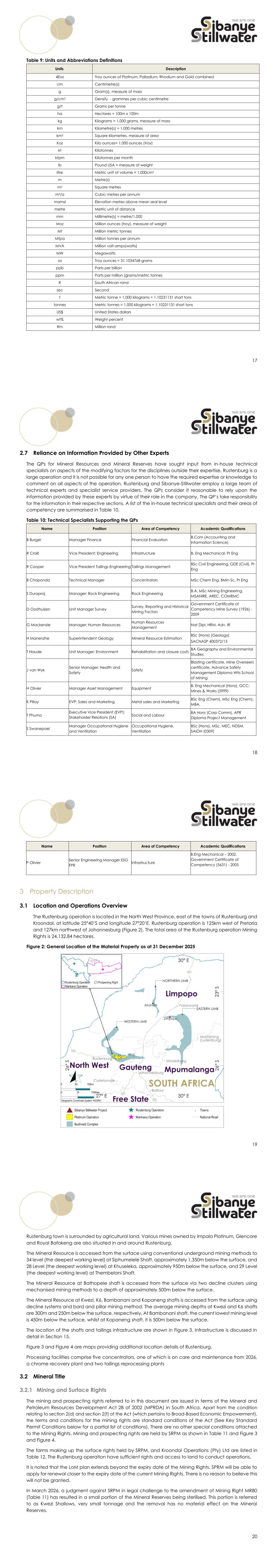 17 Table 9: Units and Abbreviations Definitions Units Description 4Eoz Troy ounces of Platinum, Palladium, Rhodium and Gold combined cm Centimetre(s) g Gram(s), measure of mass g/cm3 Density - grammes per cubic centimetre g/t Grams per tonne ha Hectares = 100m x 100m kg Kilograms = 1,000 grams, measure of mass km Kilometre(s) = 1,000 metres km2 Square kilometres, measure of area Koz Kilo ounces= 1,000 ounces (troy) kt Kilotonnes ktpm Kilotonnes per month lb Pound USA = measure of weight litre Metric unit of volume = 1,000cm3 m Metre(s) m2 Square metres m3/a Cubic metres per annum mamsl Elevation metres above mean seal level metre Metric unit of distance mm Millimetre(s) = metre/1,000 Moz Million ounces (troy), measure of weight Mt Million metric tonnes Mtpa Million tonnes per annum MVA Million volt-amps(watts) MW Megawatts oz Troy ounces = 31.1034768 grams ppb Parts per billion ppm Parts per million (grams/metric tonne) R South African rand sec Second t Metric tonne = 1,000 kilograms = 1.10231131 short tons tonnes Metric tonnes = 1,000 kilograms = 1.10231131 short tons US$ United States dollars wt% Weight percent Rm Million rand 18 2.7 Reliance on Information Provided by Other Experts The QPs for Mineral Resources and Mineral Reserves have sought input from in-house technical specialists on aspects of the modifying factors for the disciplines outside their expertise. Rustenburg is a large operation and it is not possible for any one person to have the required expertise or knowledge to comment on all aspects of the operation. Rustenburg and Sibanye-Stillwater employ a large team of technical experts and specialist service providers. The QPs consider it reasonable to rely upon the information provided by these experts by virtue of their role in the company. The QP’s take responsibility for the information in their respective sections. A list of the in-house technical specialists and their areas of competency are summarised in Table 10. Table 10: Technical Specialists Supporting the QPs Name Position Area of Competency Academic Qualifications B Burger Manager Finance Financial Evaluation B.Com (Accounting and Information Science) R Craill Vice President: Engineering Infrastructure B. Eng Mechanical, Pr Eng R Cooper Vice President Tailings Engineering Tailings Management BSc Civil Engineering, GDE (Civil), Pr Eng B Chaponda Technical Manager Concentrators MSc Chem Eng, BMin Sc, Pr Eng S Durapraj Manager: Rock Engineering Rock Engineering B.A, MSc Mining Engineering, MSANIRE, AREC, COMRMC D Oosthuizen Unit Manager Survey Survey, Reporting and Historical Mining Factors Government Certificate of Competency Mine Survey (1926) - 2009 G Mackenzie Manager: Human Resources Human Resources Management Nat Dipl. HRM. Adv. IR H Manenzhe Superintendent Geology Mineral Resource Estimation BSc (Hons) (Geology) SACNASP 400372/13 T Naude Unit Manager: Environment Rehabilitation and closure costs BA Geography and Environmental Studies J van Wyk Senior Manager: Health and Safety Safety Blasting certificate, Mine Overseers certificate, Advance Safety Management Diploma Wits School of Mining H Olivier Manager Asset Management Equipment B. Eng Mechanical (Hons), GCC: Mines & Works (5999) K Pillay EVP: Sales and Marketing Metal sales and Marketing BSc Eng (Chem), MSc Eng (Chem), MBA. T Phumo Executive Vice President (EVP): Stakeholder Relations (SA) Social and Labour BA Hons (Corp Comm), APR Diploma Project Management S Swanepoel Manager Occupational Hygiene and Ventilation Occupational Hygiene, Ventilation BSc (Hons), MSc, MEC, NDSM, SAIOH (0309) 19 Name Position Area of Competency Academic Qualifications P Olivier Senior Engineering Manager ESG FPR Infrastructure B.Eng Mechanical – 2002, Government Certificate of Competency (5631) - 2005 3 Property Description 3.1 Location and Operations Overview The Rustenburg operation is located in the North West Province, east of the towns of Rustenburg and Kroondal, at latitude 25°40’S and longitude 27°20’E. Rustenburg operation is 125km west of Pretoria and 127km northwest of Johannesburg (Figure 2). The total area of the Rustenburg operation Mining Rights is 24,132.84 hectares. Figure 2: General Location of the Material Property as at 31 December 2025 20 Rustenburg town is surrounded by agricultural land. Various mines owned by Impala Platinum, Glencore and Royal Bafokeng are also situated in and around Rustenburg. The Mineral Resource is accessed from the surface using conventional underground mining methods to 34 level (the deepest working level) at Siphumelele Shaft, approximately 1,350m below the surface, and 28 Level (the deepest working level) at Khuseleka, approximately 950m below the surface, and 29 Level (the deepest working level) at Thembelani Shaft. The Mineral Resource at Bathopele shaft is accessed from the surface via two decline clusters using mechanised mining methods to a depth of approximately 500m below the surface. The Mineral Resource at Kwezi, K6, Bambanani and Kopaneng shafts is accessed from the surface using decline systems and bord and pillar mining method. The average mining depths at Kwezi and K6 shafts are 300m and 250m below the surface, respectively. At Bambanani shaft, the current lowest mining level is 450m below the surface, whilst at Kopaneng shaft, it is 500m below the surface. The location of the shafts and tailings infrastructure are shown in Figure 3. Infrastructure is discussed in detail in Section 15. Figure 3 and Figure 4 are maps providing additional location details of Rustenburg. Processing facilities comprise five concentrators, one of which is on care and maintenance from 2026, a chrome recovery plant and two tailings reprocessing plants 3.2 Mineral Title 3.2.1 Mining and Surface Rights The mining and prospecting rights referred to in this document are issued in terms of the Mineral and Petroleum Resources Development Act 28 of 2002 (MPRDA) in South Africa. Apart from the condition relating to section 2(d) and sec