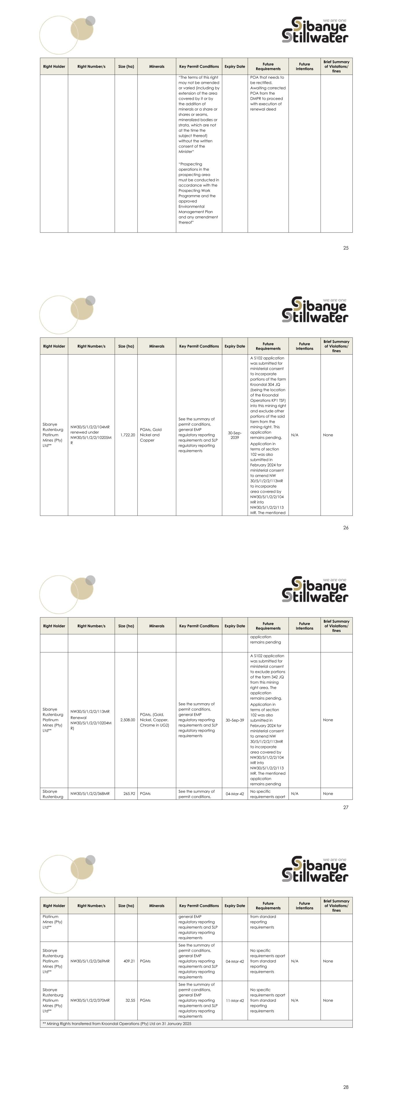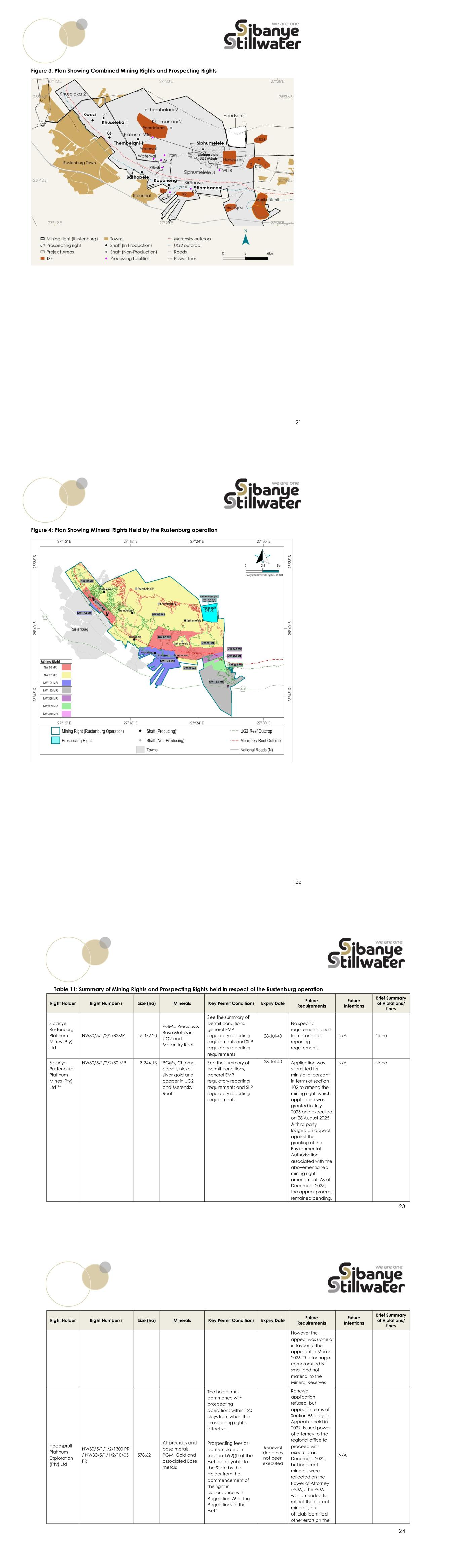 21 Figure 3: Plan Showing Combined Mining Rights and Prospecting Rights 22 Figure 4: Plan Showing Mineral Rights Held by the Rustenburg operation 23 Table 11: Summary of Mining Rights and Prospecting Rights held in respect of the Rustenburg operation Right Holder Right Number/s Size (ha) Minerals Key Permit Conditions Expiry Date Future Requirements Future Intentions Brief Summary of Violations/ fines Sibanye Rustenburg Platinum Mines (Pty) Ltd NW30/5/1/2/2/82MR 15,372.20 PGMs, Precious & Base Metals in UG2 and Merensky Reef See the summary of permit conditions, general EMP regulatory reporting requirements and SLP regulatory reporting requirements 28-Jul-40 No specific requirements apart from standard reporting requirements N/A None Sibanye Rustenburg Platinum Mines (Pty) Ltd ** NW30/5/1/2/2/80 MR 3,244.13 PGMs, Chrome, cobalt, nickel, silver gold and copper in UG2 and Merensky Reef See the summary of permit conditions, general EMP regulatory reporting requirements and SLP regulatory reporting requirements 28-Jul-40 Application was submitted for ministerial consent in terms of section 102 to amend the mining right, which application was granted in July 2025 and executed on 28 August 2025. A third party lodged an appeal against the granting of the Environmental Authorisation associated with the abovementioned mining right amendment. As of December 2025, the appeal process remained pending. N/A None 24 Right Holder Right Number/s Size (ha) Minerals Key Permit Conditions Expiry Date Future Requirements Future Intentions Brief Summary of Violations/ fines However the appeal was upheld in favour of the appellant in March 2026. The tonnage compromised is small and not material to the Mineral Reserves Hoedspruit Platinum Exploration (Pty) Ltd NW30/5/1/1/2/1300 PR / NW30/5/1/1/2/10405 PR 578.62 All precious and base metals, PGM, Gold and associated Base metals The holder must commence with prospecting operations within 120 days from when the prospecting right is effective. Prospecting fees as contemplated in section 19(2)(f) of the Act are payable to the State by the Holder from the commencement of this right in accordance with Regulation 76 of the Regulations to the Act” Renewal deed has not been executed Renewal application refused, but appeal in terms of Section 96 lodged. Appeal upheld in 2022. Issued power of attorney to the regional office to proceed with execution in December 2022, but incorrect minerals were reflected on the Power of Attorney (POA). The POA was amended to reflect the correct minerals, but officials identified other errors on the N/A