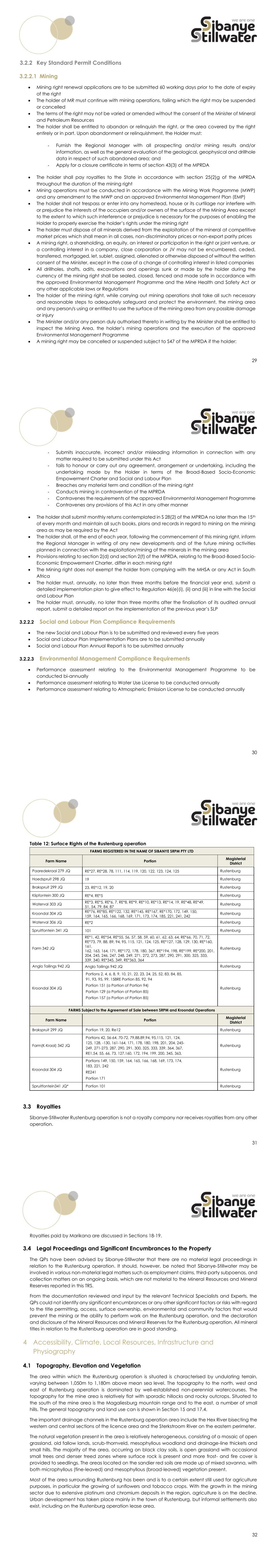 29 3.2.2 Key Standard Permit Conditions 3.2.2.1 Mining • Mining right renewal applications are to be submitted 60 working days prior to the date of expiry of the right • The holder of MR must continue with mining operations, failing which the right may be suspended or cancelled • The terms of the right may not be varied or amended without the consent of the Minister of Mineral and Petroleum Resources • The holder shall be entitled to abandon or relinquish the right, or the area covered by the right entirely or in part. Upon abandonment or relinquishment, the Holder must: - Furnish the Regional Manager with all prospecting and/or mining results and/or information, as well as the general evaluation of the geological, geophysical and drillhole data in respect of such abandoned area; and - Apply for a closure certificate in terms of section 43(3) of the MPRDA • The holder shall pay royalties to the State in accordance with section 25(2)g of the MPRDA throughout the duration of the mining right • Mining operations must be conducted in accordance with the Mining Work Programme (MWP) and any amendment to the MWP and an approved Environmental Management Plan (EMP) • The holder shall not trespass or enter into any homestead, house or its curtilage nor interfere with or prejudice the interests of the occupiers and/or owners of the surface of the Mining Area except to the extent to which such interference or prejudice is necessary for the purposes of enabling the Holder to properly exercise the holder’s rights under the mining right • The holder must dispose of all minerals derived from the exploitation of the mineral at competitive market prices which shall mean in all cases, non-discriminatory prices or non-export parity prices • A mining right, a shareholding, an equity, an interest or participation in the right or joint venture, or a controlling interest in a company, close corporation or JV may not be encumbered, ceded, transferred, mortgaged, let, sublet, assigned, alienated or otherwise disposed of without the written consent of the Minister, except in the case of a change of controlling interest in listed companies • All drillholes, shafts, adits, excavations and openings sunk or made by the holder during the currency of the mining right shall be sealed, closed, fenced and made safe in accordance with the approved Environmental Management Programme and the Mine Health and Safety Act or any other applicable laws or Regulations • The holder of the mining right, while carrying out mining operations shall take all such necessary and reasonable steps to adequately safeguard and protect the environment, the mining area and any person/s using or entitled to use the surface of the mining area from any possible damage or injury • The Minister and/or any person duly authorised thereto in writing by the Minister shall be entitled to inspect the Mining Area, the holder’s mining operations and the execution of the approved Environmental Management Programme • A mining right may be cancelled or suspended subject to S47 of the MPRDA if the holder: 30 - Submits inaccurate, incorrect and/or misleading information in connection with any matter required to be submitted under this Act - fails to honour or carry out any agreement, arrangement or undertaking, including the undertaking made by the Holder in terms of the Broad-Based Socio-Economic Empowerment Charter and Social and Labour Plan - Breaches any material term and condition of the mining right - Conducts mining in contravention of the MPRDA - Contravenes the requirements of the approved Environmental Management Programme - Contravenes any provisions of this Act in any other manner • The holder shall submit monthly returns contemplated in S 28(2) of the MPRDA no later than the 15th of every month and maintain all such books, plans and records in regard to mining on the mining area as may be required by the Act • The holder shall, at the end of each year, following the commencement of this mining right, inform the Regional Manager in writing of any new developments and of the future mining activities planned in connection with the exploitation/mining of the minerals in the mining area • Provisions relating to section 2(d) and section 2(f) of the MPRDA, relating to the Broad-Based Socio- Economic Empowerment Charter, differ in each mining right • The Mining right does not exempt the holder from complying with the MHSA or any Act in South Africa • The holder must, annually, no later than three months before the financial year end, submit a detailed implementation plan to give effect to Regulation 46(e)(i), (ii) and (iii) in line with the Social and Labour Plan • The holder must, annually, no later than three months after the finalisation of its audited annual report, submit a detailed report on the implementation of the previous year’s SLP 3.2.2.2 Social and Labour Plan Compliance Requirements • The new Social and Labour Plan is to be submitted and reviewed every five years • Social and Labour Plan Implementation Plans are to be submitted annually • Social and Labour Plan Annual Report is to be submitted annually 3.2.2.3 Environmental Management Compliance Requirements • Performance assessment relating to the Environmental Management Programme to be conducted bi-annually • Performance assessment relating to Water Use License to be conducted annually • Performance assessment relating to Atmospheric Emission License to be conducted annually 31 Table 12: Surface Rights of the Rustenburg operation FARMS REGISTERED IN THE NAME OF SIBANYE SRPM PTY LTD Farm Name Portion Magisterial District Paaredekraal 279 JQ RE*27, RE*28, 78, 111, 114, 119, 120, 122, 123, 124, 125 Rustenburg Hoedspruit 298 JQ 19 Rustenburg Brakspruit 299 JQ 23, RE*12, 19, 20 Rustenburg Klipfontein 300 JQ RE*4, RE*5 Rustenburg Waterval 303 JQ RE*3, RE*5, RE*6, 7, RE*8, RE*9, RE*10, RE*13, RE*14, 19, RE*48, RE*49, 51, 54, 79, 84, 87 Rustenbu