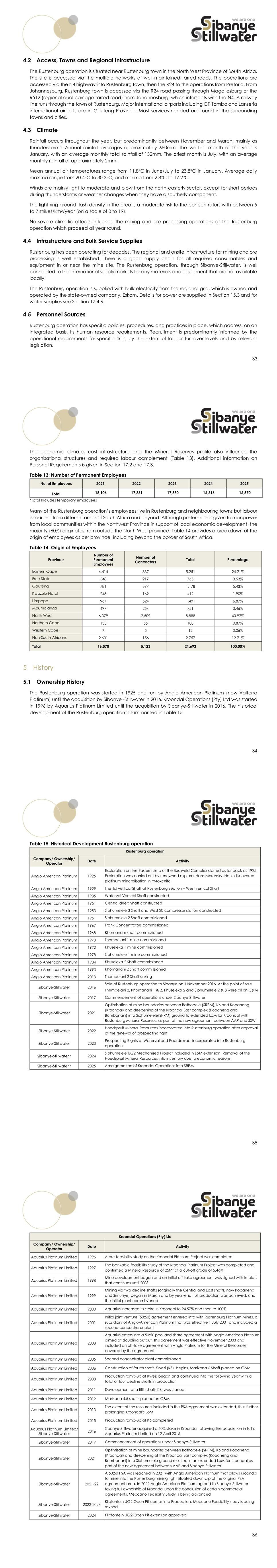 33 4.2 Access, Towns and Regional Infrastructure The Rustenburg operation is situated near Rustenburg town in the North West Province of South Africa. The site is accessed via the multiple networks of well-maintained tarred roads. The operations are accessed via the N4 highway into Rustenburg town, then the R24 to the operations from Pretoria. From Johannesburg, Rustenburg town is accessed via the R24 road passing through Magaliesburg or the R512 (regional dual carriage tarred road) from Johannesburg, which intersects with the N4. A railway line runs through the town of Rustenburg. Major international airports including OR Tambo and Lanseria international airports are in Gauteng Province. Most services needed are found in the surrounding towns and cities. 4.3 Climate Rainfall occurs throughout the year, but predominantly between November and March, mainly as thunderstorms. Annual rainfall averages approximately 650mm. The wettest month of the year is January, with an average monthly total rainfall of 132mm. The driest month is July, with an average monthly rainfall of approximately 2mm. Mean annual air temperatures range from 11.8°C in June/July to 23.8°C in January. Average daily maxima range from 20.4°C to 30.3°C, and minima from 2.8°C to 17.2°C. Winds are mainly light to moderate and blow from the north-easterly sector, except for short periods during thunderstorms or weather changes when they have a southerly component. The lightning ground flash density in the area is a moderate risk to the concentrators with between 5 to 7 strikes/km2/year (on a scale of 0 to 19). No severe climatic effects influence the mining and ore processing operations at the Rustenburg operation which proceed all year round. 4.4 Infrastructure and Bulk Service Supplies Rustenburg has been operating for decades. The regional and onsite infrastructure for mining and ore processing is well established. There is a good supply chain for all required consumables and equipment in or near the mine site. The Rustenburg operation, through Sibanye-Stillwater, is well connected to the international supply markets for any materials and equipment that are not available locally. The Rustenburg operation is supplied with bulk electricity from the regional grid, which is owned and operated by the state-owned company, Eskom. Details for power are supplied in Section 15.3 and for water supplies see Section 17.4.6. 4.5 Personnel Sources Rustenburg operation has specific policies, procedures, and practices in place, which address, on an integrated basis, its human resource requirements. Recruitment is predominantly informed by the operational requirements for specific skills, by the extent of labour turnover levels and by relevant legislation. 34 The economic climate, cost infrastructure and the Mineral Reserves profile also influence the organisational structures and required labour complement (Table 13). Additional information on Personal Requirements is given in Section 17.2 and 17.3. Table 13: Number of Permanent Employees No. of Employees 2021 2022 2023 2024 2025 Total 18,106 17,861 17,330 16,616 16,570 *Total Includes temporary employees Many of the Rustenburg operation’s employees live in Rustenburg and neighbouring towns but labour is sourced from different areas of South Africa and beyond. Although preference is given to manpower from local communities within the Northwest Province in support of local economic development, the majority (60%) originates from outside the North West province. Table 14 provides a breakdown of the origin of employees as per province, including beyond the border of South Africa. Table 14: Origin of Employees Province Number of Permanent Employees Number of Contractors Total Percentage Eastern Cape 4,414 837 5,251 24.21% Free State 548 217 765 3.53% Gauteng 781 397 1,178 5.43% Kwazulu-Natal 243 169 412 1.90% Limpopo 967 524 1,491 6.87% Mpumalanga 497 254 751 3.46% North West 6,379 2,509 8,888 40.97% Northern Cape 133 55 188 0.87% Western Cape 7 5 12 0.06% Non-South Africans 2,601 156 2,757 12.71% Total 16,570 5,123 21,693 100,00% 5 History 5.1 Ownership History The Rustenburg operation was started in 1925 and run by Anglo American Platinum (now Valterra Platinum) until the acquisition by Sibanye -Stillwater in 2016. Kroondal Operations (Pty) Ltd was started in 1996 by Aquarius Platinum Limited until the acquisition by Sibanye-Stillwater in 2016. The historical development of the Rustenburg operation is summarised in Table 15. 35 Table 15: Historical Development Rustenburg operation Rustenburg operation Company/ Ownership/ Operator Date Activity Anglo American Platinum 1925 Exploration on the Eastern Limb of the Bushveld Complex started as far back as 1925. Exploration was carried out by renowned explorer Hans Merensky. Hans discovered platinum mineralisation in pyroxenite Anglo American Platinum 1929 The 1st vertical Shaft at Rustenburg Section – West vertical Shaft Anglo American Platinum 1935 Waterval Vertical Shaft constructed Anglo American Platinum 1951 Central deep Shaft constructed Anglo American Platinum 1953 Siphumelele 3 Shaft and West 20 compressor station constructed Anglo American Platinum 1961 Siphumelele 2 Shaft commissioned Anglo American Platinum 1967 Frank Concentrators commissioned Anglo American Platinum 1968 Khomanani Shaft commissioned Anglo American Platinum 1970 Thembelani 1 mine commissioned Anglo American Platinum 1972 Khuseleka 1 mine commissioned Anglo American Platinum 1978 Siphumelele 1 mine commissioned Anglo American Platinum 1984 Khuseleka 2 Shaft commissioned Anglo American Platinum 1993 Khomanani 2 Shaft commissioned Anglo American Platinum 2013 Thembelani 2 Shaft sinking Sibanye-Stillwater 2016 Sale of Rustenburg operation to Sibanye on 1 November 2016. At the point of sale Thembelani 2, Khomanani 1 & 2, Khuseleka 2 and Siphumelele 2 & 3 were all on C&M Sibanye-Stillwater 2017 Commencement of operations under Sibanye-Stillwater Sibanye-Stillwater 20