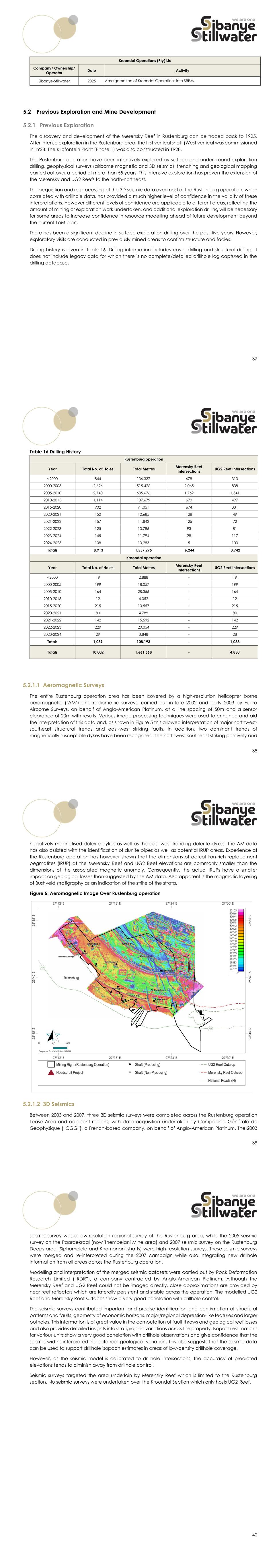 37 Kroondal Operations (Pty) Ltd Company/ Ownership/ Operator Date Activity Sibanye-Stillwater 2025 Amalgamation of Kroondal Operations into SRPM 5.2 Previous Exploration and Mine Development 5.2.1 Previous Exploration The discovery and development of the Merensky Reef in Rustenburg can be traced back to 1925. After intense exploration in the Rustenburg area, the first vertical shaft (West vertical was commissioned in 1928. The Klipfontein Plant (Phase 1) was also constructed in 1928. The Rustenburg operation have been intensively explored by surface and underground exploration drilling, geophysical surveys (airborne magnetic and 3D seismic), trenching and geological mapping carried out over a period of more than 55 years. This intensive exploration has proven the extension of the Merensky and UG2 Reefs to the north-northeast. The acquisition and re-processing of the 3D seismic data over most of the Rustenburg operation, when correlated with drillhole data, has provided a much higher level of confidence in the validity of these interpretations. However different levels of confidence are applicable to different areas, reflecting the amount of mining or exploration work undertaken, and additional exploration drilling will be necessary for some areas to increase confidence in resource modelling ahead of future development beyond the current LoM plan. There has been a significant decline in surface exploration drilling over the past five years. However, exploratory visits are conducted in previously mined areas to confirm structure and facies. Drilling history is given in Table 16. Drilling information includes cover drilling and structural drilling. It does not include legacy data for which there is no complete/detailed drillhole log captured in the drilling database. 38 Table 16:Drilling History Rustenburg operation Year Total No. of Holes Total Metres Merensky Reef Intersections UG2 Reef Intersections <2000 844 136,337 678 313 2000-2005 2,626 515,426 2,065 838 2005-2010 2,740 635,676 1,769 1,341 2010-2015 1,114 137,679 679 497 2015-2020 902 71,051 674 331 2020-2021 152 12,685 128 49 2021-2022 157 11,842 125 72 2022-2023 125 10,786 93 81 2023-2024 145 11,794 28 117 2024-2025 108 10,283 5 103 Totals 8,913 1,557,275 6,244 3,742 Kroondal operation Year Total No. of Holes Total Metres Merensky Reef Intersections UG2 Reef Intersections <2000 19 2,888 - 19 2000-2005 199 18,057 - 199 2005-2010 164 28,356 - 164 2010-2015 12 4,052 - 12 2015-2020 215 10,557 - 215 2020-2021 80 4,789 - 80 2021-2022 142 15,592 - 142 2022-2023 229 20,054 - 229 2023-2024 29 3,848 - 28 Totals 1,089 108,193 - 1,088 Totals 10,002 1,661,568 - 4,830 5.2.1.1 Aeromagnetic Surveys The entire Rustenburg operation area has been covered by a high-resolution helicopter borne aeromagnetic (‘AM’) and radiometric surveys, carried out in late 2002 and early 2003 by Fugro Airborne Surveys, on behalf of Anglo-American Platinum, at a line spacing of 50m and a sensor clearance of 20m with results. Various image processing techniques were used to enhance and aid the interpretation of this data and, as shown in Figure 5 this allowed interpretation of major northwest- southeast structural trends and east-west striking faults. In addition, two dominant trends of magnetically susceptible dykes have been recognised; the northwest-southeast striking positively and 39 negatively magnetised dolerite dykes as well as the east-west trending dolerite dykes. The AM data has also assisted with the identification of dunite pipes as well as potential IRUP areas. Experience at the Rustenburg operation has however shown that the dimensions of actual Iron-rich replacement pegmatites (IRUP) at the Merensky Reef and UG2 Reef elevations are commonly smaller than the dimensions of the associated magnetic anomaly. Consequently, the actual IRUPs have a smaller impact on geological losses than suggested by the AM data. Also apparent is the magmatic layering of Bushveld stratigraphy as an indication of the strike of the strata. Figure 5: Aeromagnetic Image Over Rustenburg operation 5.2.1.2 3D Seismics Between 2003 and 2007, three 3D seismic surveys were completed across the Rustenburg operation Lease Area and adjacent regions, with data acquisition undertaken by Compagnie Générale de Geophysique (“CGG”), a French-based company, on behalf of Anglo-American Platinum. The 2003 40 seismic survey was a low-resolution regional survey of the Rustenburg area, while the 2005 seismic survey on the Paardekraal (now Thembelani Mine area) and 2007 seismic survey on the Rustenburg Deeps area (Siphumelele and Khomanani shafts) were high-resolution surveys. These seismic surveys were merged and re-interpreted during the 2007 campaign while also integrating new drillhole information from all areas across the Rustenburg operation. Modelling and interpretation of the merged seismic datasets were carried out by Rock Deformation Research Limited (“RDR”), a company contracted by Anglo-American Platinum. Although the Merensky Reef and UG2 Reef could not be imaged directly, close approximations are provided by near reef reflectors which are laterally persistent and stable across the operation. The modelled UG2 Reef and Merensky Reef surfaces show a very good correlation with drillhole control. The seismic surveys contributed important and precise identification and confirmation of structural patterns and faults, geometry of economic horizons, major/regional depression-like features and larger potholes. This information is of great value in the computation of fault throws and geological reef losses and also provides detailed insights into stratigraphic variations across the property. Isopach estimations for various units show a very good correlation with drillhole observations and give confidence that the seismic widths interpreted indicate real geological variation. This also suggests that the seismic data can be used to support drillhole isopach estimates in areas of low-dens