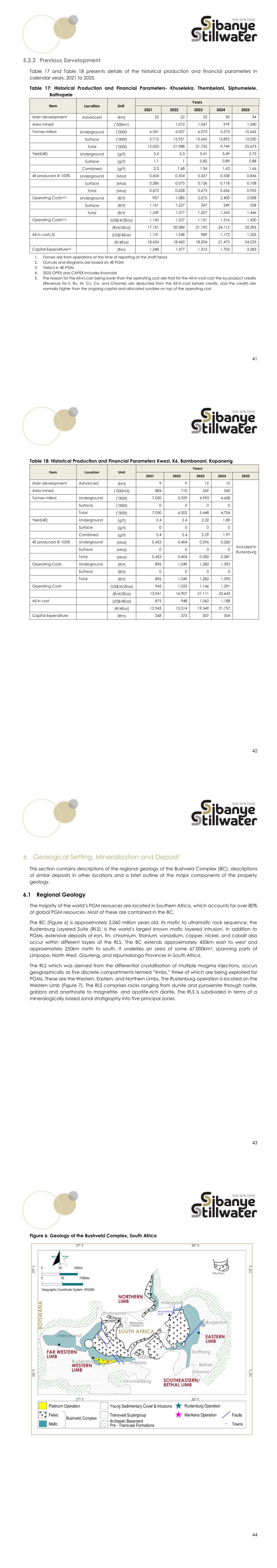 41 5.2.2 Previous Development Table 17 and Table 18 presents details of the historical production and financial parameters in calendar years, 2021 to 2025. Table 17: Historical Production and Financial Parameters- Khuseleka, Thembelani, Siphumelele, Bathopele Item Location Unit Years 2021 2022 2023 2024 2025 Main development Advanced (km) 23 22 23 20 34 Area mined (’000m2) 1,072 1,047 979 1,540 Tonnes milled Underground (’000t) 6,341 6,037 6,073 5,575 10,642 Surface (’000t) 5,712 15,951 15,662 13,892 15,030 Total (’000t) 12,053 21,988 21,735 9,749 25,673 Yield(4E) Underground (g/t) 3.4 3.3 3.41 3,49 2.75 Surface (g/t) 1.1 1 0.82 0.89 0.88 Combined (g/t) 2.3 1.68 1.54 1.63 1.66 4E produced @ 100% Underground (Moz) 0.604 0.554 0.537 0.538 0.846 Surface (Moz) 0.286 0.075 0.136 0.118 0.108 Total (Moz) 0.672 0.628 0.673 0.656 0.955 Operating Costs(4,5) Underground (R/t) 957 1,085 2,075 2,400 2,008 Surface (R/t) 1,161 1,227 247 249 258 Total (R/t) 1,249 1,377 1,207 1,345 1,446 Operating Costs(4,5) (US$/4/2Eoz) 1,160 1,227 1,151 1,316 1,420 (R/4/2Eoz) 17,151 20,084 21,195 24,112 25,396 All in cost(,5) (US$/4Eoz) 1,131 1,248 989 1,172 1,355 (R/4Eoz) 18,624 18,460 18,204 21,473 24,235 Capital Expenditure(4) (Rm) 1,248 1,377 1,313 1,703 2,283 1. Tonnes are from operations at the time of reporting at the shaft head 2. Ounces and kilograms are based on 4E PGM 3. Yield is in 4E PGM 4. 2025 OPEX and CAPEX includes Kroondal 5. The reason for the All-in-cost being lower than the operating cost are that for the All-in-cost cost the by-product credits (Revenue for Ir, Ru, Ni, Cu, Co, and Chrome) are deducted from the All-in-cost before credits, and the credits are normally higher than the ongoing capital and allocated sundries on top of the operating cost 42 Table 18: Historical Production and Financial Parameters Kwezi, K6, Bambanani, Kopaneng Item Location Unit Years 2021 2022 2023 2024 2025 Main development Advanced (km) 9 9 12 10 Included in Rustenburg Area mined (’000m2) 884 710 569 540 Tonnes milled Underground (’000t) 7,050 5,929 4,993 4,428 Surface (’000t) 0 0 0 0 Total (’000t) 7,050 6,502 5,448 4,704 Yield(4E) Underground (g/t) 2.4 2.4 2.22 1.80 Surface (g/t) 0 0 0 0 Combined (g/t) 2.4 2.4 2.29 1.97 4E produced @ 100% Underground (Moz) 0.453 0.404 0.296 0.260 Surface (Moz) 0 0 0 0 Total (Moz) 0.453 0.404 0.330 0.281 Operating Costs Underground (R/t) 896 1,049 1,282 1,392 Surface (R/t) 0 0 0 0 Total (R/t) 896 1,049 1,282 1,392 Operating Costs (US$/4/2Eoz) 943 1,033 1,146 1,291 (R/4/2Eoz) 13,941 16,907 21,111 23,642 All in cost (US$/4Eoz) 875 948 1,062 1,188 (R/4Eoz) 12,943 15,514 19,549 21,757 Capital Expenditure (Rm) 268 373 307 504 43 6 Geological Setting, Mineralisation and Deposit This section contains descriptions of the regional geology of the Bushveld Complex (BC), descriptions of similar deposits in other locations and a brief outline of the major components of the property geology. 6.1 Regional Geology The majority of the world’s PGM resources are located in Southern Africa, which accounts for over 80% of global PGM resources. Most of these are contained in the BC. The BC (Figure 6) is approximately 2,060 million years old. Its mafic to ultramafic rock sequence, the Rustenburg Layered Suite (RLS), is the world’s largest known mafic layered intrusion. In addition to PGMs, extensive deposits of iron, tin, chromium, titanium, vanadium, copper, nickel, and cobalt also occur within different layers of the RLS. The BC extends approximately 450km east to west and approximately 250km north to south. It underlies an area of some 67,000km2, spanning parts of Limpopo, North West, Gauteng, and Mpumalanga Provinces in South Africa. The RLS which was derived from the differential crystallisation of multiple magma injections, occurs geographically as five discrete compartments termed “limbs,” three of which are being exploited for PGMs. These are the Western, Eastern, and Northern Limbs. The Rustenburg operation is located on the Western Limb (Figure 7). The RLS comprises rocks ranging from dunite and pyroxenite through norite, gabbro and anorthosite to magnetite- and apatite-rich diorite. The RLS is subdivided in terms of a mineralogically based zonal stratigraphy into five principal zones. 44 Figure 6: Geology of the Bushveld Complex, South Africa