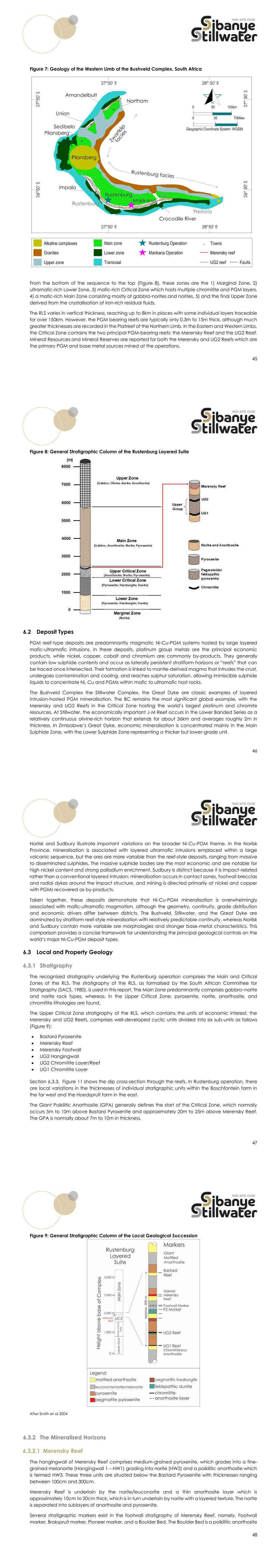 45 Figure 7: Geology of the Western Limb of the Bushveld Complex, South Africa From the bottom of the sequence to the top (Figure 8), these zones are the 1) Marginal Zone, 2) ultramafic-rich Lower Zone, 3) mafic-rich Critical Zone which hosts multiple chromitite and PGM layers, 4) a mafic-rich Main Zone consisting mostly of gabbro-norites and norites, 5) and the final Upper Zone derived from the crystallisation of iron-rich residual fluids. The RLS varies in vertical thickness, reaching up to 8km in places with some individual layers traceable for over 150km. However, the PGM bearing reefs are typically only 0.3m to 15m thick, although much greater thicknesses are recorded in the Platreef of the Northern Limb. In the Eastern and Western Limbs, the Critical Zone contains the two principal PGM-bearing reefs: the Merensky Reef and the UG2 Reef. Mineral Resources and Mineral Reserves are reported for both the Merensky and UG2 Reefs which are the primary PGM and base metal sources mined at the operations. 46 Figure 8: General Stratigraphic Column of the Rustenburg Layered Suite 6.2 Deposit Types PGM reef-type deposits are predominantly magmatic Ni-Cu-PGM systems hosted by large layered mafic-ultramafic intrusions. In these deposits, platinum group metals are the principal economic products, while nickel, copper, cobalt and chromium are commonly by-products. They generally contain low sulphide contents and occur as laterally persistent stratiform horizons or “reefs” that can be traced once intersected. Their formation is linked to mantle-derived magma that intrudes the crust, undergoes contamination and cooling, and reaches sulphur saturation, allowing immiscible sulphide liquids to concentrate Ni, Cu and PGMs within mafic to ultramafic host rocks. The Bushveld Complex the Stillwater Complex, the Great Dyke are classic examples of layered intrusion-hosted PGM mineralisation. The BC remains the most significant global example, with the Merensky and UG2 Reefs in the Critical Zone hosting the world’s largest platinum and chromite resources. At Stillwater, the economically important J-M Reef occurs in the Lower Banded Series as a relatively continuous olivine-rich horizon that extends for about 36km and averages roughly 2m in thickness. In Zimbabwe’s Great Dyke, economic mineralisation is concentrated mainly in the Main Sulphide Zone, with the Lower Sulphide Zone representing a thicker but lower-grade unit. 47 Norilsk and Sudbury illustrate important variations on the broader Ni-Cu-PGM theme. In the Norilsk Province, mineralisation is associated with layered ultramafic intrusions emplaced within a large volcanic sequence, but the ores are more variable than the reef-style deposits, ranging from massive to disseminated sulphides. The massive sulphide bodies are the most economic and are notable for high nickel content and strong palladium enrichment. Sudbury is distinct because it is impact-related rather than a conventional layered intrusion; mineralisation occurs in contact zones, footwall breccias and radial dykes around the impact structure, and mining is directed primarily at nickel and copper with PGMs recovered as by-products. Taken together, these deposits demonstrate that Ni-Cu-PGM mineralisation is overwhelmingly associated with mafic-ultramafic magmatism, although the geometry, continuity, grade distribution and economic drivers differ between districts. The Bushveld, Stillwater, and the Great Dyke are dominated by stratiform reef-style mineralisation with relatively predictable continuity, whereas Norilsk and Sudbury contain more variable ore morphologies and stronger base-metal characteristics. This comparison provides a concise framework for understanding the principal geological controls on the world’s major Ni-Cu-PGM deposit types. 6.3 Local and Property Geology 6.3.1 Stratigraphy The recognised stratigraphy underlying the Rustenburg operation comprises the Main and Critical Zones of the RLS. The stratigraphy of the RLS, as formalised by the South African Committee for Stratigraphy (SACS, 1980), is used in this report. The Main Zone predominantly comprises gabbro–norite and norite rock types, whereas, in the Upper Critical Zone, pyroxenite, norite, anorthosite, and chromitite lithologies are found. The Upper Critical Zone stratigraphy of the RLS, which contains the units of economic interest, the Merensky and UG2 Reefs, comprises well-developed cyclic units divided into six sub-units as follows (Figure 9): • Bastard Pyroxenite • Merensky Reef • Merensky Footwall • UG2 Hangingwall • UG2 Chromitite Layer/Reef • UG1 Chromitite Layer Section 6.3.3, Figure 11 shows the dip cross-section through the reefs. In Rustenburg operation, there are local variations in the thicknesses of individual stratigraphic units within the Boschfontein farm in the far west and the Hoedspruit farm in the east. The Giant Poikilitic Anorthosite (GPA) generally defines the start of the Critical Zone, which normally occurs 5m to 10m above Bastard Pyroxenite and approximately 20m to 25m above Merensky Reef. The GPA is normally about 7m to 10m in thickness. 48 Figure 9: General Stratigraphic Column of the Local Geological Succession After Smith et al 2004 6.3.2 The Mineralised Horizons 6.3.2.1 Merensky Reef The hangingwall of Merensky Reef comprises medium-grained pyroxenite, which grades into a fine- grained melanorite (Hangingwall 1 – HW1) grading into norite (HW2) and a poikilitic anorthosite which is termed HW3. These three units are situated below the Bastard Pyroxenite with thicknesses ranging between 100cm and 300cm. Merensky Reef is underlain by the norite/leuconorite and a thin anorthosite layer which is approximately 10cm to 20cm thick, which is in turn underlain by norite with a layered texture. The norite is separated into sublayers of anorthosite and pyroxenite. Several stratigraphic markers exist in the footwall stratigraphy of Merensky Reef, namely, Footwall marker, Brakspru