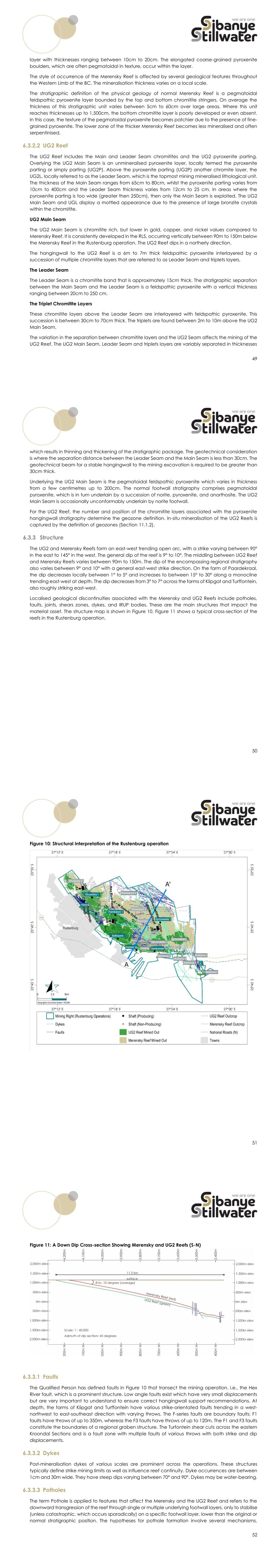 49 layer with thicknesses ranging between 10cm to 20cm. The elongated coarse-grained pyroxenite boulders, which are often pegmatoidal in texture, occur within the layer. The style of occurrence of the Merensky Reef is affected by several geological features throughout the Western Limb of the BC. The mineralisation thickness varies on a local scale. The stratigraphic definition of the physical geology of normal Merensky Reef is a pegmatoidal feldspathic pyroxenite layer bounded by the top and bottom chromitite stringers. On average the thickness of this stratigraphic unit varies between 5cm to 60cm over large areas. Where this unit reaches thicknesses up to 1,500cm, the bottom chromitite layer is poorly developed or even absent. In this case, the texture of the pegmatoidal pyroxenite becomes patchier due to the presence of fine- grained pyroxenite. The lower zone of the thicker Merensky Reef becomes less mineralised and often serpentinised. 6.3.2.2 UG2 Reef The UG2 Reef includes the Main and Leader Seam chromitites and the UG2 pyroxenite parting. Overlying the UG2 Main Seam is an unmineralised pyroxenite layer, locally termed the pyroxenite parting or simply parting (UG2P). Above the pyroxenite parting (UG2P) another chromite layer, the UG2L, locally referred to as the Leader Seam, which is the topmost mining mineralised lithological unit. The thickness of the Main Seam ranges from 65cm to 80cm, whilst the pyroxenite parting varies from 10cm to 400cm and the Leader Seam thickness varies from 12cm to 25 cm. In areas where the pyroxenite parting is too wide (greater then 250cm), then only the Main Seam is exploited. The UG2 Main Seam and UGL display a mottled appearance due to the presence of large bronzite crystals within the chromitite. UG2 Main Seam The UG2 Main Seam is chromitite rich, but lower in gold, copper, and nickel values compared to Merensky Reef. It is consistently developed in the RLS, occurring vertically between 90m to 150m below the Merensky Reef in the Rustenburg operation. The UG2 Reef dips in a northerly direction. The hangingwall to the UG2 Reef is a 6m to 7m thick feldspathic pyroxenite interlayered by a succession of multiple chromitite layers that are referred to as Leader Seam and triplets layers. The Leader Seam The Leader Seam is a chromitite band that is approximately 15cm thick. The stratigraphic separation between the Main Seam and the Leader Seam is a feldspathic pyroxenite with a vertical thickness ranging between 20cm to 250 cm. The Triplet Chromitite Layers These chromitite layers above the Leader Seam are interlayered with feldspathic pyroxenite. This succession is between 30cm to 70cm thick. The triplets are found between 2m to 10m above the UG2 Main Seam. The variation in the separation between chromitite layers and the UG2 Seam affects the mining of the UG2 Reef. The UG2 Main Seam, Leader Seam and triplets layers are variably separated in thicknesses 50 which results in thinning and thickening of the stratigraphic package. The geotechnical consideration is where the separation distance between the Leader Seam and the Main Seam is less than 30cm. The geotechnical beam for a stable hangingwall to the mining excavation is required to be greater than 30cm thick. Underlying the UG2 Main Seam is the pegmatoidal feldspathic pyroxenite which varies in thickness from a few centimetres up to 200cm. The normal footwall stratigraphy comprises pegmatoidal pyroxenite, which is in turn underlain by a succession of norite, pyroxenite, and anorthosite. The UG2 Main Seam is occasionally unconformably underlain by norite footwall. For the UG2 Reef, the number and position of the chromitite layers associated with the pyroxenite hangingwall stratigraphy determine the geozone definition. In-situ mineralisation of the UG2 Reefs is captured by the definition of geozones (Section 11.1.2). 6.3.3 Structure The UG2 and Merensky Reefs form an east-west trending open arc, with a strike varying between 90° in the east to 145° in the west. The general dip of the reef is 9° to 10°. The middling between UG2 Reef and Merensky Reefs varies between 90m to 150m. The dip of the encompassing regional stratigraphy also varies between 9° and 10° with a general east-west strike direction. On the farm of Paardekraal, the dip decreases locally between 1° to 5° and increases to between 15° to 30° along a monocline trending east-west at depth. The dip decreases from 3° to 7° across the farms of Klipgat and Turffontein, also roughly striking east-west. Localised geological discontinuities associated with the Merensky and UG2 Reefs include potholes, faults, joints, shears zones, dykes, and IRUP bodies. These are the main structures that impact the material asset. The structure map is shown in Figure 10. Figure 11 shows a typical cross-section of the reefs in the Rustenburg operation. 51 Figure 10: Structural Interpretation of the Rustenburg operation 52 Figure 11: A Down Dip Cross-section Showing Merensky and UG2 Reefs (S-N) 6.3.3.1 Faults The Qualified Person has defined faults in Figure 10 that transect the mining operation, i.e., the Hex River fault, which is a prominent structure. Low angle faults exist which have very small displacements but are very important to understand to ensure correct hangingwall support recommendations. At depth, the farms of Klipgat and Turffontein have various strike-orientated faults trending in a west- northwest to east-southeast direction with varying throws. The F-series faults are boundary faults: F1 faults have throws of up to 350m, whereas the F3 faults have throws of up to 120m. The F1 and F3 faults constitute the boundaries of a regional graben structure. The Turfontein shear cuts across the eastern Kroondal Sections and is a fault zone with multiple faults of various throws with both strike and dip displacements. 6.3.3.2 Dykes Post-mineralisation dykes of various scales are prominent across the operations. These structures typically define strike 