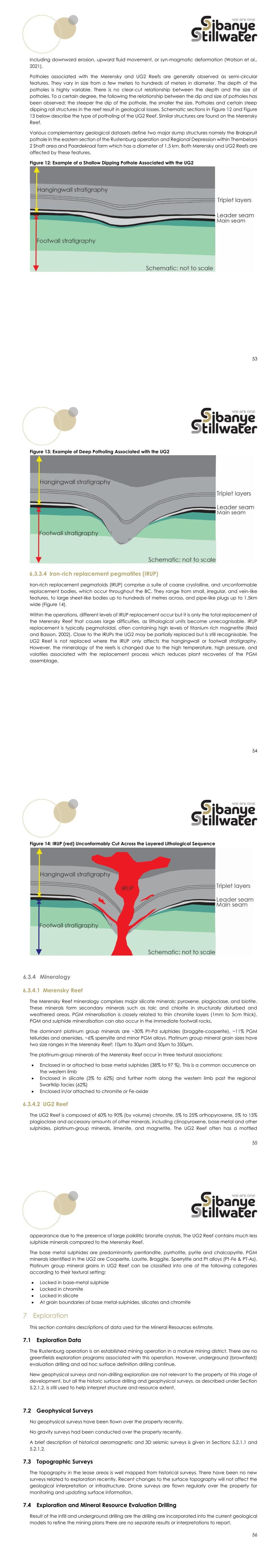 53 including downward erosion, upward fluid movement, or syn-magmatic deformation (Watson et al., 2021). Potholes associated with the Merensky and UG2 Reefs are generally observed as semi-circular features. They vary in size from a few meters to hundreds of meters in diameter. The depth of the potholes is highly variable. There is no clear-cut relationship between the depth and the size of potholes. To a certain degree, the following the relationship between the dip and size of potholes has been observed: the steeper the dip of the pothole, the smaller the size. Potholes and certain steep dipping roll structures in the reef result in geological losses. Schematic sections in Figure 12 and Figure 13 below describe the type of potholing of the UG2 Reef. Similar structures are found on the Merensky Reef. Various complementary geological datasets define two major slump structures namely the Brakspruit pothole in the eastern section of the Rustenburg operation and Regional Depression within Thembelani 2 Shaft area and Paardekraal farm which has a diameter of 1.5 km. Both Merensky and UG2 Reefs are affected by these features. Figure 12: Example of a Shallow Dipping Pothole Associated with the UG2 54 Figure 13: Example of Deep Potholing Associated with the UG2 6.3.3.4 Iron-rich replacement pegmatites (IRUP) Iron-rich replacement pegmatoids (IRUP) comprise a suite of coarse crystalline, and unconformable replacement bodies, which occur throughout the BC. They range from small, irregular, and vein-like features, to large sheet-like bodies up to hundreds of metres across, and pipe-like plugs up to 1.5km wide (Figure 14). Within the operations, different levels of IRUP replacement occur but it is only the total replacement of the Merensky Reef that causes large difficulties, as lithological units become unrecognisable. IRUP replacement is typically pegmatoidal, often containing high levels of titanium rich magnetite (Reid and Basson, 2002). Close to the IRUPs the UG2 may be partially replaced but is still recognisable. The UG2 Reef is not replaced where the IRUP only affects the hangingwall or footwall stratigraphy. However, the mineralogy of the reefs is changed due to the high temperature, high pressure, and volatiles associated with the replacement process which reduces plant recoveries of the PGM assemblage. 55 Figure 14: IRUP (red) Unconformably Cut Across the Layered Lithological Sequence 6.3.4 Mineralogy 6.3.4.1 Merensky Reef The Merensky Reef mineralogy comprises major silicate minerals: pyroxene, plagioclase, and biotite. These minerals form secondary minerals such as talc and chlorite in structurally disturbed and weathered areas. PGM mineralisation is closely related to thin chromite layers (1mm to 5cm thick). PGM and sulphide mineralisation can also occur in the immediate footwall rocks. The dominant platinum group minerals are ~30% Pt-Pd sulphides (braggite-cooperite), ~11% PGM tellurides and arsenides, ~6% sperrylite and minor PGM alloys. Platinum group mineral grain sizes have two size ranges in the Merensky Reef: 10µm to 30µm and 50µm to 350µm. The platinum-group minerals of the Merensky Reef occur in three textural associations: • Enclosed in or attached to base metal sulphides (38% to 97 %). This is a common occurrence on the western limb • Enclosed in silicate (3% to 62%) and further north along the western limb past the regional Swartklip facies (62%) • Enclosed in/or attached to chromite or Fe-oxide 6.3.4.2 UG2 Reef The UG2 Reef is composed of 60% to 90% (by volume) chromite, 5% to 25% orthopyroxene, 5% to 15% plagioclase and accessory amounts of other minerals, including clinopyroxene, base metal and other sulphides, platinum-group minerals, ilmenite, and magnetite. The UG2 Reef often has a mottled 56 appearance due to the presence of large poikilitic bronzite crystals. The UG2 Reef contains much less sulphide minerals compared to the Merensky Reef. The base metal sulphides are predominantly pentlandite, pyrrhotite, pyrite and chalcopyrite. PGM minerals identified in the UG2 are Cooperite, Laurite, Braggite, Sperrylite and Pt alloys (Pt-Fe & PT-As). Platinum group mineral grains in UG2 Reef can be classified into one of the following categories according to their textural setting: • Locked in base-metal sulphide • Locked in chromite • Locked in silicate • At grain boundaries of base metal-sulphides, silicates and chromite 7 Exploration This section contains descriptions of data used for the Mineral Resources estimate. 7.1 Exploration Data The Rustenburg operation is an established mining operation in a mature mining district. There are no greenfields exploration programs associated with this operation. However, underground (brownfield) evaluation drilling and ad hoc surface definition drilling continue. New geophysical surveys and non-drilling exploration are not relevant to the property at this stage of development, but all the historic surface drilling and geophysical surveys, as described under Section 5.2.1.2. is still used to help interpret structure and resource extent. 7.2 Geophysical Surveys No geophysical surveys have been flown over the property recently. No gravity surveys had been conducted over the property recently. A brief description of historical aeromagnetic and 3D seismic surveys is given in Sections 5.2.1.1 and 5.2.1.2. 7.3 Topographic Surveys The topography in the lease areas is well mapped from historical surveys. There have been no new surveys related to exploration recently. Recent changes to the surface topography will not affect the geological interpretation or infrastructure. Drone surveys are flown regularly over the property for monitoring and updating surface information. 7.4 Exploration and Mineral Resource Evaluation Drilling Result of the infill and underground drilling are the drilling are incorporated into the current geological models to refine the mining plans there are no separate results or interpretations to report.