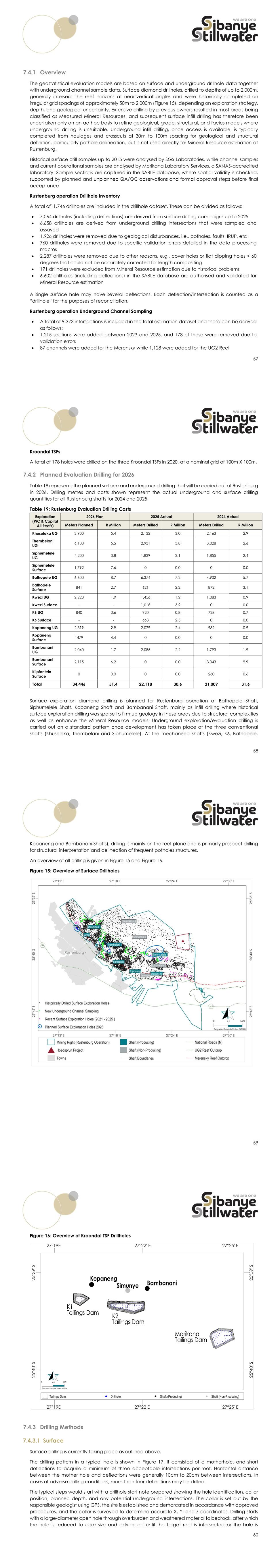 57 7.4.1 Overview The geostatistical evaluation models are based on surface and underground drillhole data together with underground channel sample data. Surface diamond drillholes, drilled to depths of up to 2,000m, generally intersect the reef horizons at near-vertical angles and were historically completed on irregular grid spacings of approximately 50m to 2,000m (Figure 15), depending on exploration strategy, depth, and geological uncertainty. Extensive drilling by previous owners resulted in most areas being classified as Measured Mineral Resources, and subsequent surface infill drilling has therefore been undertaken only on an ad hoc basis to refine geological, grade, structural, and facies models where underground drilling is unsuitable. Underground infill drilling, once access is available, is typically completed from haulages and crosscuts at 30m to 100m spacing for geological and structural definition, particularly pothole delineation, but is not used directly for Mineral Resource estimation at Rustenburg. Historical surface drill samples up to 2015 were analysed by SGS Laboratories, while channel samples and current operational samples are analysed by Marikana Laboratory Services, a SANAS-accredited laboratory. Sample sections are captured in the SABLE database, where spatial validity is checked, supported by planned and unplanned QA/QC observations and formal approval steps before final acceptance Rustenburg operation Drillhole Inventory A total of11,746 drillholes are included in the drillhole dataset. These can be divided as follows: • 7,064 drillholes (including deflections) are derived from surface drilling campaigns up to 2025 • 6,658 drillholes are derived from underground drilling intersections that were sampled and assayed • 1,926 drillholes were removed due to geological disturbances, i.e., potholes, faults, IRUP, etc • 760 drillholes were removed due to specific validation errors detailed in the data processing macros • 2,287 drillholes were removed due to other reasons, e.g., cover holes or flat dipping holes < 60 degrees that could not be accurately corrected for length compositing • 171 drillholes were excluded from Mineral Resource estimation due to historical problems • 6,602 drillholes (including deflections) in the SABLE database are authorised and validated for Mineral Resource estimation A single surface hole may have several deflections. Each deflection/intersection is counted as a “drillhole” for the purposes of reconciliation. Rustenburg operation Underground Channel Sampling • A total of 9,373 intersections is included in the total estimation dataset and these can be derived as follows: • 1,215 sections were added between 2023 and 2025, and 178 of these were removed due to validation errors • 87 channels were added for the Merensky while 1,128 were added for the UG2 Reef 58 Kroondal TSFs A total of 178 holes were drilled on the three Kroondal TSFs in 2020, at a nominal grid of 100m X 100m. 7.4.2 Planned Evaluation Drilling for 2026 Table 19 represents the planned surface and underground drilling that will be carried out at Rustenburg in 2026. Drilling metres and costs shown represent the actual underground and surface drilling quantities for all Rustenburg shafts for 2024 and 2025. Table 19: Rustenburg Evaluation Drilling Costs Exploration (WC & Capital All Reefs) 2026 Plan 2025 Actual 2024 Actual Meters Planned R Million Meters Drilled R Million Meters Drilled R Million Khuseleka UG 3,900 5.4 2,132 3.0 2,163 2.9 Thembelani UG 6,100 5.5 2,931 3.8 3,028 2.6 Siphumelele UG 4,200 3.8 1,839 2.1 1,855 2.4 Siphumelele Surface 1,792 7.6 0 0.0 0 0.0 Bathopele UG 6,600 8.7 6,374 7.2 4,902 5.7 Bathopele Surface 841 2.7 621 2.2 872 3.1 Kwezi UG 2,220 1.9 1,456 1.2 1,083 0.9 Kwezi Surface - - 1,018 3.2 0 0.0 K6 UG 840 0.6 920 0.8 728 0.7 K6 Surface - - 663 2.5 0 0.0 Kopaneng UG 2,319 2.9 2,079 2.4 982 0.9 Kopaneng Surface 1479 4.4 0 0.0 0 0.0 Bambanani UG 2,040 1.7 2,085 2.2 1,793 1.9 Bambanani Surface 2,115 6.2 0 0.0 3,343 9.9 Klipfontein Surface 0 0.0 0 0.0 260 0.6 Total 34,446 51.4 22,118 30.6 21,009 31.6 Surface exploration diamond drilling is planned for Rustenburg operation at Bathopele Shaft, Siphumelele Shaft, Kopaneng Shaft and Bambanani Shaft, mainly as infill drilling where historical surface exploration drilling was sparse to firm up geology in these areas due to structural complexities as well as enhance the Mineral Resource models. Underground exploration/evaluation drilling is carried out on a standard pattern once development has taken place at the three conventional shafts (Khuseleka, Thembelani and Siphumelele). At the mechanised shafts (Kwezi, K6, Bathopele, 59 Kopaneng and Bambanani Shafts), drilling is mainly on the reef plane and is primarily prospect drilling for structural interpretation and delineation of frequent potholes structures. An overview of all drilling is given in Figure 15 and Figure 16. Figure 15: Overview of Surface Drillholes 60 Figure 16: Overview of Kroondal TSF Drillholes 7.4.3 Drilling Methods 7.4.3.1 Surface Surface drilling is currently taking place as outlined above. The drilling pattern in a typical hole is shown in Figure 17. It consisted of a motherhole, and short deflections to acquire a minimum of three acceptable intersections per reef. Horizontal distance between the mother hole and deflections were generally 10cm to 20cm between intersections. In cases of adverse drilling conditions, more than four deflections may be drilled. The typical steps would start with a drillhole start note prepared showing the hole identification, collar position, planned depth, and any potential underground intersections. The collar is set out by the responsible geologist using GPS, the site is established and demarcated in accordance with approved procedures, and the collar is surveyed to determine accurate X, Y, and Z coordinates. Drilling starts with a large-diameter open hole through overburden and weathere