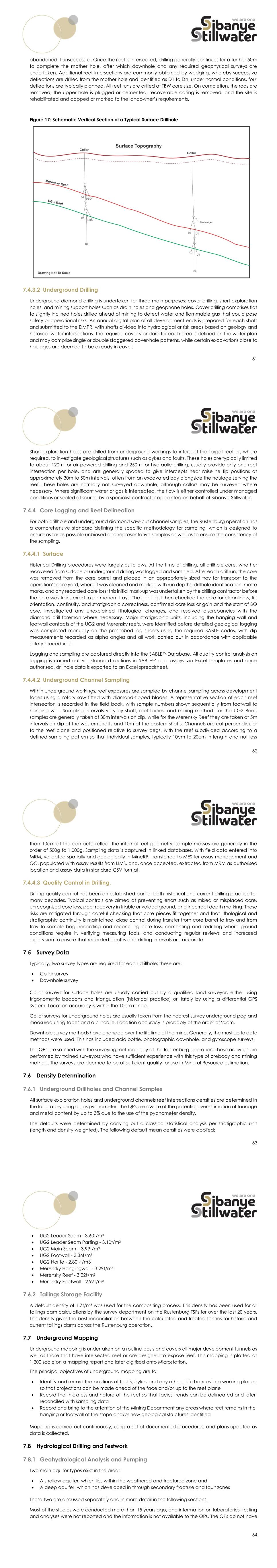 61 abandoned if unsuccessful. Once the reef is intersected, drilling generally continues for a further 50m to complete the mother hole, after which downhole and any required geophysical surveys are undertaken. Additional reef intersections are commonly obtained by wedging, whereby successive deflections are drilled from the mother hole and identified as D1 to Dn; under normal conditions, four deflections are typically planned. All reef runs are drilled at TBW core size. On completion, the rods are removed, the upper hole is plugged or cemented, recoverable casing is removed, and the site is rehabilitated and capped or marked to the landowner’s requirements. Figure 17: Schematic Vertical Section of a Typical Surface Drillhole 7.4.3.2 Underground Drilling Underground diamond drilling is undertaken for three main purposes: cover drilling, short exploration holes, and mining support holes such as drain holes and geophone holes. Cover drilling comprises flat to slightly inclined holes drilled ahead of mining to detect water and flammable gas that could pose safety or operational risks. An annual digital plan of all development ends is prepared for each shaft and submitted to the DMPR, with shafts divided into hydrological or risk areas based on geology and historical water intersections. The required cover standard for each area is defined on the water plan and may comprise single or double staggered cover-hole patterns, while certain excavations close to haulages are deemed to be already in cover. 62 Short exploration holes are drilled from underground workings to intersect the target reef or, where required, to investigate geological structures such as dykes and faults. These holes are typically limited to about 120m for air-powered drilling and 250m for hydraulic drilling, usually provide only one reef intersection per hole, and are generally spaced to give intercepts near raiseline tip positions at approximately 30m to 50m intervals, often from an excavated bay alongside the haulage serving the reef. These holes are normally not surveyed downhole, although collars may be surveyed where necessary. Where significant water or gas is intersected, the flow is either controlled under managed conditions or sealed at source by a specialist contractor appointed on behalf of Sibanye-Stillwater. 7.4.4 Core Logging and Reef Delineation For both drillhole and underground diamond saw-cut channel samples, the Rustenburg operation has a comprehensive standard defining the specific methodology for sampling, which is designed to ensure as far as possible unbiased and representative samples as well as to ensure the consistency of the sampling. 7.4.4.1 Surface Historical Drilling procedures were largely as follows. At the time of drilling, all drillhole core, whether recovered from surface or underground drilling was logged and sampled. After each drill run, the core was removed from the core barrel and placed in an appropriately sized tray for transport to the operation’s core yard, where it was cleaned and marked with run depths, drillhole identification, metre marks, and any recorded core loss; this initial mark-up was undertaken by the drilling contractor before the core was transferred to permanent trays. The geologist then checked the core for cleanliness, fit, orientation, continuity, and stratigraphic correctness, confirmed core loss or gain and the start of BQ core, investigated any unexplained lithological changes, and resolved discrepancies with the diamond drill foreman where necessary. Major stratigraphic units, including the hanging wall and footwall contacts of the UG2 and Merensky reefs, were identified before detailed geological logging was completed manually on the prescribed log sheets using the required SABLE codes, with dip measurements recorded as alpha angles and all work carried out in accordance with applicable safety procedures. Logging and sampling are captured directly into the SABLETM Database. All quality control analysis on logging is carried out via standard routines in SABLETM and assays via Excel templates and once authorised, drillhole data is exported to an Excel spreadsheet. 7.4.4.2 Underground Channel Sampling Within underground workings, reef exposures are sampled by channel sampling across development faces using a rotary saw fitted with diamond-tipped blades. A representative section of each reef intersection is recorded in the field book, with sample numbers shown sequentially from footwall to hanging wall. Sampling intervals vary by shaft, reef facies, and mining method: for the UG2 Reef, samples are generally taken at 30m intervals on dip, while for the Merensky Reef they are taken at 5m intervals on dip at the western shafts and 10m at the eastern shafts. Channels are cut perpendicular to the reef plane and positioned relative to survey pegs, with the reef subdivided according to a defined sampling pattern so that individual samples, typically 10cm to 20cm in length and not less 63 than 10cm at the contacts, reflect the internal reef geometry; sample masses are generally in the order of 500g to 1,000g. Sampling data is captured in linked databases, with field data entered into MRM, validated spatially and geologically in MineRP, transferred to MES for assay management and QC, populated with assay results from LIMS, and, once accepted, extracted from MRM as authorised location and assay data in standard CSV format. 7.4.4.3 Quality Control in Drilling. Drilling quality control has been an established part of both historical and current drilling practice for many decades. Typical controls are aimed at preventing errors such as mixed or misplaced core, unrecognised core loss, poor recovery in friable or voided ground, and incorrect depth marking. These risks are mitigated through careful checking that core pieces fit together and that lithological and stratigraphic continuity is maintained, close control during transfer from core barrel to tray and from tray to sa