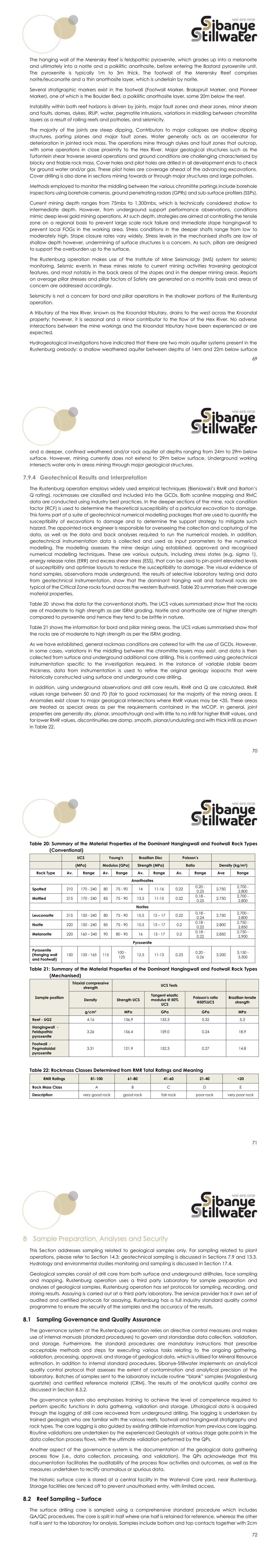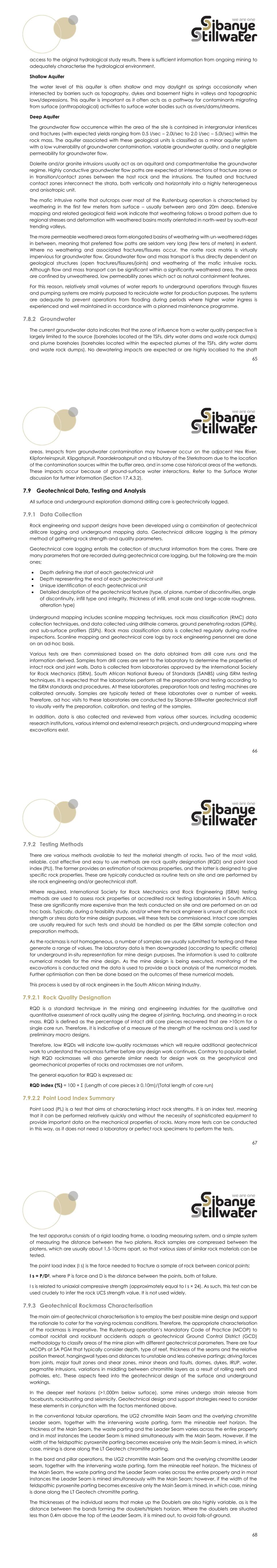 65 access to the original hydrological study results. There is sufficient information from ongoing mining to adequately characterise the hydrological environment. Shallow Aquifer The water level of this aquifer is often shallow and may daylight as springs occasionally when intersected by barriers such as topography, dykes and basement highs in valleys and topographic lows/depressions. This aquifer is important as it often acts as a pathway for contaminants migrating from surface (anthropological) activities to surface water bodies such as rivers/dams/streams. Deep Aquifer The groundwater flow occurrence within the area of the site is contained in intergranular interstices and fractures (with expected yields ranging from 0.5 l/sec – 2.0l/sec to 2.0 l/sec – 5.0l/sec) within the rock mass. The aquifer associated with these geological units is classified as a minor aquifer system with a low vulnerability of groundwater contamination, variable groundwater quality, and a negligible permeability for groundwater flow. Dolerite and/or granite intrusions usually act as an aquitard and compartmentalise the groundwater regime. Highly conductive groundwater flow paths are expected at intersections of fracture zones or in transition/contact zones between the host rock and the intrusions. The faulted and fractured contact zones interconnect the strata, both vertically and horizontally into a highly heterogeneous and anisotropic unit. The mafic intrusive norite that outcrops over most of the Rustenburg operation is characterised by weathering in the first few meters from surface – usually between zero and 20m deep. Extensive mapping and related geological field work indicate that weathering follows a broad pattern due to regional stresses and deformation with weathered basins mostly orientated in north-west by south-east trending valleys. The more permeable weathered areas form elongated basins of weathering with un-weathered ridges in between, meaning that preferred flow paths are seldom very long (few tens of meters) in extent. Where no weathering and associated fractures/fissures occur, the norite rock matrix is virtually impervious for groundwater flow. Groundwater flow and mass transport is thus directly dependent on geological structures (open fractures/fissures/joints) and weathering of the mafic intrusive rocks. Although flow and mass transport can be significant within a significantly weathered area, the areas are confined by unweathered, low permeability zones which act as natural containment features. For this reason, relatively small volumes of water reports to underground operations through fissures and pumping systems are mainly purposed to recirculate water for production purposes. The systems are adequate to prevent operations from flooding during periods where higher water ingress is experienced and well maintained in accordance with a planned maintenance programme. 7.8.2 Groundwater The current groundwater data indicates that the zone of influence from a water quality perspective is largely limited to the source (boreholes located at the TSFs, dirty water dams and waste rock dumps) and plume boreholes (boreholes located within the expected plumes of the TSFs, dirty water dams and waste rock dumps). No dewatering impacts are expected or are highly localised to the shaft 66 areas. Impacts from groundwater contamination may however occur on the adjacent Hex River, Klipfonteinspruit, Klipgatspruit, Paardekraalspruit and a tributary of the Sterkstroom due to the location of the contamination sources within the buffer area, and in some case historical areas of the wetlands. These impacts occur because of ground-surface water interactions. Refer to the Surface Water discussion for further information (Section 17.4.3.2). 7.9 Geotechnical Data, Testing and Analysis All surface and underground exploration diamond drilling core is geotechnically logged. 7.9.1 Data Collection Rock engineering and support designs have been developed using a combination of geotechnical drillcore logging and underground mapping data. Geotechnical drillcore logging is the primary method of gathering rock strength and quality parameters. Geotechnical core logging entails the collection of structural information from the cores. There are many parameters that are recorded during geotechnical core logging, but the following are the main ones; • Depth defining the start of each geotechnical unit • Depth representing the end of each geotechnical unit • Unique identification of each geotechnical unit • Detailed description of the geotechnical feature (type, of plane, number of discontinuities, angle of discontinuity, infill type and integrity, thickness of infill, small scale and large-scale roughness, alteration type) Underground mapping includes scanline mapping techniques, rock mass classification (RMC) data collection techniques, and data collected using drillhole cameras, ground penetrating radars (GPRs), and sub-surface profilers (SSPs). Rock mass classification data is collected regularly during routine inspections. Scanline mapping and geotechnical core logs by rock engineering personnel are done on an ad-hoc basis. Various tests are then commissioned based on the data obtained from drill core runs and the information derived. Samples from drill cores are sent to the laboratory to determine the properties of intact rock and joint walls. Data is collected from laboratories approved by the International Society for Rock Mechanics (ISRM), South African National Bureau of Standards (SANBS) using ISRM testing techniques. It is expected that the laboratories perform all the preparation and testing according to the ISRM standards and procedures. At these laboratories, preparation tools and testing machines are calibrated annually. Samples are typically tested at these laboratories over a number of weeks. Therefore, ad hoc visits to these laboratories are conducted by Sibanye-Stillwater geotechnical staff to vi