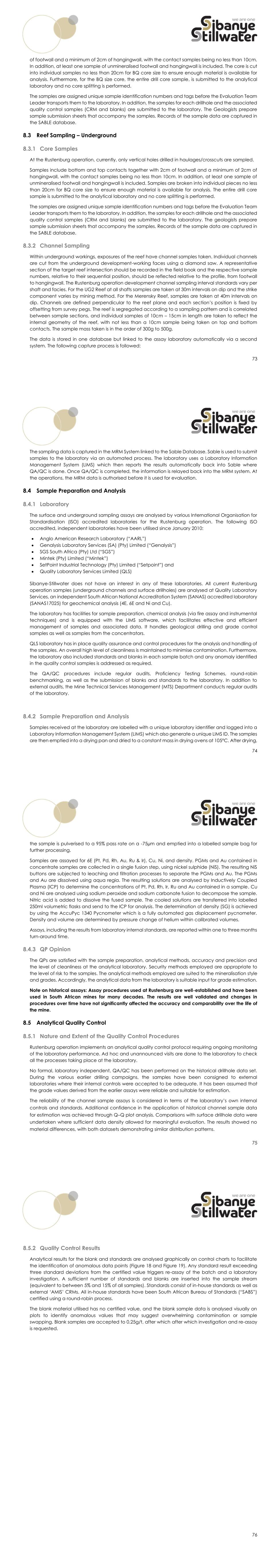 73 of footwall and a minimum of 2cm of hangingwall, with the contact samples being no less than 10cm. In addition, at least one sample of unmineralised footwall and hangingwall is included. The core is cut into individual samples no less than 20cm for BQ core size to ensure enough material is available for analysis. Furthermore, for the BQ size core, the entire drill core sample, is submitted to the analytical laboratory and no core splitting is performed. The samples are assigned unique sample identification numbers and tags before the Evaluation Team Leader transports them to the laboratory. In addition, the samples for each drillhole and the associated quality control samples (CRM and blanks) are submitted to the laboratory. The Geologists prepare sample submission sheets that accompany the samples. Records of the sample data are captured in the SABLE database. 8.3 Reef Sampling – Underground 8.3.1 Core Samples At the Rustenburg operation, currently, only vertical holes drilled in haulages/crosscuts are sampled. Samples include bottom and top contacts together with 2cm of footwall and a minimum of 2cm of hangingwall, with the contact samples being no less than 10cm. In addition, at least one sample of unmineralised footwall and hangingwall is included. Samples are broken into individual pieces no less than 20cm for BQ core size to ensure enough material is available for analysis. The entire drill core sample is submitted to the analytical laboratory and no core splitting is performed. The samples are assigned unique sample identification numbers and tags before the Evaluation Team Leader transports them to the laboratory. In addition, the samples for each drillhole and the associated quality control samples (CRM and blanks) are submitted to the laboratory. The geologists prepare sample submission sheets that accompany the samples. Records of the sample data are captured in the SABLE database. 8.3.2 Channel Sampling Within underground workings, exposures of the reef have channel samples taken. Individual channels are cut from the underground development-working faces using a diamond saw. A representative section of the target reef intersection should be recorded in the field book and the respective sample numbers, relative to their sequential position, should be reflected relative to the profile, from footwall to hangingwall. The Rustenburg operation development channel sampling interval standards vary per shaft and facies. For the UG2 Reef at all shafts samples are taken at 30m intervals on dip and the strike component varies by mining method. For the Merensky Reef, samples are taken at 40m intervals on dip. Channels are defined perpendicular to the reef plane and each section’s position is fixed by offsetting from survey pegs. The reef is segregated according to a sampling pattern and is correlated between sample sections, and individual samples of 10cm – 15cm in length are taken to reflect the internal geometry of the reef, with not less than a 10cm sample being taken on top and bottom contacts. The sample mass taken is in the order of 300g to 500g. The data is stored in one database but linked to the assay laboratory automatically via a second system. The following capture process is followed: 74 The sampling data is captured in the MRM System linked to the Sable Database. Sable is used to submit samples to the laboratory via an automated process. The laboratory uses a Laboratory Information Management System (LIMS) which then reports the results automatically back into Sable where QA/QC is done. Once QA/QC is completed, the information is relayed back into the MRM system. At the operations, the MRM data is authorised before it is used for evaluation. 8.4 Sample Preparation and Analysis 8.4.1 Laboratory The surface and underground sampling assays are analysed by various International Organisation for Standardisation (ISO) accredited laboratories for the Rustenburg operation. The following ISO accredited, independent laboratories have been utilised since January 2010: • Anglo American Research Laboratory (“AARL”) • Genalysis Laboratory Services (SA) (Pty) Limited (“Genalysis”) • SGS South Africa (Pty) Ltd (“SGS”) • Mintek (Pty) Limited (“Mintek”) • SetPoint Industrial Technology (Pty) Limited (“Setpoint”) and • Quality Laboratory Services Limited (QLS) Sibanye-Stillwater does not have an interest in any of these laboratories. All current Rustenburg operation samples (underground channels and surface drillholes) are analysed at Quality Laboratory Services, an independent South African National Accreditation System (SANAS) accredited laboratory (SANAS17025) for geochemical analysis (4E, 6E and Ni and Cu). The laboratory has facilities for sample preparation, chemical analysis (via fire assay and instrumental techniques) and is equipped with the LIMS software, which facilitates effective and efficient management of samples and associated data. It handles geological drilling and grade control samples as well as samples from the concentrators. QLS laboratory has in place quality assurance and control procedures for the analysis and handling of the samples. An overall high level of cleanliness is maintained to minimise contamination. Furthermore, the laboratory also included standards and blanks in each sample batch and any anomaly identified in the quality control samples is addressed as required. The QA/QC procedures include regular audits, Proficiency Testing Schemes, round-robin benchmarking, as well as the submission of blanks and standards to the laboratory. In addition to external audits, the Mine Technical Services Management (MTS) Department conducts regular audits of the laboratory. 8.4.2 Sample Preparation and Analysis Samples received at the laboratory are labelled with a unique laboratory identifier and logged into a Laboratory Information Management System (LIMS) which also generate a unique LIMS ID. The samples are then emptied into a d
