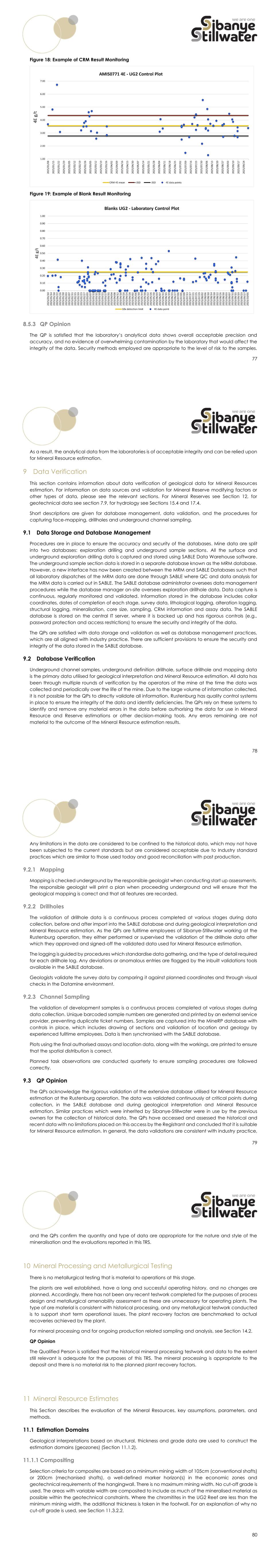 77 Figure 18: Example of CRM Result Monitoring Figure 19: Example of Blank Result Monitoring 8.5.3 QP Opinion The QP is satisfied that the laboratory’s analytical data shows overall acceptable precision and accuracy, and no evidence of overwhelming contamination by the laboratory that would affect the integrity of the data. Security methods employed are appropriate to the level of risk to the samples. 78 As a result, the analytical data from the laboratories is of acceptable integrity and can be relied upon for Mineral Resource estimation. 9 Data Verification This section contains information about data verification of geological data for Mineral Resources estimation. For information on data sources and validation for Mineral Reserve modifying factors or other types of data, please see the relevant sections. For Mineral Reserves see Section 12, for geotechnical data see section 7.9, for hydrology see Sections 15.4 and 17.4. Short descriptions are given for database management, data validation, and the procedures for capturing face-mapping, drillholes and underground channel sampling. 9.1 Data Storage and Database Management Procedures are in place to ensure the accuracy and security of the databases. Mine data are split into two databases: exploration drilling and underground sample sections. All the surface and underground exploration drilling data is captured and stored using SABLE Data Warehouse software. The underground sample section data is stored in a separate database known as the MRM database. However, a new interface has now been created between the MRM and SABLE Databases such that all laboratory dispatches of the MRM data are done through SABLE where QC and data analysis for the MRM data is carried out in SABLE. The SABLE database administrator oversees data management procedures while the database manager on-site oversees exploration drillhole data. Data capture is continuous, regularly monitored and validated. Information stored in the database includes collar coordinates, dates of completion of each stage, survey data, lithological logging, alteration logging, structural logging, mineralisation, core size, sampling, CRM information and assay data. The SABLE database is stored on the central IT server, where it is backed up and has rigorous controls (e.g., password protection and access restrictions) to ensure the security and integrity of the data. The QPs are satisfied with data storage and validation as well as database management practices, which are all aligned with industry practice. There are sufficient provisions to ensure the security and integrity of the data stored in the SABLE database. 9.2 Database Verification Underground channel samples, underground definition drillhole, surface drillhole and mapping data is the primary data utilised for geological interpretation and Mineral Resource estimation. All data has been through multiple rounds of verification by the operators of the mine at the time the data was collected and periodically over the life of the mine. Due to the large volume of information collected, it is not possible for the QPs to directly validate all information. Rustenburg has quality control systems in place to ensure the integrity of the data and identify deficiencies. The QPs rely on these systems to identify and remove any material errors in the data before authorising the data for use in Mineral Resource and Reserve estimations or other decision-making tools. Any errors remaining are not material to the outcome of the Mineral Resource estimation results. 79 Any limitations in the data are considered to be confined to the historical data, which may not have been subjected to the current standards but are considered acceptable due to Industry standard practices which are similar to those used today and good reconciliation with past production. 9.2.1 Mapping Mapping is checked underground by the responsible geologist when conducting start up assessments. The responsible geologist will print a plan when proceeding underground and will ensure that the geological mapping is correct and that all features are recorded. 9.2.2 Drillholes The validation of drillhole data is a continuous process completed at various stages during data collection, before and after import into the SABLE database and during geological interpretation and Mineral Resource estimation. As the QPs are fulltime employees of Sibanye-Stillwater working at the Rustenburg operation, they either performed or supervised the validation of the drillhole data after which they approved and signed-off the validated data used for Mineral Resource estimation. The logging is guided by procedures which standardise data gathering, and the type of detail required for each drillhole log. Any deviations or anomalous entries are flagged by the inbuilt validations tools available in the SABLE database. Geologists validate the survey data by comparing it against planned coordinates and through visual checks in the Datamine environment. 9.2.3 Channel Sampling The validation of development samples is a continuous process completed at various stages during data collection. Unique barcoded sample numbers are generated and printed by an external service provider, preventing duplicate ticket numbers. Samples are captured into the MineRP database with controls in place, which includes drawing of sections and validation of location and geology by experienced fulltime employees. Data is then synchronised with the SABLE database. Plots using the final authorised assays and location data, along with the workings, are printed to ensure that the spatial distribution is correct. Planned task observations are conducted quarterly to ensure sampling procedures are followed correctly. 9.3 QP Opinion The QPs acknowledge the rigorous validation of the extensive database utilised for Mineral Resource estimation at the Rustenburg operation. The data was validated continuously at critical points during collection, in the