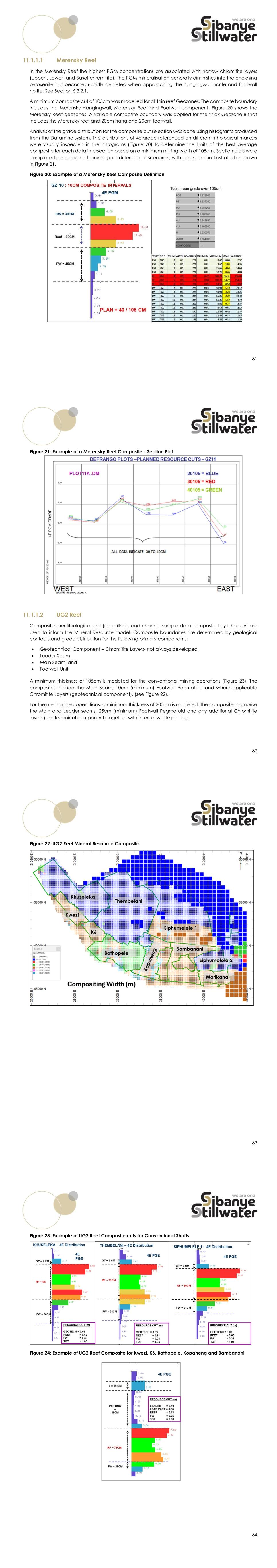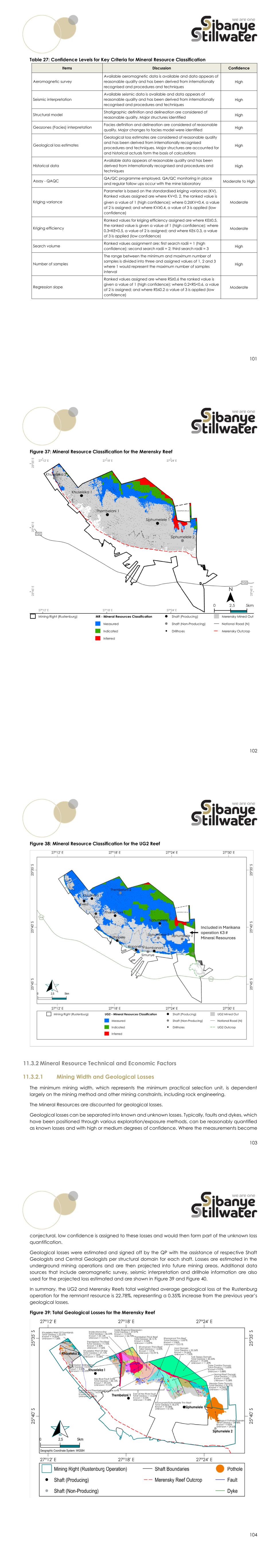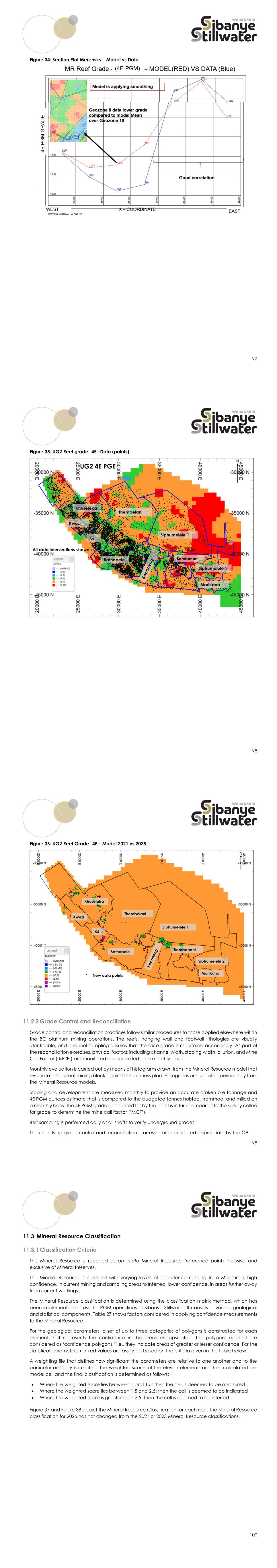 97 Figure 34: Section Plot Merensky - Model vs Data 98 Figure 35: UG2 Reef grade -4E –Data (points) 99 Figure 36: UG2 Reef Grade -4E – Model 2021 vs 2025 11.2.2 Grade Control and Reconciliation Grade control and reconciliation practices follow similar procedures to those applied elsewhere within the BC platinum mining operations. The reefs, hanging wall and footwall lithologies are visually identifiable, and channel sampling ensures that the face grade is monitored accordingly. As part of the reconciliation exercises, physical factors, including channel width, stoping width, dilution, and Mine Call Factor (‘MCF’) are monitored and recorded on a monthly basis. Monthly evaluation is carried out by means of histograms drawn from the Mineral Resource model that evaluate the current mining block against the business plan. Histograms are updated periodically from the Mineral Resource models. Stoping and development are measured monthly to provide an accurate broken ore tonnage and 4E PGM ounces estimate that is compared to the budgeted tonnes hoisted, trammed, and milled on a monthly basis. The 4E PGM grade accounted for by the plant is in turn compared to the survey called for grade to determine the mine call factor (‘MCF’). Belt sampling is performed daily at all shafts to verify underground grades. The underlying grade control and reconciliation processes are considered appropriate by the QP. 100 11.3 Mineral Resource Classification 11.3.1 Classification Criteria The Mineral Resource is reported as an in-situ Mineral Resource (reference point) inclusive and exclusive of Mineral Reserves. The Mineral Resource is classified with varying levels of confidence ranging from Measured, high confidence, in current mining and sampling areas to Inferred, lower confidence, in areas further away from current workings. The Mineral Resource classification is determined using the classification matrix method, which has been implemented across the PGM operations of Sibanye-Stillwater. It consists of various geological and statistical components. Table 27 shows factors considered in applying confidence measurements to the Mineral Resource. For the geological parameters, a set of up to three categories of polygons is constructed for each element that represents the confidence in the areas encapsulated. The polygons applied are considered as ‘confidence polygons,’ i.e., they indicate areas of greater or lesser confidence. For the statistical parameters, ranked values are assigned based on the criteria given in the table below. A weighting file that defines how significant the parameters are relative to one another and to the particular orebody is created. The weighted scores of the eleven elements are then calculated per model cell and the final classification is determined as follows: • Where the weighted score lies between 1 and 1.5: then the cell is deemed to be measured • Where the weighted score lies between 1.5 and 2.5: then the cell is deemed to be indicated • Where the weighted score is greater than 2.5: then the cell is deemed to be inferred Figure 37 and Figure 38 depict the Mineral Resource Classification for each reef. The Mineral Resource classification for 2025 has not changed from the 2021 or 2023 Mineral Resource classifications.