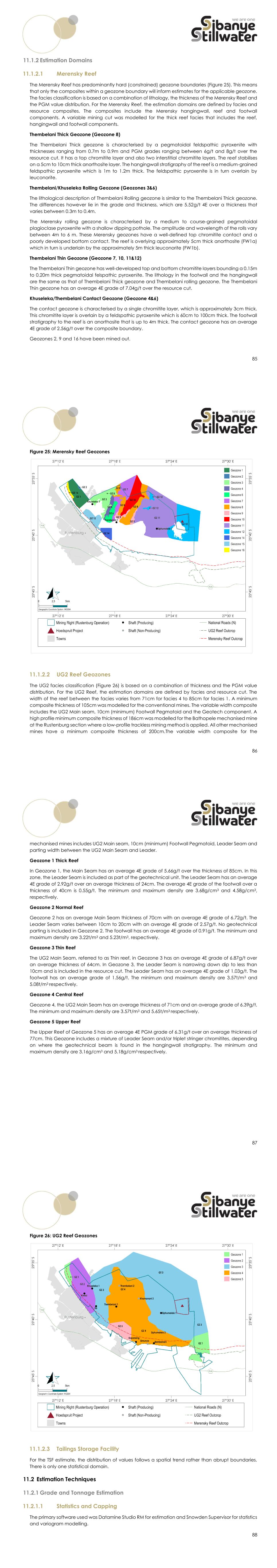 85 11.1.2 Estimation Domains 11.1.2.1 Merensky Reef The Merensky Reef has predominantly hard (constrained) geozone boundaries (Figure 25). This means that only the composites within a geozone boundary will inform estimates for the applicable geozone. The facies classification is based on a combination of lithology, the thickness of the Merensky Reef and the PGM value distribution. For the Merensky Reef, the estimation domains are defined by facies and resource composites. The composites include the Merensky hangingwall, reef and footwall components. A variable mining cut was modelled for the thick reef facies that includes the reef, hangingwall and footwall components. Thembelani Thick Geozone (Geozone 8) The Thembelani Thick geozone is characterised by a pegmatoidal feldspathic pyroxenite with thicknesses ranging from 0.7m to 0.9m and PGM grades ranging between 6g/t and 8g/t over the resource cut. It has a top chromitite layer and also two interstitial chromitite layers. The reef stabilises on a 5cm to 10cm thick anorthosite layer. The hangingwall stratigraphy of the reef is a medium-grained feldspathic pyroxenite which is 1m to 1.2m thick. The feldspathic pyroxenite is in turn overlain by leuconorite. Thembelani/Khuseleka Rolling Geozone (Geozones 3&6) The lithological description of Thembelani Rolling geozone is similar to the Thembelani Thick geozone. The differences however lie in the grade and thickness, which are 5.52g/t 4E over a thickness that varies between 0.3m to 0.4m. The Merensky rolling geozone is characterised by a medium to course-grained pegmatoidal plagioclase pyroxenite with a shallow dipping pothole. The amplitude and wavelength of the rolls vary between 4m to 6 m. These Merensky geozones have a well-defined top chromitite contact and a poorly developed bottom contact. The reef is overlying approximately 5cm thick anorthosite (FW1a) which in turn is underlain by the approximately 5m thick leuconorite (FW1b). Thembelani Thin Geozone (Geozone 7, 10, 11&12) The Thembelani Thin geozone has well-developed top and bottom chromitite layers bounding a 0.15m to 0.20m thick pegmatoidal felspathic pyroxenite. The lithology in the footwall and the hangingwall are the same as that of Thembelani Thick geozone and Thembelani rolling geozone. The Thembelani Thin geozone has an average 4E grade of 7.04g/t over the resource cut. Khuseleka/Thembelani Contact Geozone (Geozone 4&6) The contact geozone is characterised by a single chromitite layer, which is approximately 3cm thick. This chromitite layer is overlain by a feldspathic pyroxenite which is 60cm to 100cm thick. The footwall stratigraphy to the reef is an anorthosite that is up to 4m thick. The contact geozone has an average 4E grade of 2.56g/t over the composite boundary. Geozones 2, 9 and 16 have been mined out. 86 Figure 25: Merensky Reef Geozones 11.1.2.2 UG2 Reef Geozones The UG2 facies classification (Figure 26) is based on a combination of thickness and the PGM value distribution. For the UG2 Reef, the estimation domains are defined by facies and resource cut. The width of the reef between the facies varies from 71cm for facies 4 to 85cm for facies 1. A minimum composite thickness of 105cm was modelled for the conventional mines. The variable width composite includes the UG2 Main seam, 10cm (minimum) Footwall Pegmatoid and the Geotech component. A high profile minimum composite thickness of 186cm was modelled for the Bathopele mechanised mine at the Rustenburg section where a low-profile trackless mining method is applied. All other mechanised mines have a minimum composite thickness of 200cm.The variable width composite for the 87 mechanised mines includes UG2 Main seam, 10cm (minimum) Footwall Pegmatoid, Leader Seam and parting width between the UG2 Main Seam and Leader. Geozone 1 Thick Reef In Geozone 1, the Main Seam has an average 4E grade of 5.66g/t over the thickness of 85cm. In this zone, the Leader Seam is included as part of the geotechnical unit. The Leader Seam has an average 4E grade of 2.92g/t over an average thickness of 24cm. The average 4E grade of the footwall over a thickness of 40cm is 0.55g/t. The minimum and maximum density are 3.68g/cm3 and 4.58g/cm3, respectively. Geozone 2 Normal Reef Geozone 2 has an average Main Seam thickness of 70cm with an average 4E grade of 6.72g/t. The Leader Seam varies between 10cm to 20cm with an average 4E grade of 2.57g/t. No geotechnical parting is included in Geozone 2. The footwall has an average 4E grade of 0.91g/t. The minimum and maximum density are 3.22t/m3 and 5.23t/m3, respectively. Geozone 3 Thin Reef The UG2 Main Seam, referred to as Thin reef, in Geozone 3 has an average 4E grade of 6.87g/t over an average thickness of 64cm. In Geozone 3, the Leader Seam is narrowing down dip to less than 10cm and is included in the resource cut. The Leader Seam has an average 4E grade of 1.03g/t. The footwall has an average grade of 1.56g/t. The minimum and maximum density are 3.57t/m3 and 5.08t/m3 respectively. Geozone 4 Central Reef Geozone 4, the UG2 Main Seam has an average thickness of 71cm and an average grade of 6.39g/t. The minimum and maximum density are 3.57t/m3 and 5.65t/m3 respectively. Geozone 5 Upper Reef The Upper Reef of Geozone 5 has an average 4E PGM grade of 6.31g/t over an average thickness of 77cm. This Geozone includes a mixture of Leader Seam and/or triplet stringer chromitites, depending on where the geotechnical beam is found in the hangingwall stratigraphy. The minimum and maximum density are 3.16g/cm3 and 5.18g/cm3 respectively. 88 Figure 26: UG2 Reef Geozones 11.1.2.3 Tailings Storage Facility For the TSF estimate, the distribution of values follows a spatial trend rather than abrupt boundaries. There is only one statistical domain. 11.2 Estimation Techniques 11.2.1 Grade and Tonnage Estimation 11.2.1.1 Statistics and Capping The primary software used was Datamine Studio RM for estimation and Snowden Supervisor for statistics and variogram mode