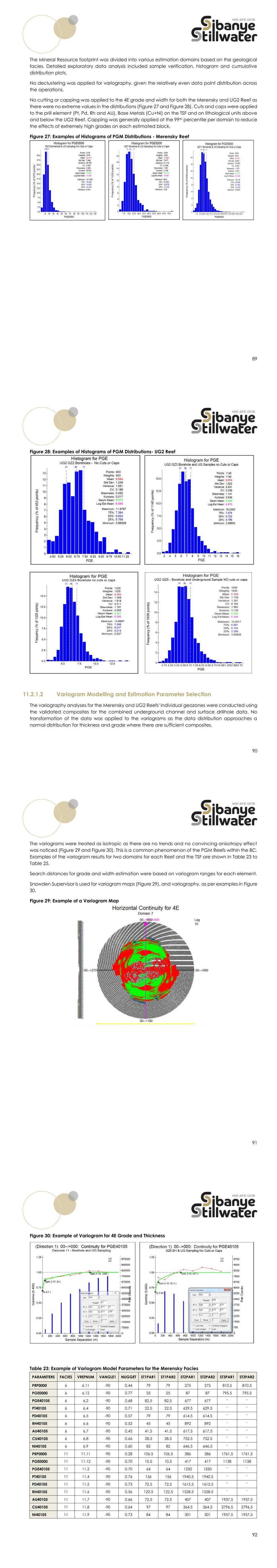 89 The Mineral Resource footprint was divided into various estimation domains based on the geological facies. Detailed exploratory data analysis included sample verification, histogram and cumulative distribution plots. No declustering was applied for variography, given the relatively even data point distribution across the operations. No cutting or capping was applied to the 4E grade and width for both the Merensky and UG2 Reef as there were no extreme values in the distributions (Figure 27 and Figure 28). Cuts and caps were applied to the prill element (Pt, Pd, Rh and AU), Base Metals (Cu+Ni) on the TSF and on lithological units above and below the UG2 Reef. Capping was generally applied at the 99th percentile per domain to reduce the effects of extremely high grades on each estimated block. Figure 27: Examples of Histograms of PGM Distributions - Merensky Reef 90 Figure 28: Examples of Histograms of PGM Distributions- UG2 Reef 11.2.1.2 Variogram Modelling and Estimation Parameter Selection The variography analyses for the Merensky and UG2 Reefs' individual geozones were conducted using the validated composites for the combined underground channel and surface drillhole data. No transformation of the data was applied to the variograms as the data distribution approaches a normal distribution for thickness and grade where there are sufficient composites. 91 The variograms were treated as isotropic as there are no trends and no convincing anisotropy effect was noticed (Figure 29 and Figure 30). This is a common phenomenon of the PGM Reefs within the BC. Examples of the variogram results for two domains for each Reef and the TSF are shown in Table 23 to Table 25. Search distances for grade and width estimation were based on variogram ranges for each element. Snowden Supervisor is used for variogram maps (Figure 29), and variography, as per examples in Figure 30. Figure 29: Example of a Variogram Map 92 Figure 30: Example of Variogram for 4E Grade and Thickness Table 23: Example of Variogram Model Parameters for the Merensky Facies PARAMETERS FACIES VREFNUM VANGLE1 NUGGET ST1PAR1 ST1PAR2 ST2PAR1 ST2PAR2 ST3PAR1 ST3PAR2 PRP0000 6 6.11 -90 0.44 79 79 275 275 810.5 810.5 PGE0000 6 6.12 -90 0.77 25 25 87 87 795.5 795.5 PGE40105 6 6.2 -90 0.68 82.5 82.5 677 677 - - PT40105 6 6.4 -90 0.71 22.5 22.5 629.5 629.5 - - PD40105 6 6.5 -90 0.57 79 79 614.5 614.5 - - RH40105 6 6.6 -90 0.52 45 45 892 892 - - AU40105 6 6.7 -90 0.45 41.5 41.5 617.5 617.5 - - CU40105 6 6.8 -90 0.66 28.5 28.5 752.5 752.5 - - NI40105 6 6.9 -90 0.60 82 82 646.5 646.5 - - PRP0000 11 11.11 -90 0.28 106.5 106.5 386 386 1761.5 1761.5 PGE0000 11 11.12 -90 0.70 10.5 10.5 417 417 1138 1138 PGE40105 11 11.2 -90 0.70 64 64 1250 1250 - - PT40105 11 11.4 -90 0.76 156 156 1940.5 1940.5 - - PD40105 11 11.5 -90 0.73 72.5 72.5 1615.5 1615.5 - - RH40105 11 11.6 -90 0.56 122.5 122.5 1528.5 1528.5 - - AU40105 11 11.7 -90 0.66 72.5 72.5 407 407 1937.5 1937.5 CU40105 11 11.8 -90 0.64 97 97 364.5 364.5 2796.5 2796.5 NI40105 11 11.9 -90 0.73 84 84 301 301 1957.5 1957.5