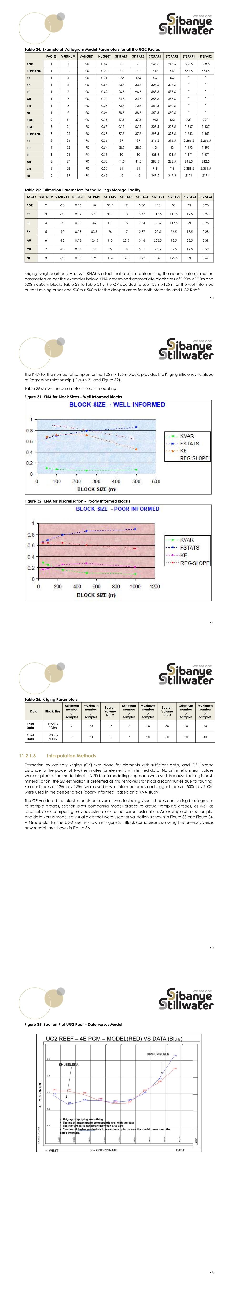 93 Table 24: Example of Variogram Model Parameters for all the UG2 Facies FACIES VREFNUM VANGLE1 NUGGET ST1PAR1 ST1PAR2 ST2PAR1 ST2PAR2 ST3PAR1 ST3PAR2 PGE 1 1 -90 0.59 8 8 245.5 245.5 808.5 808.5 PERPLENG 1 2 -90 0.20 61 61 349 349 654.5 654.5 PT 1 4 -90 0.71 133 133 467 467 - - PD 1 5 -90 0.55 33.5 33.5 325.5 325.5 - - RH 1 6 -90 0.62 96.5 96.5 583.5 583.5 - - AU 1 7 -90 0.47 34.5 34.5 355.5 355.5 - - CU 1 8 -90 0.23 70.5 70.5 650.5 650.5 - - NI 1 9 -90 0.06 88.5 88.5 650.5 650.5 - - PGE 2 11 -90 0.45 37.5 37.5 402 402 729 729 PGE 3 21 -90 0.57 0.15 0.15 207.5 207.5 1,837 1,837 PERPLENG 3 22 -90 0.38 37.5 37.5 298.5 398.5 1,553 1,553 PT 3 24 -90 0.36 39 39 316.5 316.5 2,266.5 2,266.5 PD 3 25 -90 0.54 28.5 28.5 43 43 1,393 1,393 RH 3 26 -90 0.31 80 80 423.5 423.5 1,871 1,871 AU 3 27 -90 0.50 41.5 41.5 282.5 282.5 812.5 812.5 CU 3 28 -90 0.30 64 64 719 719 2,381.5 2,381.5 NI 3 29 -90 0.42 46 46 347.5 347.5 2171 2171 Table 25: Estimation Parameters for the Tailings Storage Facility ASSAY VREFNUM VANGLE1 NUGGET ST1PAR1 ST1PAR2 ST1PAR3 ST1PAR4 ST2PAR1 ST2PAR2 ST2PAR3 ST2PAR4 PGE 2 -90 0.13 40 31.5 17 0.38 118 80 21 0.23 PT 3 -90 0.12 59.5 38.5 18 0.47 117.5 115.5 19.5 0.24 PD 4 -90 0.10 45 111 18 0.64 88.5 117.5 21 0.26 RH 5 -90 0.13 83.5 76 17 0.37 90.5 76.5 18.5 0.28 AU 6 -90 0.13 124.5 113 28.5 0.48 233.5 18.5 33.5 0.39 CU 7 -90 0.13 34 75 18 0.35 94.5 82.5 19.5 0.52 NI 8 -90 0.13 59 114 19.5 0.23 132 122.5 21 0.67 Kriging Neighbourhood Analysis (KNA) is a tool that assists in determining the appropriate estimation parameters as per the examples below. KNA determined appropriate block sizes of 125m x 125m and 500m x 500m blocks(Table 23 to Table 26). The QP decided to use 125m x125m for the well-informed current mining areas and 500m x 500m for the deeper areas for both Merensky and UG2 Reefs. 94 The KNA for the number of samples for the 125m x 125m blocks provides the Kriging Efficiency vs. Slope of Regression relationship ((Figure 31 and Figure 32). Table 26 shows the parameters used in modelling. Figure 31: KNA for Block Sizes – Well Informed Blocks Figure 32: KNA for Discretisation – Poorly Informed Blocks 95 Table 26: Kriging Parameters Data Block Size Minimum number of samples Maximum number of samples Search Volume No. 2 Minimum number of samples Maximum number of samples Search Volume No. 3 Minimum number of samples Maximum number of samples Point Data 125m x 125m 7 20 1.5 7 20 50 20 40 Point Data 500m x 500m 7 20 1.5 7 20 50 20 40 11.2.1.3 Interpolation Methods Estimation by ordinary kriging (OK) was done for elements with sufficient data, and ID2 (Inverse distance to the power of two) estimates for elements with limited data. No arithmetic mean values were applied to the model blocks. A 2D block modelling approach was used. Because faulting is post- mineralisation, the 2D estimation is preferred as this removes statistical discontinuities due to faulting. Smaller blocks of 125m by 125m were used in well-informed areas and bigger blocks of 500m by 500m were used in the deeper areas (poorly informed) based on a KNA study. The QP validated the block models on several levels including visual checks comparing block grades to sample grades, section plots comparing model grades to actual sampling grades, as well as reconciliations comparing previous estimations to the current estimation. An example of a section plot and data versus modelled visual plots that were used for validation is shown in Figure 33 and Figure 34. A Grade plot for the UG2 Reef is shown in Figure 35. Block comparisons showing the previous versus new models are shown in Figure 36. 96 Figure 33: Section Plot UG2 Reef – Data versus Model