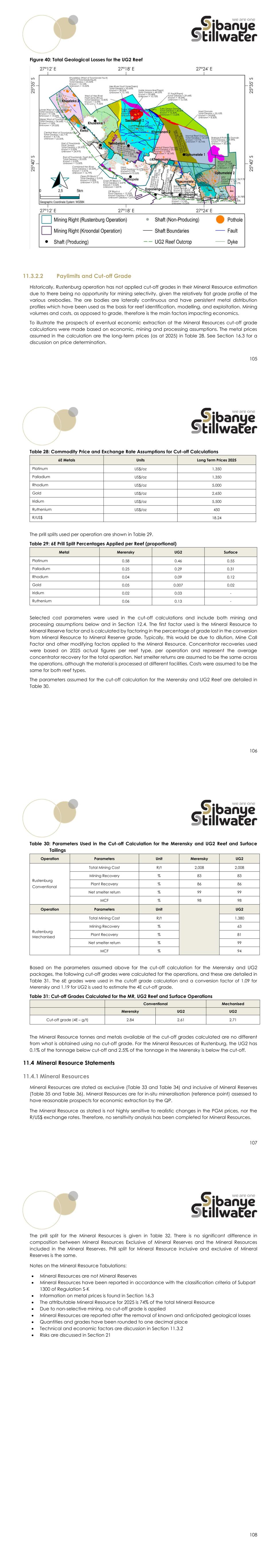 105 Figure 40: Total Geological Losses for the UG2 Reef 11.3.2.2 Paylimits and Cut-off Grade Historically, Rustenburg operation has not applied cut-off grades in their Mineral Resource estimation due to there being no opportunity for mining selectivity, given the relatively flat grade profile of the various orebodies. The ore bodies are laterally continuous and have persistent metal distribution profiles which have been used as the basis for reef identification, modelling, and exploitation. Mining volumes and costs, as opposed to grade, therefore is the main factors impacting economics. To illustrate the prospects of eventual economic extraction at the Mineral Resources cut-off grade calculations were made based on economic, mining and processing assumptions. The metal prices assumed in the calculation are the long-term prices (as at 2025) in Table 28. See Section 16.3 for a discussion on price determination. 106 Table 28: Commodity Price and Exchange Rate Assumptions for Cut-off Calculations 6E Metals Units Long Term Prices 2025 Platinum US$/oz 1,350 Palladium US$/oz 1,350 Rhodium US$/oz 5,000 Gold US$/oz 2,650 Iridium US$/oz 5,500 Ruthenium US$/oz 450 R/US$ 18.24 The prill splits used per operation are shown in Table 29. Table 29: 6E Prill Split Percentages Applied per Reef (proportional) Metal Merensky UG2 Surface Platinum 0.58 0.46 0.55 Palladium 0.25 0.29 0.31 Rhodium 0.04 0.09 0.12 Gold 0.05 0.007 0.02 Iridium 0.02 0.03 - Ruthenium 0.06 0.13 - Selected cost parameters were used in the cut-off calculations and include both mining and processing assumptions below and in Section 12.4. The first factor used is the Mineral Resource to Mineral Reserve factor and is calculated by factoring in the percentage of grade lost in the conversion from Mineral Resource to Mineral Reserve grade. Typically, this would be due to dilution, Mine Call Factor and other modifying factors applied to the Mineral Resource. Concentrator recoveries used were based on 2025 actual figures per reef type, per operation and represent the average concentrator recovery for the total operation. Net smelter returns are assumed to be the same across the operations, although the material is processed at different facilities. Costs were assumed to be the same for both reef types. The parameters assumed for the cut-off calculation for the Merensky and UG2 Reef are detailed in Table 30. 107 Table 30: Parameters Used in the Cut-off Calculation for the Merensky and UG2 Reef and Surface Tailings Operation Parameters Unit Merensky UG2 Rustenburg Conventional Total Mining Cost R/t 2,008 2,008 Mining Recovery % 83 83 Plant Recovery % 86 86 Net smelter return % 99 99 MCF % 98 98 Operation Parameters Unit UG2 Rustenburg Mechanised Total Mining Cost R/t 1,380 Mining Recovery % 63 Plant Recovery % 81 Net smelter return % 99 MCF % 94 Based on the parameters assumed above for the cut-off calculation for the Merensky and UG2 packages, the following cut-off grades were calculated for the operations, and these are detailed in Table 31. The 6E grades were used in the cutoff grade calculation and a conversion factor of 1.09 for Merensky and 1.19 for UG2 is used to estimate the 4E cut-off grade. Table 31: Cut-off Grades Calculated for the MR, UG2 Reef and Surface Operations Conventional Mechanised Merensky UG2 UG2 Cut-off grade (4E – g/t) 2.84 2.61 2.71 The Mineral Resource tonnes and metals available at the cut-off grades calculated are no different from what is obtained using no cut-off grade. For the Mineral Resources at Rustenburg, the UG2 has 0.1% of the tonnage below cut-off and 2.5% of the tonnage in the Merensky is below the cut-off. 11.4 Mineral Resource Statements 11.4.1 Mineral Resources Mineral Resources are stated as exclusive (Table 33 and Table 34) and inclusive of Mineral Reserves (Table 35 and Table 36). Mineral Resources are for in-situ mineralisation (reference point) assessed to have reasonable prospects for economic extraction by the QP. The Mineral Resource as stated is not highly sensitive to realistic changes in the PGM prices, nor the R/US$ exchange rates. Therefore, no sensitivity analysis has been completed for Mineral Resources. 108 The prill split for the Mineral Resources is given in Table 32. There is no significant difference in composition between Mineral Resources Exclusive of Mineral Reserves and the Mineral Resources included in the Mineral Reserves. Prill split for Mineral Resource inclusive and exclusive of Mineral Reserves is the same. Notes on the Mineral Resource Tabulations: • Mineral Resources are not Mineral Reserves • Mineral Resources have been reported in accordance with the classification criteria of Subpart 1300 of Regulation S-K • Information on metal prices is found in Section 16.3 • The attributable Mineral Resource for 2025 is 74% of the total Mineral Resource • Due to non-selective mining, no cut-off grade is applied • Mineral Resources are reported after the removal of known and anticipated geological losses • Quantities and grades have been rounded to one decimal place • Technical and economic factors are discussion in Section 11.3.2 • Risks are discussed in Section 21