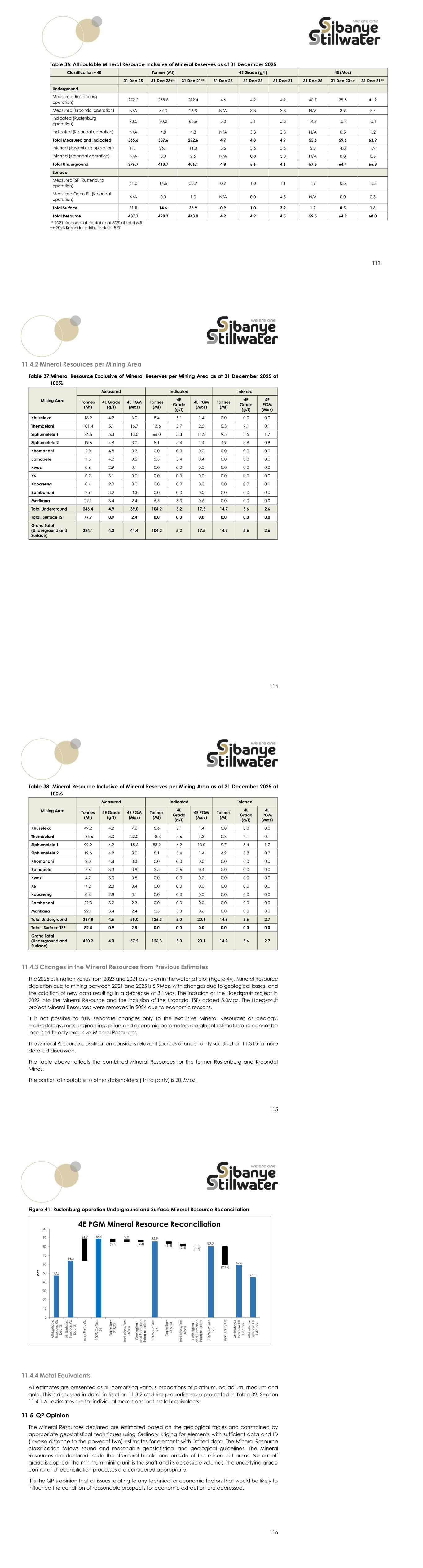 113 Table 36: Attributable Mineral Resource Inclusive of Mineral Reserves as at 31 December 2025 Classification – 4E Tonnes (Mt) 4E Grade (g/t) 4E (Moz) 31 Dec 25 31 Dec 23++ 31 Dec 21** 31 Dec 25 31 Dec 23 31 Dec 21 31 Dec 25 31 Dec 23++ 31 Dec 21** Underground Measured (Rustenburg operation) 272.2 255.6 272.4 4.6 4.9 4.9 40.7 39.8 41.9 Measured (Kroondal operation) N/A 37.0 26.8 N/A 3.3 3.3 N/A 3.9 5.7 Indicated (Rustenburg operation) 93.5 90.2 88.6 5.0 5.1 5.3 14.9 15.4 15.1 Indicated (Kroondal operation) N/A 4.8 4.8 N/A 3.3 3.8 N/A 0.5 1.2 Total Measured and Indicated 365.6 387.6 292.6 4.7 4.8 4.9 55.6 59.6 63.9 Inferred (Rustenburg operation) 11.1 26.1 11.0 5.6 5.6 5.6 2.0 4.8 1.9 Inferred (Kroondal operation) N/A 0.0 2.5 N/A 0.0 3.0 N/A 0.0 0.5 Total Underground 376.7 413.7 406.1 4.8 5.6 4.6 57.5 64.4 66.3 Surface Measured TSF (Rustenburg operation) 61.0 14.6 35.9 0.9 1.0 1.1 1.9 0.5 1.3 Measured Open-Pit (Kroondal operation) N/A 0.0 1.0 N/A 0.0 4.3 N/A 0.0 0.3 Total Surface 61.0 14.6 36.9 0.9 1.0 3.2 1.9 0.5 1.6 Total Resource 437.7 428.3 443.0 4.2 4.9 4.5 59.5 64.9 68.0 ** 2021 Kroondal attributable at 50% of total MR ++ 2023 Kroondal attributable at 87% 114 11.4.2 Mineral Resources per Mining Area Table 37:Mineral Resource Exclusive of Mineral Reserves per Mining Area as at 31 December 2025 at 100% Mining Area Measured Indicated Inferred Tonnes (Mt) 4E Grade (g/t) 4E PGM (Moz) Tonnes (Mt) 4E Grade (g/t) 4E PGM (Moz) Tonnes (Mt) 4E Grade (g/t) 4E PGM (Moz) Khuseleka 18.9 4.9 3.0 8.4 5.1 1.4 0.0 0.0 0.0 Thembelani 101.4 5.1 16.7 13.6 5.7 2.5 0.3 7.1 0.1 Siphumelele 1 76.6 5.3 13.0 66.0 5.3 11.2 9.5 5.5 1.7 Siphumelele 2 19.6 4.8 3.0 8.1 5.4 1.4 4.9 5.8 0.9 Khomanani 2.0 4.8 0.3 0.0 0.0 0.0 0.0 0.0 0.0 Bathopele 1.6 4.2 0.2 2.5 5.4 0.4 0.0 0.0 0.0 Kwezi 0.6 2.9 0.1 0.0 0.0 0.0 0.0 0.0 0.0 K6 0.2 3.1 0.0 0.0 0.0 0.0 0.0 0.0 0.0 Kopaneng 0.4 2.9 0.0 0.0 0.0 0.0 0.0 0.0 0.0 Bambanani 2.9 3.2 0.3 0.0 0.0 0.0 0.0 0.0 0.0 Marikana 22.1 3.4 2.4 5.5 3.3 0.6 0.0 0.0 0.0 Total Underground 246.4 4.9 39.0 104.2 5.2 17.5 14.7 5.6 2.6 Total: Surface TSF 77.7 0.9 2.4 0.0 0.0 0.0 0.0 0.0 0.0 Grand Total (Underground and Surface) 324.1 4.0 41.4 104.2 5.2 17.5 14.7 5.6 2.6 115 Table 38: Mineral Resource Inclusive of Mineral Reserves per Mining Area as at 31 December 2025 at 100% Mining Area Measured Indicated Inferred Tonnes (Mt) 4E Grade (g/t) 4E PGM (Moz) Tonnes (Mt) 4E Grade (g/t) 4E PGM (Moz) Tonnes (Mt) 4E Grade (g/t) 4E PGM (Moz) Khuseleka 49.2 4.8 7.6 8.6 5.1 1.4 0.0 0.0 0.0 Thembelani 135.6 5.0 22.0 18.3 5.6 3.3 0.3 7.1 0.1 Siphumelele 1 99.9 4.9 15.6 83.2 4.9 13.0 9.7 5.4 1.7 Siphumelele 2 19.6 4.8 3.0 8.1 5.4 1.4 4.9 5.8 0.9 Khomanani 2.0 4.8 0.3 0.0 0.0 0.0 0.0 0.0 0.0 Bathopele 7.6 3.3 0.8 2.5 5.6 0.4 0.0 0.0 0.0 Kwezi 4.7 3.0 0.5 0.0 0.0 0.0 0.0 0.0 0.0 K6 4.2 2.8 0.4 0.0 0.0 0.0 0.0 0.0 0.0 Kopaneng 0.6 2.8 0.1 0.0 0.0 0.0 0.0 0.0 0.0 Bambanani 22.3 3.2 2.3 0.0 0.0 0.0 0.0 0.0 0.0 Marikana 22.1 3.4 2.4 5.5 3.3 0.6 0.0 0.0 0.0 Total Underground 367.8 4.6 55.0 126.3 5.0 20.1 14.9 5.6 2.7 Total: Surface TSF 82.4 0.9 2.5 0.0 0.0 0.0 0.0 0.0 0.0 Grand Total (Underground and Surface) 450.2 4.0 57.5 126.3 5.0 20.1 14.9 5.6 2.7 11.4.3 Changes in the Mineral Resources from Previous Estimates The 2025 estimation varies from 2023 and 2021 as shown in the waterfall plot (Figure 44). Mineral Resource depletion due to mining between 2021 and 2025 is 5.9Moz, with changes due to geological losses, and the addition of new data resulting in a decrease of 3.1Moz. The inclusion of the Hoedspruit project in 2022 into the Mineral Resource and the inclusion of the Kroondal TSFs added 5.0Moz. The Hoedspruit project Mineral Resources were removed in 2024 due to economic reasons. It is not possible to fully separate changes only to the exclusive Mineral Resources as geology, methodology, rock engineering, pillars and economic parameters are global estimates and cannot be localised to only exclusive Mineral Resources. The Mineral Resource classification considers relevant sources of uncertainty see Section 11.3 for a more detailed discussion. The table above reflects the combined Mineral Resources for the former Rustenburg and Kroondal Mines. The portion attributable to other stakeholders ( third party) is 20.9Moz. 116 Figure 41: Rustenburg operation Underground and Surface Mineral Resource Reconciliation 11.4.4 Metal Equivalents All estimates are presented as 4E comprising various proportions of platinum, palladium, rhodium and gold. This is discussed in detail in Section 11.3.2 and the proportions are presented in Table 32, Section 11.4.1 All estimates are for individual metals and not metal equivalents. 11.5 QP Opinion The Mineral Resources declared are estimated based on the geological facies and constrained by appropriate geostatistical techniques using Ordinary Kriging for elements with sufficient data and ID (Inverse distance to the power of two) estimates for elements with limited data. The Mineral Resource classification follows sound and reasonable geostatistical and geological guidelines. The Mineral Resources are declared inside the structural blocks and outside of the mined-out areas. No cut-off grade is applied. The minimum mining unit is the shaft and its accessible volumes. The underlying grade control and reconciliation processes are considered appropriate. It is the QP’s opinion that all issues relating to any technical or economic factors that would be likely to influence the condition of reasonable prospects for economic extraction are addressed.