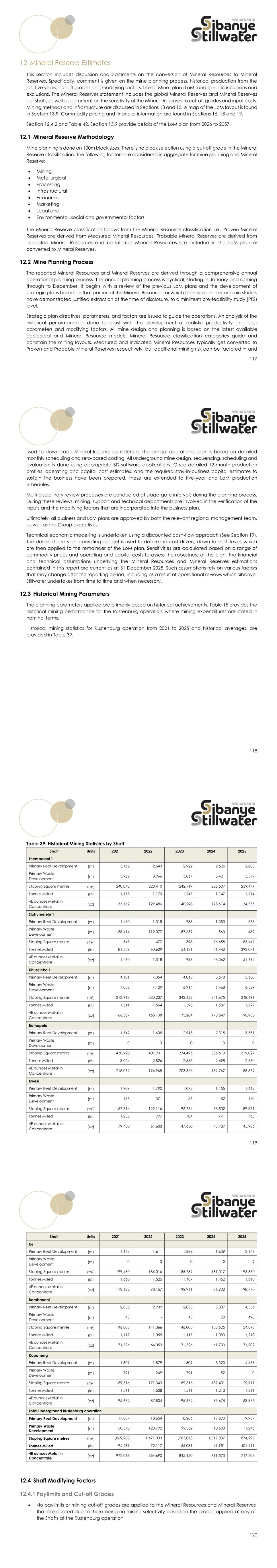 117 12 Mineral Reserve Estimates This section includes discussion and comments on the conversion of Mineral Resources to Mineral Reserves. Specifically, comment is given on the mine planning process, historical production from the last five years, cut-off grades and modifying factors, Life-of Mine- plan (LoM) and specific inclusions and exclusions. The Mineral Reserves statement includes the global Mineral Reserves and Mineral Reserves per shaft, as well as comment on the sensitivity of the Mineral Reserves to cut-off grades and input costs. Mining methods and Infrastructure are discussed in Sections 13 and 15. A map of the LoM layout is found in Section 13.9. Commodity pricing and financial information are found in Sections 16, 18 and 19. Section 12.4.2 and Table 42, Section 13.9 provide details of the LoM plan from 2026 to 2057. 12.1 Mineral Reserve Methodology Mine planning is done on 100m block sizes. There is no block selection using a cut-off grade in the Mineral Reserve classification. The following factors are considered in aggregate for mine planning and Mineral Reserve: • Mining • Metallurgical • Processing • Infrastructural • Economic • Marketing • Legal and • Environmental, social and governmental factors The Mineral Reserve classification follows from the Mineral Resource classification i.e., Proven Mineral Reserves are derived from Measured Mineral Resources, Probable Mineral Reserves are derived from Indicated Mineral Resources and no Inferred Mineral Resources are included in the LoM plan or converted to Mineral Reserves. 12.2 Mine Planning Process The reported Mineral Resources and Mineral Reserves are derived through a comprehensive annual operational planning process. The annual planning process is cyclical, starting in January and running through to December. It begins with a review of the previous LoM plans and the development of strategic plans based on that portion of the Mineral Resource for which technical and economic studies have demonstrated justified extraction at the time of disclosure, to a minimum pre-feasibility study (PFS) level. Strategic plan directives, parameters, and factors are issued to guide the operations. An analysis of the historical performance is done to assist with the development of realistic productivity and cost parameters and modifying factors. All mine design and planning is based on the latest available geological and Mineral Resource models. Mineral Resource classification categories guide and constrain the mining layouts. Measured and Indicated Mineral Resources typically get converted to Proven and Probable Mineral Reserves respectively, but additional mining risk can be factored in and 118 used to downgrade Mineral Reserve confidence. The annual operational plan is based on detailed monthly scheduling and zero-based costing. All underground mine design, sequencing, scheduling and evaluation is done using appropriate 3D software applications. Once detailed 12-month production profiles, operating and capital cost estimates, and the required stay-in-business capital estimates to sustain the business have been prepared, these are extended to five-year and LoM production schedules. Multi-disciplinary review processes are conducted at stage-gate intervals during the planning process. During these reviews, mining, support and technical departments are involved in the verification of the inputs and the modifying factors that are incorporated into the business plan. Ultimately, all business and LoM plans are approved by both the relevant regional management team, as well as the Group executives. Technical economic modelling is undertaken using a discounted cash-flow approach (See Section 19). The detailed one-year operating budget is used to determine cost drivers, down to shaft level, which are then applied to the remainder of the LoM plan. Sensitivities are calculated based on a range of commodity prices and operating and capital costs to assess the robustness of the plan. The financial and technical assumptions underlying the Mineral Resources and Mineral Reserves estimations contained in this report are current as at 31 December 2025. Such assumptions rely on various factors that may change after the reporting period, including as a result of operational reviews which Sibanye- Stillwater undertakes from time to time and when necessary. 12.3 Historical Mining Parameters The planning parameters applied are primarily based on historical achievements. Table 15 provides the historical mining performance for the Rustenburg operation, where mining expenditures are stated in nominal terms. Historical mining statistics for Rustenburg operation from 2021 to 2025 and historical averages, are provided in Table 39. 119 Table 39: Historical Mining Statistics by Shaft Shaft Units 2021 2022 2023 2024 2025 Thembelani 1 Primary Reef Development (m) 3,162 2,643 2,922 2,526 2,803 Primary Waste Development (m) 3,952 3,966 3,867 3,421 3,579 Stoping Square metres (m2) 240,048 228,410 242,719 225,507 239,479 Tonnes Milled (kt) 1,178 1,170 1,247 1,147 1,214 4E ounces Metal in Concentrate (oz) 135,132 129,486 140,298 128,614 134,535 Siphumelele 1 Primary Reef Development (m) 1,460 1,318 933 1,350 678 Primary Waste Development (m) 138,414 112,077 87,659 560 489 Stoping Square metres (m2) 547 477 398 76,658 83,142 Tonnes Milled (kt) 81,539 60,629 54,131 41,442 392,071 4E ounces Metal in Concentrate (oz) 1,460 1,318 933 48,362 51,692 Khuseleka 1 Primary Reef Development (m) 4,181 4,354 4,013 3,578 3,680 Primary Waste Development (m) 7,032 7,129 6,914 6,468 6,529 Stoping Square metres (m2) 313,918 330,237 342,633 341,675 348,191 Tonnes Milled (kt) 1,541 1,564 1,593 1,587 1,699 4E ounces Metal in Concentrate (oz) 166,309 165,108 175,284 178,549 190,933 Bathopele Primary Reef Development (m) 1,549 1,605 2,913 2,315 3,551 Primary Waste Development (m) 0 0 0 0 0 Stoping Square metres (m2) 430,920 401,931 374,496 335,613 319,029 Tonnes Milled (kt) 3,024 