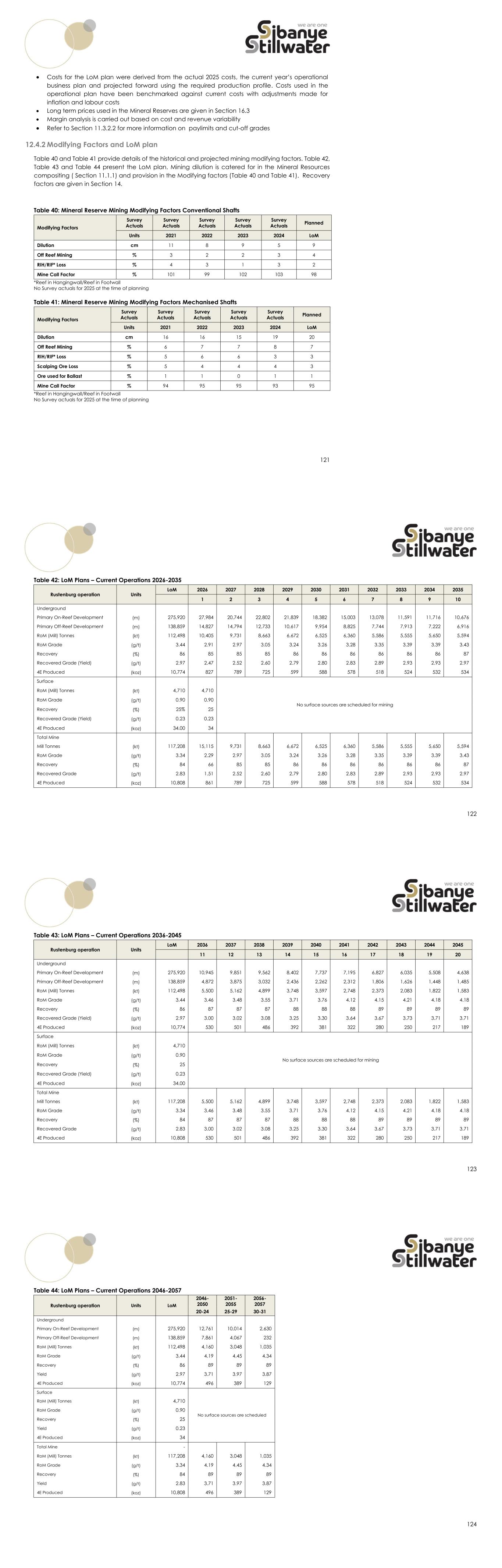 121 • Costs for the LoM plan were derived from the actual 2025 costs, the current year’s operational business plan and projected forward using the required production profile. Costs used in the operational plan have been benchmarked against current costs with adjustments made for inflation and labour costs • Long term prices used in the Mineral Reserves are given in Section 16.3 • Margin analysis is carried out based on cost and revenue variability • Refer to Section 11.3.2.2 for more information on paylimits and cut-off grades 12.4.2 Modifying Factors and LoM plan Table 40 and Table 41 provide details of the historical and projected mining modifying factors. Table 42, Table 43 and Table 44 present the LoM plan. Mining dilution is catered for in the Mineral Resources compositing ( Section 11.1.1) and provision in the Modifying factors (Table 40 and Table 41). Recovery factors are given in Section 14. Table 40: Mineral Reserve Mining Modifying Factors Conventional Shafts Modifying Factors Survey Actuals Survey Actuals Survey Actuals Survey Actuals Survey Actuals Planned Units 2021 2022 2023 2024 LoM Dilution cm 11 8 9 5 9 Off Reef Mining % 3 2 2 3 4 RIH/RIF* Loss % 4 3 1 3 2 Mine Call Factor % 101 99 102 103 98 *Reef in Hangingwall/Reef in Footwall No Survey actuals for 2025 at the time of planning Table 41: Mineral Reserve Mining Modifying Factors Mechanised Shafts Modifying Factors Survey Actuals Survey Actuals Survey Actuals Survey Actuals Survey Actuals Planned Units 2021 2022 2023 2024 LoM Dilution cm 16 16 15 19 20 Off Reef Mining % 6 7 7 8 7 RIH/RIF* Loss % 5 6 6 3 3 Scalping Ore Loss % 5 4 4 4 3 Ore used for Ballast % 1 1 0 1 1 Mine Call Factor % 94 95 95 93 95 *Reef in Hangingwall/Reef in Footwall No Survey actuals for 2025 at the time of planning 122 Table 42: LoM Plans – Current Operations 2026-2035 Rustenburg operation Units LoM 2026 2027 2028 2029 2030 2031 2032 2033 2034 2035 1 2 3 4 5 6 7 8 9 10 Underground Primary On-Reef Development (m) 275,920 27,984 20,744 22,802 21,839 18,382 15,003 13,078 11,591 11,716 10,676 Primary Off-Reef Development (m) 138,859 14,827 14,794 12,733 10,617 9,954 8,825 7,744 7,913 7,222 6,916 RoM (Mill) Tonnes (kt) 112,498 10,405 9,731 8,663 6,672 6,525 6,360 5,586 5,555 5,650 5,594 RoM Grade (g/t) 3.44 2.91 2.97 3.05 3.24 3.26 3.28 3.35 3.39 3.39 3.43 Recovery (%) 86 85 85 85 86 86 86 86 86 86 87 Recovered Grade (Yield) (g/t) 2.97 2.47 2.52 2.60 2.79 2.80 2.83 2.89 2.93 2.93 2.97 4E Produced (koz) 10,774 827 789 725 599 588 578 518 524 532 534 Surface No surface sources are scheduled for mining RoM (Mill) Tonnes (kt) 4,710 4,710 RoM Grade (g/t) 0.90 0.90 Recovery (%) 25% 25 Recovered Grade (Yield) (g/t) 0.23 0.23 4E Produced (koz) 34.00 34 Total Mine Mill Tonnes (kt) 117,208 15,115 9,731 8,663 6,672 6,525 6,360 5,586 5,555 5,650 5,594 RoM Grade (g/t) 3.34 2.29 2.97 3.05 3.24 3.26 3.28 3.35 3.39 3.39 3.43 Recovery (%) 84 66 85 85 86 86 86 86 86 86 87 Recovered Grade (g/t) 2.83 1.51 2.52 2.60 2.79 2.80 2.83 2.89 2.93 2.93 2.97 4E Produced (koz) 10,808 861 789 725 599 588 578 518 524 532 534 123 Table 43: LoM Plans – Current Operations 2036-2045 Rustenburg operation Units LoM 2036 2037 2038 2039 2040 2041 2042 2043 2044 2045 11 12 13 14 15 16 17 18 19 20 Underground Primary On-Reef Development (m) 275,920 10,945 9,851 9,562 8,402 7,737 7,195 6,827 6,035 5,508 4,638 Primary Off-Reef Development (m) 138,859 4,872 3,875 3,032 2,436 2,262 2,312 1,806 1,626 1,448 1,485 RoM (Mill) Tonnes (kt) 112,498 5,500 5,162 4,899 3,748 3,597 2,748 2,373 2,083 1,822 1,583 RoM Grade (g/t) 3.44 3.46 3.48 3.55 3.71 3.76 4.12 4.15 4.21 4.18 4.18 Recovery (%) 86 87 87 87 88 88 88 89 89 89 89 Recovered Grade (Yield) (g/t) 2.97 3.00 3.02 3.08 3.25 3.30 3.64 3.67 3.73 3.71 3.71 4E Produced (koz) 10,774 530 501 486 392 381 322 280 250 217 189 Surface No surface sources are scheduled for mining RoM (Mill) Tonnes (kt) 4,710 RoM Grade (g/t) 0.90 Recovery (%) 25 Recovered Grade (Yield) (g/t) 0.23 4E Produced (koz) 34.00 Total Mine Mill Tonnes (kt) 117,208 5,500 5,162 4,899 3,748 3,597 2,748 2,373 2,083 1,822 1,583 RoM Grade (g/t) 3.34 3.46 3.48 3.55 3.71 3.76 4.12 4.15 4.21 4.18 4.18 Recovery (%) 84 87 87 87 88 88 88 89 89 89 89 Recovered Grade (g/t) 2.83 3.00 3.02 3.08 3.25 3.30 3.64 3.67 3.73 3.71 3.71 4E Produced (koz) 10,808 530 501 486 392 381 322 280 250 217 189 124 Table 44: LoM Plans – Current Operations 2046-2057 Rustenburg operation Units LoM 2046- 2050 2051- 2055 2056- 2057 20-24 25-29 30-31 Underground Primary On-Reef Development (m) 275,920 12,761 10,014 2,630 Primary Off-Reef Development (m) 138,859 7,861 4,067 232 RoM (Mill) Tonnes (kt) 112,498 4,160 3,048 1,035 RoM Grade (g/t) 3.44 4.19 4.45 4.34 Recovery (%) 86 89 89 89 Yield (g/t) 2.97 3.71 3.97 3.87 4E Produced (koz) 10,774 496 389 129 Surface No surface sources are scheduled RoM (Mill) Tonnes (kt) 4,710 RoM Grade (g/t) 0.90 Recovery (%) 25 Yield (g/t) 0.23 4E Produced (koz) 34 Total Mine - RoM (Mill) Tonnes (kt) 117,208 4,160 3,048 1,035 RoM Grade (g/t) 3.34 4.19 4.45 4.34 Recovery (%) 84 89 89 89 Yield (g/t) 2.83 3.71 3.97 3.87 4E Produced (koz) 10,808 496 389 129