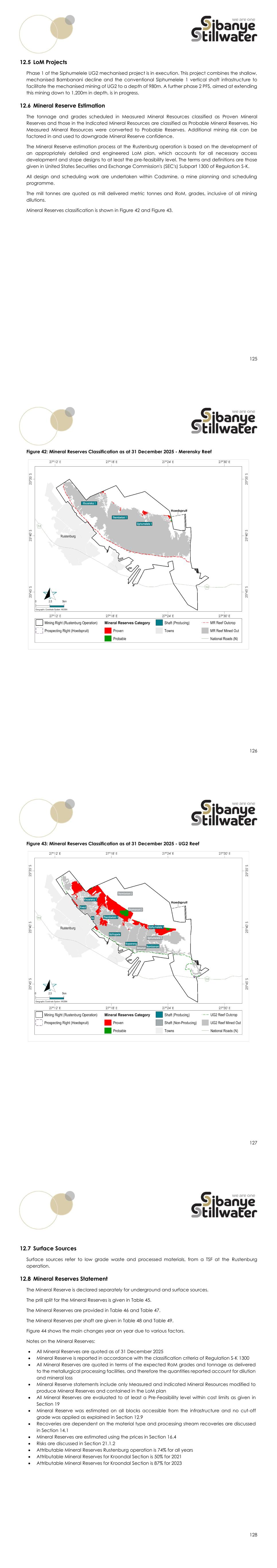 125 12.5 LoM Projects Phase 1 of the Siphumelele UG2 mechanised project is in execution. This project combines the shallow, mechanised Bambanani decline and the conventional Siphumelele 1 vertical shaft infrastructure to facilitate the mechanised mining of UG2 to a depth of 980m. A further phase 2 PFS, aimed at extending this mining down to 1,200m in depth, is in progress. 12.6 Mineral Reserve Estimation The tonnage and grades scheduled in Measured Mineral Resources classified as Proven Mineral Reserves and those in the Indicated Mineral Resources are classified as Probable Mineral Reserves. No Measured Mineral Resources were converted to Probable Reserves. Additional mining risk can be factored in and used to downgrade Mineral Reserve confidence. The Mineral Reserve estimation process at the Rustenburg operation is based on the development of an appropriately detailed and engineered LoM plan, which accounts for all necessary access development and stope designs to at least the pre-feasibility level. The terms and definitions are those given in United States Securities and Exchange Commission's (SEC's) Subpart 1300 of Regulation S-K. All design and scheduling work are undertaken within Cadsmine, a mine planning and scheduling programme. The mill tonnes are quoted as mill delivered metric tonnes and RoM, grades, inclusive of all mining dilutions. Mineral Reserves classification is shown in Figure 42 and Figure 43. 126 Figure 42: Mineral Reserves Classification as at 31 December 2025 - Merensky Reef 127 Figure 43: Mineral Reserves Classification as at 31 December 2025 - UG2 Reef 128 12.7 Surface Sources Surface sources refer to low grade waste and processed materials, from a TSF at the Rustenburg operation. 12.8 Mineral Reserves Statement The Mineral Reserve is declared separately for underground and surface sources. The prill split for the Mineral Reserves is given in Table 45. The Mineral Reserves are provided in Table 46 and Table 47. The Mineral Reserves per shaft are given in Table 48 and Table 49. Figure 44 shows the main changes year on year due to various factors. Notes on the Mineral Reserves: • All Mineral Reserves are quoted as of 31 December 2025 • Mineral Reserve is reported in accordance with the classification criteria of Regulation S-K 1300 • All Mineral Reserves are quoted in terms of the expected RoM grades and tonnage as delivered to the metallurgical processing facilities, and therefore the quantities reported account for dilution and mineral loss • Mineral Reserve statements include only Measured and Indicated Mineral Resources modified to produce Mineral Reserves and contained in the LoM plan • All Mineral Reserves are evaluated to at least a Pre-Feasibility level within cost limits as given in Section 19 • Mineral Reserve was estimated on all blocks accessible from the infrastructure and no cut-off grade was applied as explained in Section 12.9 • Recoveries are dependent on the material type and processing stream recoveries are discussed in Section 14.1 • Mineral Reserves are estimated using the prices in Section 16.4 • Risks are discussed in Section 21.1.2 • Attributable Mineral Reserves Rustenburg operation is 74% for all years • Attributable Mineral Reserves for Kroondal Section is 50% for 2021 • Attributable Mineral Reserves for Kroondal Section is 87% for 2023