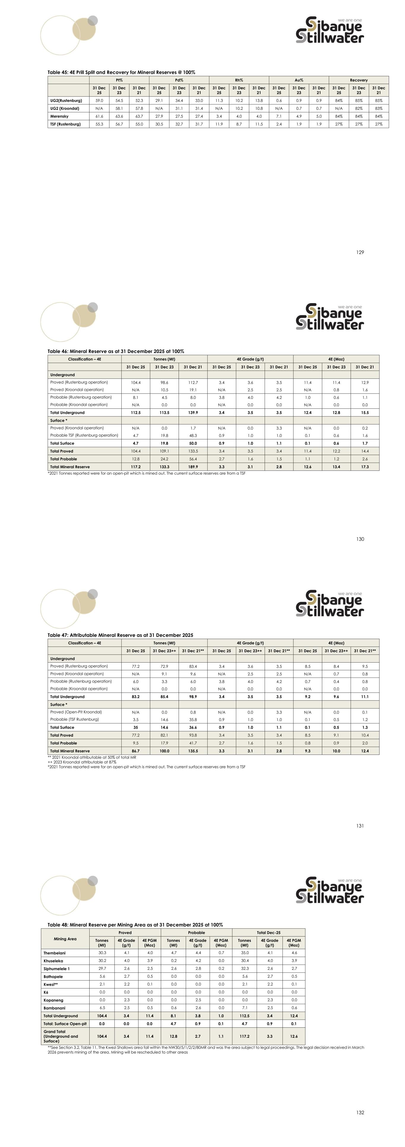 129 Table 45: 4E Prill Split and Recovery for Mineral Reserves @ 100% Pt% Pd% Rh% Au% Recovery 31 Dec 25 31 Dec 23 31 Dec 21 31 Dec 25 31 Dec 23 31 Dec 21 31 Dec 25 31 Dec 23 31 Dec 21 31 Dec 25 31 Dec 23 31 Dec 21 31 Dec 25 31 Dec 23 31 Dec 21 UG2(Rustenburg) 59.0 54.5 52.3 29.1 34.4 33.0 11.3 10.2 13.8 0.6 0.9 0.9 84% 85% 85% UG2 (Kroondal) N/A 58.1 57.8 N/A 31.1 31.4 N/A 10.2 10.8 N/A 0.7 0.7 N/A 82% 83% Merensky 61.6 63.6 63.7 27.9 27.5 27.4 3.4 4.0 4.0 7.1 4.9 5.0 84% 84% 84% TSF (Rustenburg) 55.3 56.7 55.0 30.5 32.7 31.7 11.9 8.7 11.5 2.4 1.9 1.9 27% 27% 27% 130 Table 46: Mineral Reserve as at 31 December 2025 at 100% Classification – 4E Tonnes (Mt) 4E Grade (g/t) 4E (Moz) 31 Dec 25 31 Dec 23 31 Dec 21 31 Dec 25 31 Dec 23 31 Dec 21 31 Dec 25 31 Dec 23 31 Dec 21 Underground Proved (Rustenburg operation) 104.4 98.6 112.7 3.4 3.6 3.5 11.4 11.4 12.9 Proved (Kroondal operation) N/A 10.5 19.1 N/A 2.5 2.5 N/A 0.8 1.6 Probable (Rustenburg operation) 8.1 4.5 8.0 3.8 4.0 4.2 1.0 0.6 1.1 Probable (Kroondal operation) N/A 0.0 0.0 N/A 0.0 0.0 N/A 0.0 0.0 Total Underground 112.5 113.5 139.9 3.4 3.5 3.5 12.4 12.8 15.5 Surface * Proved (Kroondal operation) N/A 0.0 1.7 N/A 0.0 3.3 N/A 0.0 0.2 Probable TSF (Rustenburg operation) 4.7 19.8 48.3 0.9 1.0 1.0 0.1 0.6 1.6 Total Surface 4.7 19.8 50.0 0.9 1.0 1.1 0.1 0.6 1.7 Total Proved 104.4 109.1 133.5 3.4 3.5 3.4 11.4 12.2 14.4 Total Probable 12.8 24.2 56.4 2.7 1.6 1.5 1.1 1.2 2.6 Total Mineral Reserve 117.2 133.3 189.9 3.3 3.1 2.8 12.6 13.4 17.3 *2021 Tonnes reported were for an open-pit which is mined out. The current surface reserves are from a TSF 131 Table 47: Attributable Mineral Reserve as at 31 December 2025 Classification – 4E Tonnes (Mt) 4E Grade (g/t) 4E (Moz) 31 Dec 25 31 Dec 23++ 31 Dec 21** 31 Dec 25 31 Dec 23++ 31 Dec 21** 31 Dec 25 31 Dec 23++ 31 Dec 21** Underground Proved (Rustenburg operation) 77.2 72.9 83.4 3.4 3.6 3.5 8.5 8.4 9.5 Proved (Kroondal operation) N/A 9.1 9.6 N/A 2.5 2.5 N/A 0.7 0.8 Probable (Rustenburg operation) 6.0 3.3 6.0 3.8 4.0 4.2 0.7 0.4 0.8 Probable (Kroondal operation) N/A 0.0 0.0 N/A 0.0 0.0 N/A 0.0 0.0 Total Underground 83.2 85.4 98.9 3.4 3.5 3.5 9.2 9.6 11.1 Surface * Proved (Open-Pit Kroondal) N/A 0.0 0.8 N/A 0.0 3.3 N/A 0.0 0.1 Probable (TSF Rustenburg) 3.5 14.6 35.8 0.9 1.0 1.0 0.1 0.5 1.2 Total Surface 35 14.6 36.6 0.9 1.0 1.1 0.1 0.5 1.3 Total Proved 77.2 82.1 93.8 3.4 3.5 3.4 8.5 9.1 10.4 Total Probable 9.5 17.9 41.7 2.7 1.6 1.5 0.8 0.9 2.0 Total Mineral Reserve 86.7 100.0 135.5 3.3 3.1 2.8 9.3 10.0 12.4 ** 2021 Kroondal attributable at 50% of total MR ++ 2023 Kroondal attributable at 87% *2021 Tonnes reported were for an open-pit which is mined out. The current surface reserves are from a TSF 132 Table 48: Mineral Reserve per Mining Area as at 31 December 2025 at 100% Mining Area Proved Probable Total Dec-25 Tonnes (Mt) 4E Grade (g/t) 4E PGM (Moz) Tonnes (Mt) 4E Grade (g/t) 4E PGM (Moz) Tonnes (Mt) 4E Grade (g/t) 4E PGM (Moz) Thembelani 30.3 4.1 4.0 4.7 4.4 0.7 35.0 4.1 4.6 Khuseleka 30.2 4.0 3.9 0.2 4.2 0.0 30.4 4.0 3.9 Siphumelele 1 29.7 2.6 2.5 2.6 2.8 0.2 32.3 2.6 2.7 Bathopele 5.6 2.7 0.5 0.0 0.0 0.0 5.6 2.7 0.5 Kwezi** 2.1 2.2 0.1 0.0 0.0 0.0 2.1 2.2 0.1 K6 0.0 0.0 0.0 0.0 0.0 0.0 0.0 0.0 0.0 Kopaneng 0.0 2.3 0.0 0.0 2.5 0.0 0.0 2.3 0.0 Bambanani 6.5 2.5 0.5 0.6 2.6 0.0 7.1 2.5 0.6 Total Underground 104.4 3.4 11.4 8.1 3.8 1.0 112.5 3.4 12.4 Total: Surface Open-pit 0.0 0.0 0.0 4.7 0.9 0.1 4.7 0.9 0.1 Grand Total (Underground and Surface) 104.4 3.4 11.4 12.8 2.7 1.1 117.2 3.3 12.6 **See Section 3.2, Table 11. The Kwezi Shallows area fall within the NW30/5/1/2/2/80MR and was the area subject to legal proceedings. The legal decision received in March 2026 prevents mining of the area. Mining will be rescheduled to other areas