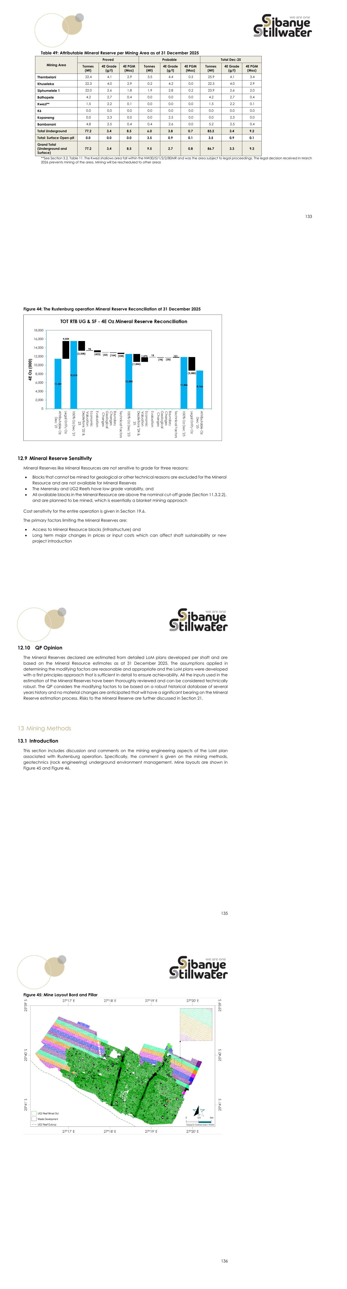 133 Table 49: Attributable Mineral Reserve per Mining Area as at 31 December 2025 Mining Area Proved Probable Total Dec-25 Tonnes (Mt) 4E Grade (g/t) 4E PGM (Moz) Tonnes (Mt) 4E Grade (g/t) 4E PGM (Moz) Tonnes (Mt) 4E Grade (g/t) 4E PGM (Moz) Thembelani 22.4 4.1 2.9 3.5 4.4 0.5 25.9 4.1 3.4 Khuseleka 22.3 4.0 2.9 0.2 4.2 0.0 22.5 4.0 2.9 Siphumelele 1 22.0 2.6 1.8 1.9 2.8 0.2 23.9 2.6 2.0 Bathopele 4.2 2.7 0.4 0.0 0.0 0.0 4.2 2.7 0.4 Kwezi** 1.5 2.2 0.1 0.0 0.0 0.0 1.5 2.2 0.1 K6 0.0 0.0 0.0 0.0 0.0 0.0 0.0 0.0 0.0 Kopaneng 0.0 2.3 0.0 0.0 2.5 0.0 0.0 2.3 0.0 Bambanani 4.8 2.5 0.4 0.4 2.6 0.0 5.2 2.5 0.4 Total Underground 77.2 3.4 8.5 6.0 3.8 0.7 83.2 3.4 9.2 Total: Surface Open-pit 0.0 0.0 0.0 3.5 0.9 0.1 3.5 0.9 0.1 Grand Total (Underground and Surface) 77.2 3.4 8.5 9.5 2.7 0.8 86.7 3.3 9.3 **See Section 3.2, Table 11. The Kwezi shallows area fall within the NW30/5/1/2/2/80MR and was the area subject to legal proceedings. The legal decision received in March 2026 prevents mining of the area. Mining will be rescheduled to other areas Figure 44: The Rustenburg operation Mineral Reserve Reconciliation at 31 December 2025 12.9 Mineral Reserve Sensitivity Mineral Reserves like Mineral Resources are not sensitive to grade for three reasons: • Blocks that cannot be mined for geological or other technical reasons are excluded for the Mineral Resource and are not available for Mineral Reserves • The Merensky and UG2 Reefs have low grade variability, and • All available blocks in the Mineral Resource are above the nominal cut-off grade (Section 11.3.2.2), and are planned to be mined, which is essentially a blanket mining approach Cost sensitivity for the entire operation is given in Section 19.6. The primary factors limiting the Mineral Reserves are: • Access to Mineral Resource blocks (infrastructure) and • Long term major changes in prices or input costs which can affect shaft sustainability or new project introduction 135 12.10 QP Opinion The Mineral Reserves declared are estimated from detailed LoM plans developed per shaft and are based on the Mineral Resource estimates as at 31 December 2025. The assumptions applied in determining the modifying factors are reasonable and appropriate and the LoM plans were developed with a first principles approach that is sufficient in detail to ensure achievability. All the inputs used in the estimation of the Mineral Reserves have been thoroughly reviewed and can be considered technically robust. The QP considers the modifying factors to be based on a robust historical database of several years history and no material changes are anticipated that will have a significant bearing on the Mineral Reserve estimation process. Risks to the Mineral Reserve are further discussed in Section 21. 13 Mining Methods 13.1 Introduction This section includes discussion and comments on the mining engineering aspects of the LoM plan associated with Rustenburg operation. Specifically, the comment is given on the mining methods, geotechnics (rock engineering) underground environment management. Mine layouts are shown in Figure 45 and Figure 46. 136 Figure 45: Mine Layout Bord and Pillar