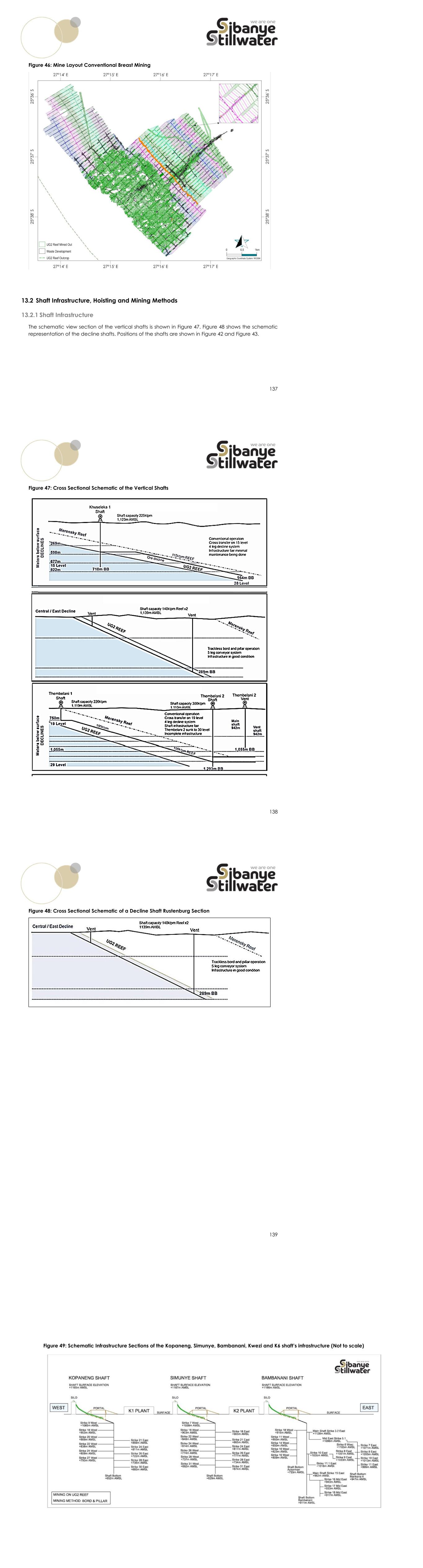 137 Figure 46: Mine Layout Conventional Breast Mining 13.2 Shaft Infrastructure, Hoisting and Mining Methods 13.2.1 Shaft Infrastructure The schematic view section of the vertical shafts is shown in Figure 47. Figure 48 shows the schematic representation of the decline shafts. Positions of the shafts are shown in Figure 42 and Figure 43. 138 Figure 47: Cross Sectional Schematic of the Vertical Shafts 139 Figure 48: Cross Sectional Schematic of a Decline Shaft Rustenburg Section Figure 49: Schematic Infrastructure Sections of the Kopaneng, Simunye, Bambanani, Kwezi and K6 shaft’s infrastructure (Not to scale)