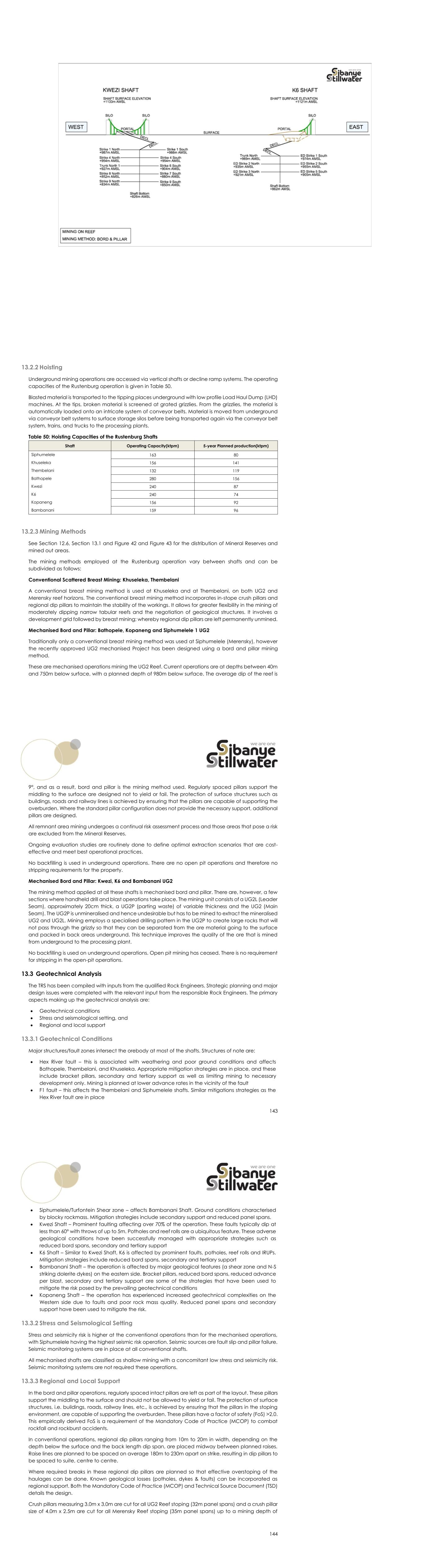 13.2.2 Hoisting Underground mining operations are accessed via vertical shafts or decline ramp systems. The operating capacities of the Rustenburg operation is given in Table 50. Blasted material is transported to the tipping places underground with low profile Load Haul Dump (LHD) machines. At the tips, broken material is screened at grated grizzlies. From the grizzlies, the material is automatically loaded onto an intricate system of conveyor belts. Material is moved from underground via conveyor belt systems to surface storage silos before being transported again via the conveyor belt system, trains, and trucks to the processing plants. Table 50: Hoisting Capacities of the Rustenburg Shafts Shaft Operating Capacity(ktpm) 5-year Planned production(ktpm) Siphumelele 163 80 Khuseleka 156 141 Thembelani 132 119 Bathopele 280 156 Kwezi 240 87 K6 240 74 Kopaneng 156 92 Bambanani 159 96 13.2.3 Mining Methods See Section 12.6, Section 13.1 and Figure 42 and Figure 43 for the distribution of Mineral Reserves and mined out areas. The mining methods employed at the Rustenburg operation vary between shafts and can be subdivided as follows: Conventional Scattered Breast Mining: Khuseleka, Thembelani A conventional breast mining method is used at Khuseleka and at Thembelani, on both UG2 and Merensky reef horizons. The conventional breast mining method incorporates in-stope crush pillars and regional dip pillars to maintain the stability of the workings. It allows for greater flexibility in the mining of moderately dipping narrow tabular reefs and the negotiation of geological structures. It involves a development grid followed by breast mining; whereby regional dip pillars are left permanently unmined. Mechanised Bord and Pillar: Bathopele, Kopaneng and Siphumelele 1 UG2 Traditionally only a conventional breast mining method was used at Siphumelele (Merensky), however the recently approved UG2 mechanised Project has been designed using a bord and pillar mining method. These are mechanised operations mining the UG2 Reef. Current operations are at depths between 40m and 750m below surface, with a planned depth of 980m below surface. The average dip of the reef is 143 9°, and as a result, bord and pillar is the mining method used. Regularly spaced pillars support the middling to the surface are designed not to yield or fail. The protection of surface structures such as buildings, roads and railway lines is achieved by ensuring that the pillars are capable of supporting the overburden. Where the standard pillar configuration does not provide the necessary support, additional pillars are designed. All remnant area mining undergoes a continual risk assessment process and those areas that pose a risk are excluded from the Mineral Reserves. Ongoing evaluation studies are routinely done to define optimal extraction scenarios that are cost- effective and meet best operational practices. No backfilling is used in underground operations. There are no open pit operations and therefore no stripping requirements for the property. Mechanised Bord and Pillar: Kwezi, K6 and Bambanani UG2 The mining method applied at all these shafts is mechanised bord and pillar. There are, however, a few sections where handheld drill and blast operations take place. The mining unit consists of a UG2L (Leader Seam), approximately 20cm thick, a UG2P (parting waste) of variable thickness and the UG2 (Main Seam). The UG2P is unmineralised and hence undesirable but has to be mined to extract the mineralised UG2 and UG2L. Mining employs a specialised drilling pattern in the UG2P to create large rocks that will not pass through the grizzly so that they can be separated from the ore material going to the surface and packed in back areas underground. This technique improves the quality of the ore that is mined from underground to the processing plant. No backfilling is used on underground operations. Open pit mining has ceased. There is no requirement for stripping in the open-pit operations. 13.3 Geotechnical Analysis The TRS has been compiled with inputs from the qualified Rock Engineers. Strategic planning and major design issues were completed with the relevant input from the responsible Rock Engineers. The primary aspects making up the geotechnical analysis are: • Geotechnical conditions • Stress and seismological setting, and • Regional and local support 13.3.1 Geotechnical Conditions Major structures/fault zones intersect the orebody at most of the shafts. Structures of note are: • Hex River fault – this is associated with weathering and poor ground conditions and affects Bathopele, Thembelani, and Khuseleka. Appropriate mitigation strategies are in place, and these include bracket pillars, secondary and tertiary support as well as limiting mining to necessary development only. Mining is planned at lower advance rates in the vicinity of the fault • F1 fault – this affects the Thembelani and Siphumelele shafts. Similar mitigations strategies as the Hex River fault are in place 144 • Siphumelele/Turfontein Shear zone – affects Bambanani Shaft. Ground conditions characterised by blocky rockmass. Mitigation strategies include secondary support and reduced panel spans. • Kwezi Shaft – Prominent faulting affecting over 70% of the operation. These faults typically dip at less than 60° with throws of up to 5m. Potholes and reef rolls are a ubiquitous feature. These adverse geological conditions have been successfully managed with appropriate strategies such as reduced bord spans, secondary and tertiary support • K6 Shaft – Similar to Kwezi Shaft, K6 is affected by prominent faults, potholes, reef rolls and IRUPs. Mitigation strategies include reduced bord spans, secondary and tertiary support • Bambanani Shaft – the operation is affected by major geological features (a shear zone and N-S striking dolerite dykes) on the eastern side. Bracket pillars, reduced bord spans, reduced advance per blast, secondary and 
