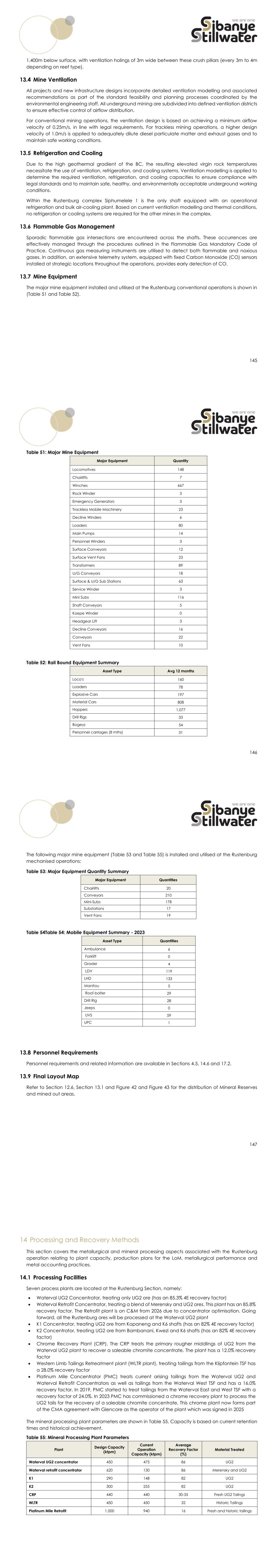 145 1,400m below surface, with ventilation holings of 3m wide between these crush pillars (every 3m to 4m depending on reef type). 13.4 Mine Ventilation All projects and new infrastructure designs incorporate detailed ventilation modelling and associated recommendations as part of the standard feasibility and planning processes coordinated by the environmental engineering staff. All underground mining are subdivided into defined ventilation districts to ensure effective control of airflow distribution. For conventional mining operations, the ventilation design is based on achieving a minimum airflow velocity of 0.25m/s, in line with legal requirements. For trackless mining operations, a higher design velocity of 1.0m/s is applied to adequately dilute diesel particulate matter and exhaust gases and to maintain safe working conditions. 13.5 Refrigeration and Cooling Due to the high geothermal gradient of the BC, the resulting elevated virgin rock temperatures necessitate the use of ventilation, refrigeration, and cooling systems. Ventilation modelling is applied to determine the required ventilation, refrigeration, and cooling capacities to ensure compliance with legal standards and to maintain safe, healthy, and environmentally acceptable underground working conditions. Within the Rustenburg complex Siphumelele 1 is the only shaft equipped with an operational refrigeration and bulk air‑cooling plant. Based on current ventilation modelling and thermal conditions, no refrigeration or cooling systems are required for the other mines in the complex. 13.6 Flammable Gas Management Sporadic flammable gas intersections are encountered across the shafts. These occurrences are effectively managed through the procedures outlined in the Flammable Gas Mandatory Code of Practice. Continuous gas measuring instruments are utilised to detect both flammable and noxious gases. In addition, an extensive telemetry system, equipped with fixed Carbon Monoxide (CO) sensors installed at strategic locations throughout the operations, provides early detection of CO. 13.7 Mine Equipment The major mine equipment installed and utilised at the Rustenburg conventional operations is shown in (Table 51 and Table 52). 146 Table 51: Major Mine Equipment Major Equipment Quantity Locomotives 148 Chairlifts 7 Winches 667 Rock Winder 3 Emergency Generators 3 Trackless Mobile Machinery 23 Decline Winders 6 Loaders 80 Main Pumps 14 Personnel Winders 3 Surface Conveyors 12 Surface Vent Fans 23 Transformers 89 U/G Conveyors 18 Surface & U/G Sub Stations 63 Service Winder 3 Mini Subs 116 Shaft Conveyors 5 Koepe Winder 0 Headgear Lift 3 Decline Conveyors 16 Conveyors 22 Vent Fans 10 Table 52: Rail Bound Equipment Summary Asset Type Avg 12 months Loco's 160 Loaders 78 Explosive Cars 197 Material Cars 808 Hoppers 1,077 Drill Rigs 33 Bogeys 54 Personnel carriages (8 mths) 31 147 The following major mine equipment (Table 53 and Table 55) is installed and utilised at the Rustenburg mechanised operations: Table 53: Major Equipment Quantity Summary Major Equipment Quantities Chairlifts 20 Conveyors 210 Mini-Subs 178 Substations 17 Vent Fans 19 Table 54Table 54: Mobile Equipment Summary - 2023 Asset Type Quantities Ambulance 6 Forklift 0 Grader 4 LDV 119 LHD 133 Manitou 5 Roof-bolter 29 Drill Rig 28 Jeeps 0 UVS 59 UPC 1 13.8 Personnel Requirements Personnel requirements and related information are available in Sections 4.5, 14.6 and 17.2. 13.9 Final Layout Map Refer to Section 12.6, Section 13.1 and Figure 42 and Figure 43 for the distribution of Mineral Reserves and mined out areas. 14 Processing and Recovery Methods This section covers the metallurgical and mineral processing aspects associated with the Rustenburg operation relating to plant capacity, production plans for the LoM, metallurgical performance and metal accounting practices. 14.1 Processing Facilities Seven process plants are located at the Rustenburg Section, namely: • Waterval UG2 Concentrator, treating only UG2 ore (has an 85.3% 4E recovery factor) • Waterval Retrofit Concentrator, treating a blend of Merensky and UG2 ores. This plant has an 85.8% recovery factor. The Retrofit plant is on C&M from 2026 due to concentrator optimisation. Going forward, all the Rustenburg ores will be processed at the Waterval UG2 plant • K1 Concentrator, treating UG2 ore from Kopaneng and K6 shafts (has an 82% 4E recovery factor) • K2 Concentrator, treating UG2 ore from Bambanani, Kwezi and K6 shafts (has an 82% 4E recovery factor) • Chrome Recovery Plant (CRP). The CRP treats the primary rougher middlings of UG2 from the Waterval UG2 plant to recover a saleable chromite concentrate. The plant has a 12.0% recovery factor • Western Limb Tailings Retreatment plant (WLTR plant), treating tailings from the Klipfontein TSF has a 28.0% recovery factor • Platinum Mile Concentrator (PMC) treats current arising tailings from the Waterval UG2 and Waterval Retrofit Concentrators as well as tailings from the Waterval West TSF and has a 16.0% recovery factor. In 2019, PMC started to treat tailings from the Waterval East and West TSF with a recovery factor of 24.0%. In 2023 PMC has commissioned a chrome recovery plant to process the UG2 tails for the recovery of a saleable chromite concentrate. This chrome plant now forms part of the CMA agreement with Glencore as the operator of the plant which was signed in 2025 The mineral processing plant parameters are shown in Table 55. Capacity is based on current retention times and historical achievement. Table 55: Mineral Processing Plant Parameters Plant Design Capacity (ktpm) Current Operation Capacity (ktpm) Average Recovery Factor (%) Material Treated Waterval UG2 concentrator 450 475 86 UG2 Waterval retrofit concentrator 620 130 86 Merensky and UG2 K1 290 148 82 UG2 K2 300 255 82 UG2 CRP 440 440 30-35 Fresh UG2 Talings WLTR 450 450 32 Historic Tailings Platinum Mile Retrofit 1,000 940 16 Fresh and historic tailings