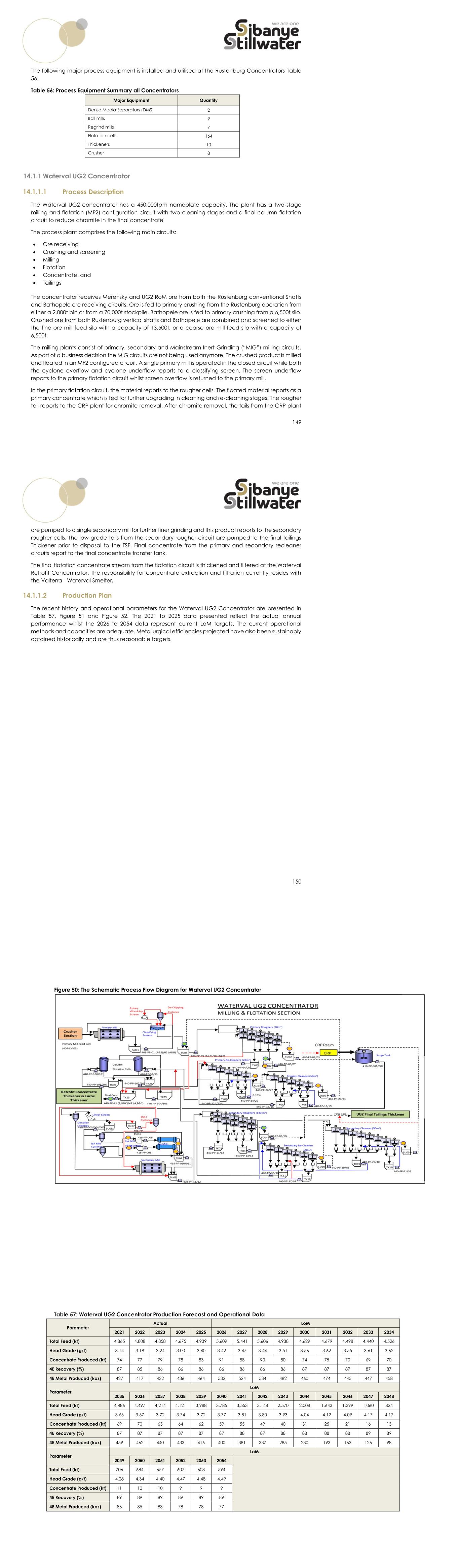 149 The following major process equipment is installed and utilised at the Rustenburg Concentrators Table 56. Table 56: Process Equipment Summary all Concentrators Major Equipment Quantity Dense Media Separators (DMS) 2 Ball mills 9 Regrind mills 7 Flotation cells 164 Thickeners 10 Crusher 8 14.1.1 Waterval UG2 Concentrator 14.1.1.1 Process Description The Waterval UG2 concentrator has a 450,000tpm nameplate capacity. The plant has a two-stage milling and flotation (MF2) configuration circuit with two cleaning stages and a final column flotation circuit to reduce chromite in the final concentrate The process plant comprises the following main circuits: • Ore receiving • Crushing and screening • Milling • Flotation • Concentrate, and • Tailings The concentrator receives Merensky and UG2 RoM ore from both the Rustenburg conventional Shafts and Bathopele ore receiving circuits. Ore is fed to primary crushing from the Rustenburg operation from either a 2,000t bin or from a 70,000t stockpile. Bathopele ore is fed to primary crushing from a 6,500t silo. Crushed ore from both Rustenburg vertical shafts and Bathopele are combined and screened to either the fine ore mill feed silo with a capacity of 13,500t, or a coarse ore mill feed silo with a capacity of 6,500t. The milling plants consist of primary, secondary and Mainstream Inert Grinding (“MIG”) milling circuits. As part of a business decision the MIG circuits are not being used anymore. The crushed product is milled and floated in an MF2 configured circuit. A single primary mill is operated in the closed circuit while both the cyclone overflow and cyclone underflow reports to a classifying screen. The screen underflow reports to the primary flotation circuit whilst screen overflow is returned to the primary mill. In the primary flotation circuit, the material reports to the rougher cells. The floated material reports as a primary concentrate which is fed for further upgrading in cleaning and re-cleaning stages. The rougher tail reports to the CRP plant for chromite removal. After chromite removal, the tails from the CRP plant 150 are pumped to a single secondary mill for further finer grinding and this product reports to the secondary rougher cells. The low-grade tails from the secondary rougher circuit are pumped to the final tailings Thickener prior to disposal to the TSF. Final concentrate from the primary and secondary recleaner circuits report to the final concentrate transfer tank. The final flotation concentrate stream from the flotation circuit is thickened and filtered at the Waterval Retrofit Concentrator. The responsibility for concentrate extraction and filtration currently resides with the Valterra - Waterval Smelter. 14.1.1.2 Production Plan The recent history and operational parameters for the Waterval UG2 Concentrator are presented in Table 57, Figure 51 and Figure 52. The 2021 to 2025 data presented reflect the actual annual performance whilst the 2026 to 2054 data represent current LoM targets. The current operational methods and capacities are adequate. Metallurgical efficiencies projected have also been sustainably obtained historically and are thus reasonable targets. Figure 50: The Schematic Process Flow Diagram for Waterval UG2 Concentrator Table 57: Waterval UG2 Concentrator Production Forecast and Operational Data Parameter Actual LoM 2021 2022 2023 2024 2025 2026 2027 2028 2029 2030 2031 2032 2033 2034 Total Feed (kt) 4,865 4,808 4,858 4,675 4,939 5,609 5,441 5,606 4,938 4,629 4,679 4,498 4,440 4,526 Head Grade (g/t) 3.14 3.18 3.24 3.00 3.40 3.42 3.47 3.44 3.51 3.56 3.62 3.55 3.61 3.62 Concentrate Produced (kt) 74 77 79 78 83 91 88 90 80 74 75 70 69 70 4E Recovery (%) 87 85 86 86 86 86 86 86 86 87 87 87 87 87 4E Metal Produced (koz) 427 417 432 436 464 532 524 534 482 460 474 445 447 458 Parameter LoM 2035 2036 2037 2038 2039 2040 2041 2042 2043 2044 2045 2046 2047 2048 Total Feed (kt) 4,486 4,497 4,214 4,121 3,988 3,785 3,553 3,148 2,570 2,008 1,643 1,399 1,060 824 Head Grade (g/t) 3.66 3.67 3.72 3.74 3.72 3.77 3.81 3.80 3.93 4.04 4.12 4.09 4.17 4.17 Concentrate Produced (kt) 69 70 65 64 62 59 55 49 40 31 25 21 16 13 4E Recovery (%) 87 87 87 87 87 87 88 87 88 88 88 88 89 89 4E Metal Produced (koz) 459 462 440 433 416 400 381 337 285 230 193 163 126 98 Parameter LoM 2049 2050 2051 2052 2053 2054 Total Feed (kt) 706 684 657 607 608 594 Head Grade (g/t) 4.28 4.34 4.40 4.47 4.48 4.49 Concentrate Produced (kt) 11 10 10 9 9 9 4E Recovery (%) 89 89 89 89 89 89 4E Metal Produced (koz) 86 85 83 78 78 77