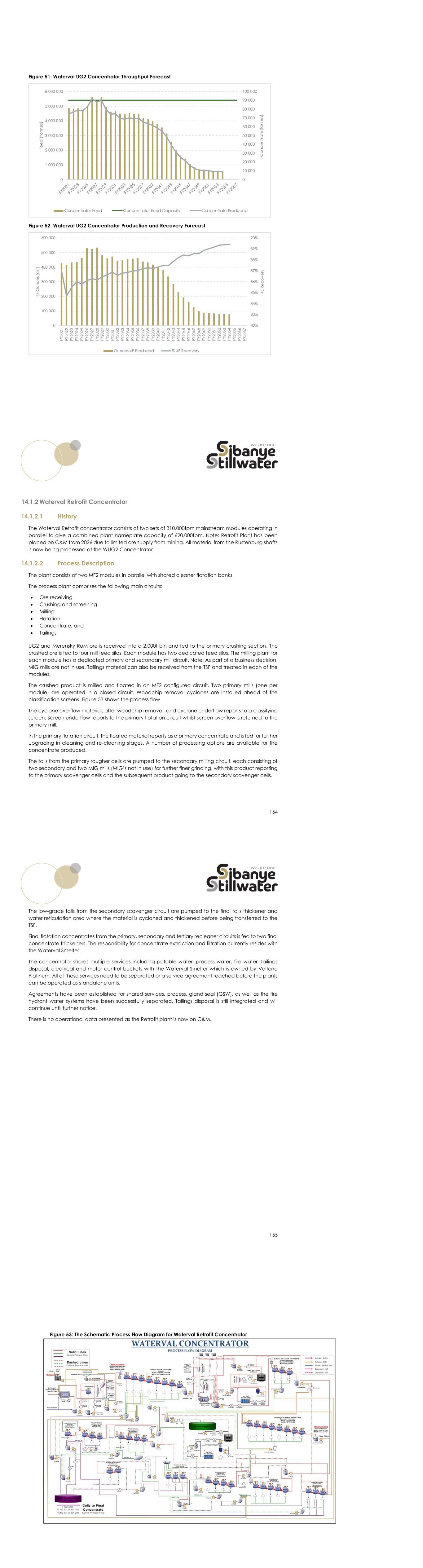 Figure 51: Waterval UG2 Concentrator Throughput Forecast Figure 52: Waterval UG2 Concentrator Production and Recovery Forecast 154 14.1.2 Waterval Retrofit Concentrator 14.1.2.1 History The Waterval Retrofit concentrator consists of two sets of 310,000tpm mainstream modules operating in parallel to give a combined plant nameplate capacity of 620,000tpm. Note: Retrofit Plant has been placed on C&M from 2026 due to limited ore supply from mining. All material from the Rustenburg shafts is now being processed at the WUG2 Concentrator. 14.1.2.2 Process Description The plant consists of two MF2 modules in parallel with shared cleaner flotation banks. The process plant comprises the following main circuits: • Ore receiving • Crushing and screening • Milling • Flotation • Concentrate, and • Tailings UG2 and Merensky RoM ore is received into a 2,000t bin and fed to the primary crushing section. The crushed ore is fed to four mill feed silos. Each module has two dedicated feed silos. The milling plant for each module has a dedicated primary and secondary mill circuit. Note: As part of a business decision, MIG mills are not in use. Tailings material can also be received from the TSF and treated in each of the modules. The crushed product is milled and floated in an MF2 configured circuit. Two primary mills (one per module) are operated in a closed circuit. Woodchip removal cyclones are installed ahead of the classification screens. Figure 53 shows the process flow. The cyclone overflow material, after woodchip removal, and cyclone underflow reports to a classifying screen. Screen underflow reports to the primary flotation circuit whilst screen overflow is returned to the primary mill. In the primary flotation circuit, the floated material reports as a primary concentrate and is fed for further upgrading in cleaning and re-cleaning stages. A number of processing options are available for the concentrate produced. The tails from the primary rougher cells are pumped to the secondary milling circuit, each consisting of two secondary and two MIG mills (MIG’s not in use) for further finer grinding, with this product reporting to the primary scavenger cells and the subsequent product going to the secondary scavenger cells. 155 The low-grade tails from the secondary scavenger circuit are pumped to the final tails thickener and water reticulation area where the material is cycloned and thickened before being transferred to the TSF. Final flotation concentrates from the primary, secondary and tertiary recleaner circuits is fed to two final concentrate thickeners. The responsibility for concentrate extraction and filtration currently resides with the Waterval Smelter. The concentrator shares multiple services including potable water, process water, fire water, tailings disposal, electrical and motor control buckets with the Waterval Smelter which is owned by Valterra Platinum. All of these services need to be separated or a service agreement reached before the plants can be operated as standalone units. Agreements have been established for shared services. process, gland seal (GSW), as well as the fire hydrant water systems have been successfully separated. Tailings disposal is still integrated and will continue until further notice. There is no operational data presented as the Retrofit plant is now on C&M. Figure 53: The Schematic Process Flow Diagram for Waterval Retrofit Concentrator