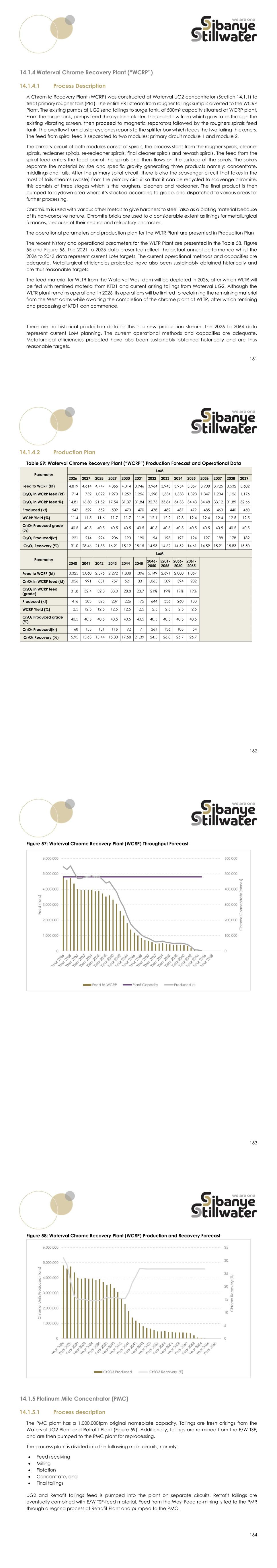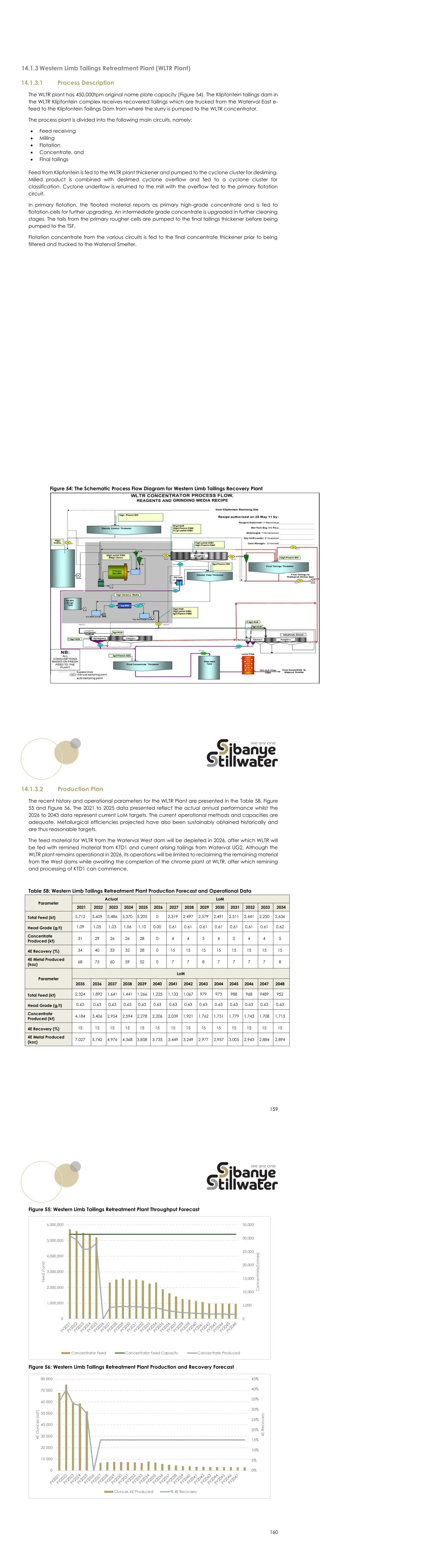 14.1.3 Western Limb Tailings Retreatment Plant (WLTR Plant) 14.1.3.1 Process Description The WLTR plant has 450,000tpm original name plate capacity (Figure 54). The Klipfontein tailings dam in the WLTR Klipfontein complex receives recovered tailings which are trucked from the Waterval East e- feed to the Klipfontein Tailings Dam from where the slurry is pumped to the WLTR concentrator. The process plant is divided into the following main circuits, namely: • Feed receiving • Milling • Flotation • Concentrate, and • Final tailings Feed from Klipfontein is fed to the WLTR plant thickener and pumped to the cyclone cluster for desliming. Milled product is combined with deslimed cyclone overflow and fed to a cyclone cluster for classification. Cyclone underflow is returned to the mill with the overflow fed to the primary flotation circuit. In primary flotation, the floated material reports as primary high-grade concentrate and is fed to flotation cells for further upgrading. An intermediate grade concentrate is upgraded in further cleaning stages. The tails from the primary rougher cells are pumped to the final tailings thickener before being pumped to the TSF. Flotation concentrate from the various circuits is fed to the final concentrate thickener prior to being filtered and trucked to the Waterval Smelter. Figure 54: The Schematic Process Flow Diagram for Western Limb Tailings Recovery Plant 159 14.1.3.2 Production Plan The recent history and operational parameters for the WLTR Plant are presented in the Table 58, Figure 55 and Figure 56. The 2021 to 2025 data presented reflect the actual annual performance whilst the 2026 to 2043 data represent current LoM targets. The current operational methods and capacities are adequate. Metallurgical efficiencies projected have also been sustainably obtained historically and are thus reasonable targets. The feed material for WLTR from the Waterval West dam will be depleted in 2026, after which WLTR will be fed with remined material from KTD1 and current arising tailings from Waterval UG2. Although the WLTR plant remains operational in 2026, its operations will be limited to reclaiming the remaining material from the West dams while awaiting the completion of the chrome plant at WLTR, after which remining and processing of KTD1 can commence. Table 58: Western Limb Tailings Retreatment Plant Production Forecast and Operational Data Parameter Actual LoM 2021 2022 2023 2024 2025 2026 2027 2028 2029 2030 2031 2032 2033 2034 Total Feed (kt) 5,712 5,609 5,486 5,370 5,205 0 2,319 2 497 2,579 2,491 2,511 2,441 2,250 2,636 Head Grade (g/t) 1.09 1.05 1.03 1.06 1.10 0.00 0.61 0.61 0.61 0.61 0.61 0.61 0.61 0.62 Concentrate Produced (kt) 31 29 26 26 28 0 4 4 5 4 5 4 4 5 4E Recovery (%) 34 40 33 32 28 0 15 15 15 15 15 15 15 15 4E Metal Produced (koz) 68 75 60 59 52 0 7 7 8 7 7 7 7 8 Parameter LoM 2035 2036 2037 2038 2039 2040 2041 2042 2043 2044 2045 2046 2047 2048 Total Feed (kt) 2,324 1,892 1,641 1,441 1,266 1,225 1,133 1,067 979 973 988 968 9489 952 Head Grade (g/t) 0.63 0.63 0.63 0.63 0.63 0.63 0.63 0.63 0.63 0.63 0.63 0.63 0.63 0.63 Concentrate Produced (kt) 4,184 3,406 2,954 2,594 2,278 2,206 2,039 1,921 1,762 1,751 1,779 1,743 1,708 1,713 4E Recovery (%) 15 15 15 15 15 15 15 15 15 15 15 15 15 15 4E Metal Produced (koz) 7,027 5,742 4,976 4,368 3,858 3,735 3,449 3,249 2,977 2,957 3,005 2,943 2,884 2,894 160 Figure 55: Western Limb Tailings Retreatment Plant Throughput Forecast Figure 56: Western Limb Tailings Retreatment Plant Production and Recovery Forecast