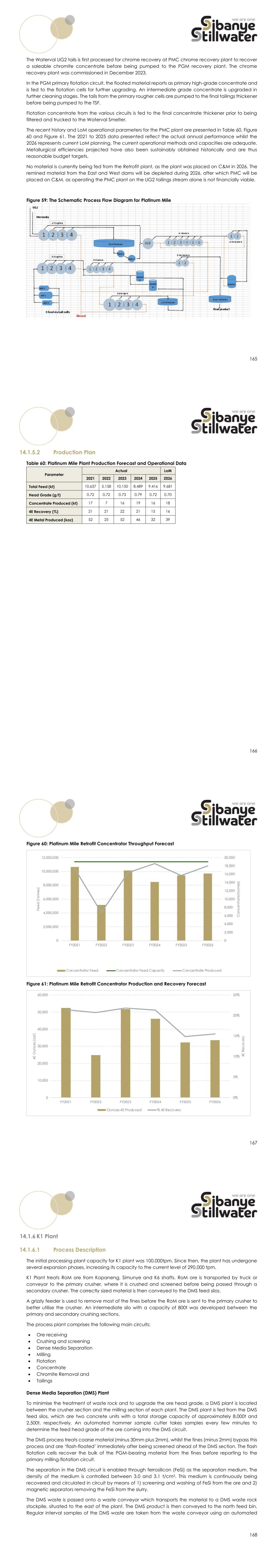 165 The Waterval UG2 tails is first processed for chrome recovery at PMC chrome recovery plant to recover a saleable chromite concentrate before being pumped to the PGM recovery plant. The chrome recovery plant was commissioned in December 2023. In the PGM primary flotation circuit, the floated material reports as primary high-grade concentrate and is fed to the flotation cells for further upgrading. An intermediate grade concentrate is upgraded in further cleaning stages. The tails from the primary rougher cells are pumped to the final tailings thickener before being pumped to the TSF. Flotation concentrate from the various circuits is fed to the final concentrate thickener prior to being filtered and trucked to the Waterval Smelter. The recent history and LoM operational parameters for the PMC plant are presented in Table 60, Figure 60 and Figure 61. The 2021 to 2025 data presented reflect the actual annual performance whilst the 2026 represents current LoM planning. The current operational methods and capacities are adequate. Metallurgical efficiencies projected have also been sustainably obtained historically and are thus reasonable budget targets. No material is currently being fed from the Retrofit plant, as the plant was placed on C&M in 2026. The remined material from the East and West dams will be depleted during 2026, after which PMC will be placed on C&M, as operating the PMC plant on the UG2 tailings stream alone is not financially viable. Figure 59: The Schematic Process Flow Diagram for Platinum Mile 166 14.1.5.2 Production Plan Table 60: Platinum Mile Plant Production Forecast and Operational Data Parameter Actual LoM 2021 2022 2023 2024 2025 2026 Total Feed (kt) 10,637 5,158 10,150 8,489 9,416 9,681 Head Grade (g/t) 0.72 0.72 0.73 0.79 0.72 0.70 Concentrate Produced (kt) 17 7 16 19 16 18 4E Recovery (%) 21 21 22 21 15 16 4E Metal Produced (koz) 52 25 52 46 32 39 167 Figure 60: Platinum Mile Retrofit Concentrator Throughput Forecast Figure 61: Platinum Mile Retrofit Concentrator Production and Recovery Forecast 168 14.1.6 K1 Plant 14.1.6.1 Process Description The initial processing plant capacity for K1 plant was 100,000tpm. Since then, the plant has undergone several expansion phases, increasing its capacity to the current level of 290,000 tpm. K1 Plant treats RoM ore from Kopaneng, Simunye and K6 shafts. RoM ore is transported by truck or conveyor to the primary crusher, where it is crushed and screened before being passed through a secondary crusher. The correctly sized material is then conveyed to the DMS feed silos. A grizzly feeder is used to remove most of the fines before the RoM ore is sent to the primary crusher to better utilise the crusher. An intermediate silo with a capacity of 800t was developed between the primary and secondary crushing sections. The process plant comprises the following main circuits: • Ore receiving • Crushing and screening • Dense Media Separation • Milling • Flotation • Concentrate • Chromite Removal and • Tailings Dense Media Separation (DMS) Plant To minimise the treatment of waste rock and to upgrade the ore head grade, a DMS plant is located between the crusher section and the milling section of each plant. The DMS plant is fed from the DMS feed silos, which are two concrete units with a total storage capacity of approximately 8,000t and 2,500t, respectively. An automated hammer sample cutter takes samples every few minutes to determine the feed head grade of the ore coming into the DMS circuit. The DMS process treats coarse material (minus 30mm plus 2mm), whilst the fines (minus 2mm) bypass this process and are ‘flash-floated’ immediately after being screened ahead of the DMS section. The flash flotation cells recover the bulk of the PGM-bearing material from the fines before reporting to the primary milling-flotation circuit. The separation in the DMS circuit is enabled through ferrosilicon (FeSi) as the separation medium. The density of the medium is controlled between 3.0 and 3.1 t/cm3. This medium is continuously being recovered and circulated in circuit by means of 1) screening and washing of FeSi from the ore and 2) magnetic separators removing the FeSi from the slurry. The DMS waste is passed onto a waste conveyor which transports the material to a DMS waste rock stockpile, situated to the east of the plant. The DMS product is then conveyed to the north feed bin. Regular interval samples of the DMS waste are taken from the waste conveyor using an automated