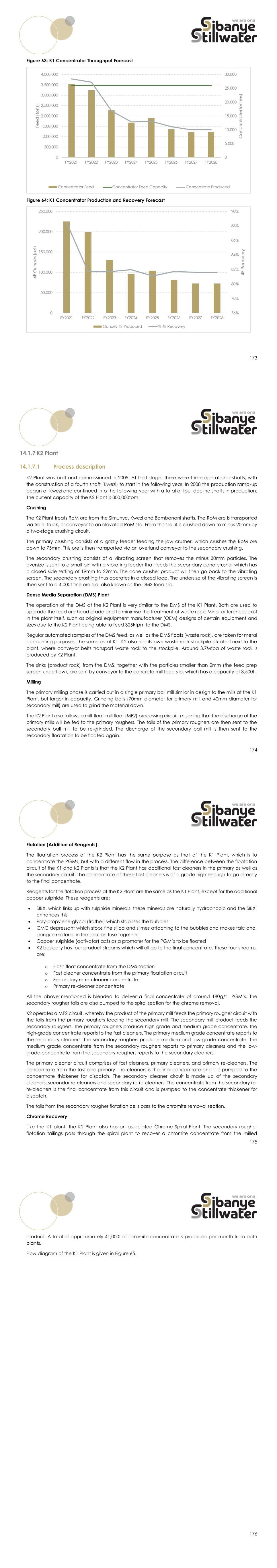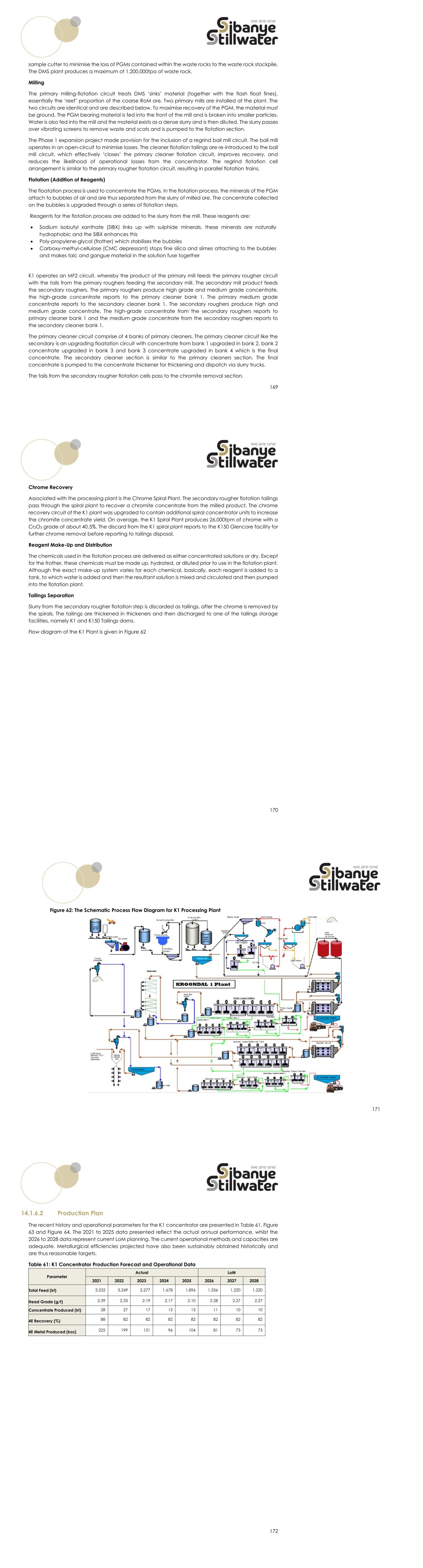 169 sample cutter to minimise the loss of PGMs contained within the waste rocks to the waste rock stockpile. The DMS plant produces a maximum of 1,200,000tpa of waste rock. Milling The primary milling-flotation circuit treats DMS ‘sinks’ material (together with the flash float fines), essentially the ‘reef’ proportion of the coarse RoM ore. Two primary mills are installed at the plant. The two circuits are identical and are described below. To maximise recovery of the PGM, the material must be ground. The PGM bearing material is fed into the front of the mill and is broken into smaller particles. Water is also fed into the mill and the material exists as a dense slurry and is then diluted. The slurry passes over vibrating screens to remove waste and scats and is pumped to the flotation section. The Phase 1 expansion project made provision for the inclusion of a regrind ball mill circuit. The ball mill operates in an open-circuit to minimise losses. The cleaner flotation tailings are re-introduced to the ball mill circuit, which effectively ‘closes’ the primary cleaner flotation circuit, improves recovery, and reduces the likelihood of operational losses from the concentrator. The regrind flotation cell arrangement is similar to the primary rougher flotation circuit, resulting in parallel flotation trains. Flotation (Addition of Reagents) The floatation process is used to concentrate the PGMs. In the flotation process, the minerals of the PGM attach to bubbles of air and are thus separated from the slurry of milled ore. The concentrate collected on the bubbles is upgraded through a series of flotation steps. Reagents for the flotation process are added to the slurry from the mill. These reagents are: • Sodium isobutyl xanthate (SIBX) links up with sulphide minerals, these minerals are naturally hydrophobic and the SIBX enhances this • Poly-propylene-glycol (frother) which stabilises the bubbles • Carboxy-methyl-cellulose (CMC depressant) stops fine silica and slimes attaching to the bubbles and makes talc and gangue material in the solution fuse together K1 operates an MF2 circuit, whereby the product of the primary mill feeds the primary rougher circuit with the tails from the primary roughers feeding the secondary mill. The secondary mill product feeds the secondary roughers. The primary roughers produce high grade and medium grade concentrate, the high-grade concentrate reports to the primary cleaner bank 1. The primary medium grade concentrate reports to the secondary cleaner bank 1. The secondary roughers produce high and medium grade concentrate. The high-grade concentrate from the secondary roughers reports to primary cleaner bank 1 and the medium grade concentrate from the secondary roughers reports to the secondary cleaner bank 1. The primary cleaner circuit comprise of 4 banks of primary cleaners. The primary cleaner circuit like the secondary is an upgrading floatation circuit with concentrate from bank 1 upgraded in bank 2, bank 2 concentrate upgraded in bank 3 and bank 3 concentrate upgraded in bank 4 which is the final concentrate. The secondary cleaner section is similar to the primary cleaners section. The final concentrate is pumped to the concentrate thickener for thickening and dispatch via slurry trucks. The tails from the secondary rougher flotation cells pass to the chromite removal section. 170 Chrome Recovery Associated with the processing plant is the Chrome Spiral Plant. The secondary rougher flotation tailings pass through the spiral plant to recover a chromite concentrate from the milled product. The chrome recovery circuit of the K1 plant was upgraded to contain additional spiral concentrator units to increase the chromite concentrate yield. On average, the K1 Spiral Plant produces 26,000tpm of chrome with a Cr2O3 grade of about 40.5%. The discard from the K1 spiral plant reports to the K150 Glencore facility for further chrome removal before reporting to tailings disposal. Reagent Make-Up and Distribution The chemicals used in the flotation process are delivered as either concentrated solutions or dry. Except for the frother, these chemicals must be made up, hydrated, or diluted prior to use in the flotation plant. Although the exact make-up system varies for each chemical, basically, each reagent is added to a tank, to which water is added and then the resultant solution is mixed and circulated and then pumped into the flotation plant. Tailings Separation Slurry from the secondary rougher flotation step is discarded as tailings, after the chrome is removed by the spirals. The tailings are thickened in thickeners and then discharged to one of the tailings storage facilities, namely K1 and K150 Tailings dams. Flow diagram of the K1 Plant is given in Figure 62 171 Figure 62: The Schematic Process Flow Diagram for K1 Processing Plant 172 14.1.6.2 Production Plan The recent history and operational parameters for the K1 concentrator are presented in Table 61, Figure 63 and Figure 64. The 2021 to 2025 data presented reflect the actual annual performance, whilst the 2026 to 2028 data represent current LoM planning. The current operational methods and capacities are adequate. Metallurgical efficiencies projected have also been sustainably obtained historically and are thus reasonable targets. Table 61: K1 Concentrator Production Forecast and Operational Data Parameter Actual LoM 2021 2022 2023 2024 2025 2026 2027 2028 Total Feed (kt) 3,532 3,249 2,277 1,678 1,896 1,356 1,220 1,220 Head Grade (g/t) 2.39 2.33 2.19 2.17 2.10 2.28 2.27 2.27 Concentrate Produced (kt) 28 27 17 13 13 11 10 10 4E Recovery (%) 88 82 82 82 82 82 82 82 4E Metal Produced (koz) 225 199 131 96 104 81 73 73