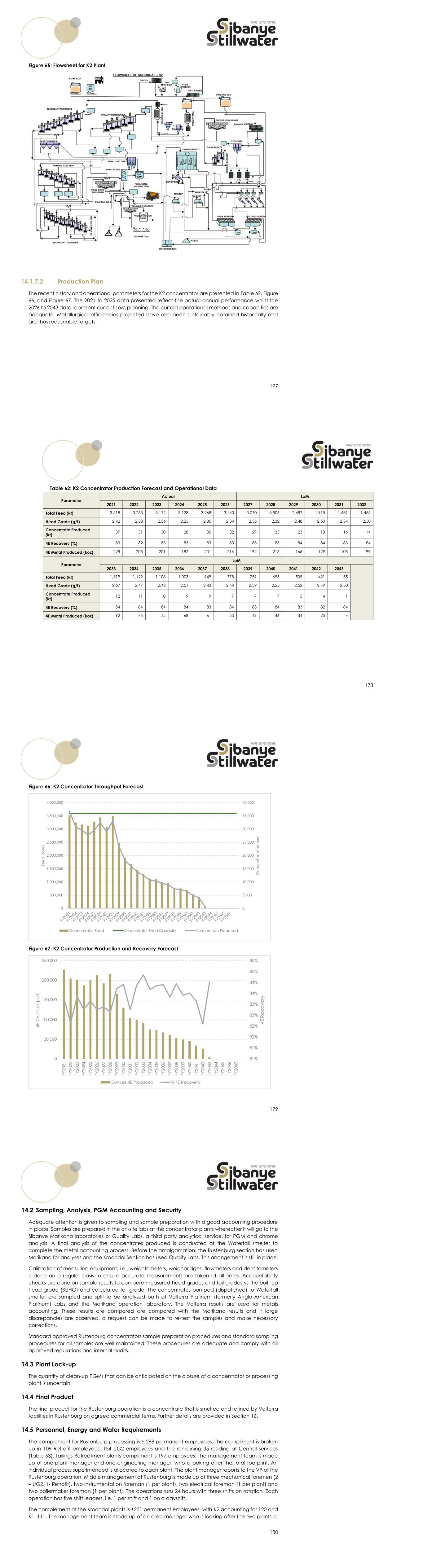 177 Figure 65: Flowsheet for K2 Plant 14.1.7.2 Production Plan The recent history and operational parameters for the K2 concentrator are presented in Table 62, Figure 66, and Figure 67. The 2021 to 2025 data presented reflect the actual annual performance whilst the 2026 to 2043 data represent current LoM planning. The current operational methods and capacities are adequate. Metallurgical efficiencies projected have also been sustainably obtained historically and are thus reasonable targets. 178 Table 62: K2 Concentrator Production Forecast and Operational Data Parameter Actual LoM 2021 2022 2023 2024 2025 2026 2027 2028 2029 2030 2031 2032 Total Feed (kt) 3,518 3,253 3,172 3,128 3,268 3,440 3,070 3,506 2,487 1,915 1,681 1,465 Head Grade (g/t) 2.42 2.38 2.36 2.25 2.30 2.34 2.35 2.32 2.48 2.50 2.34 2.50 Concentrate Produced (kt) 37 31 30 28 30 32 29 33 23 18 16 14 4E Recovery (%) 83 82 83 83 83 83 83 83 84 84 83 84 4E Metal Produced (koz) 228 205 201 187 201 214 192 216 166 129 105 99 Parameter LoM 2033 2034 2035 2036 2037 2038 2039 2040 2041 2042 2043 Total Feed (kt) 1,319 1,129 1,108 1,003 949 778 759 695 535 421 55 Head Grade (g/t) 2.57 2.47 2.42 2.51 2.43 2.44 2.39 2.25 2.52 2.49 2.50 Concentrate Produced (kt) 12 11 10 9 9 7 7 7 5 4 1 4E Recovery (%) 84 84 84 84 83 84 83 84 83 82 84 4E Metal Produced (koz) 92 75 75 68 61 53 49 46 34 25 4 179 Figure 66: K2 Concentrator Throughput Forecast Figure 67: K2 Concentrator Production and Recovery Forecast 180 14.2 Sampling, Analysis, PGM Accounting and Security Adequate attention is given to sampling and sample preparation with a good accounting procedure in place. Samples are prepared in the on-site labs at the concentrator plants whereafter it will go to the Sibanye Marikana laboratories or Quality Labs, a third party analytical service, for PGM and chrome analysis. A final analysis of the concentrates produced is conducted at the Waterfall smelter to complete the metal accounting process. Before the amalgamation, the Rustenburg section has used Marikana for analyses and the Kroondal Section has used Quality Labs. This arrangement is still in place. Calibration of measuring equipment, i.e., weightometers, weighbridges, flowmeters and densitometers is done on a regular basis to ensure accurate measurements are taken at all times. Accountability checks are done on sample results to compare measured head grades and tail grades vs the built-up head grade (BUHG) and calculated tail grade. The concentrates pumped (dispatched) to Waterfall smelter are sampled and split to be analysed both at Valterra Platinum (formerly Anglo-American Platinum) Labs and the Marikana operation laboratory. The Valterra results are used for metals accounting. These results are compared are compared with the Marikana results and if large discrepancies are observed, a request can be made to re-test the samples and make necessary corrections. Standard approved Rustenburg concentrators sample preparation procedures and standard sampling procedures for all samples are well maintained. These procedures are adequate and comply with all approved regulations and internal audits. 14.3 Plant Lock-up The quantity of clean-up PGMs that can be anticipated on the closure of a concentrator or processing plant is uncertain. 14.4 Final Product The final product for the Rustenburg operation is a concentrate that is smelted and refined by Valterra facilities in Rustenburg on agreed commercial terms. Further details are provided in Section 16. 14.5 Personnel, Energy and Water Requirements The complement for Rustenburg processing is ± 298 permanent employees. The compliment is broken up in 109 Retrofit employees, 154 UG2 employees and the remaining 35 residing at Central services (Table 63). Tailings Retreatment plants compliment is 197 employees. The management team is made up of one plant manager and one engineering manager, who is looking after the total footprint. An individual process superintended is allocated to each plant. The plant manager reports to the VP of the Rustenburg operation. Middle management at Rustenburg is made up of three mechanical foremen (2 – UG2, 1- Retrofit), two Instrumentation foreman (1 per plant), two electrical foreman (1 per plant) and two boilermaker foreman (1 per plant). The operations runs 24 hours with three shifts on rotation. Each operation has five shift leaders, i.e. 1 per shift and 1 on a dayshift. The complement at the Kroondal plants is ±231 permanent employees, with K2 accounting for 120 and K1, 111. The management team is made up of an area manager who is looking after the two plants, a