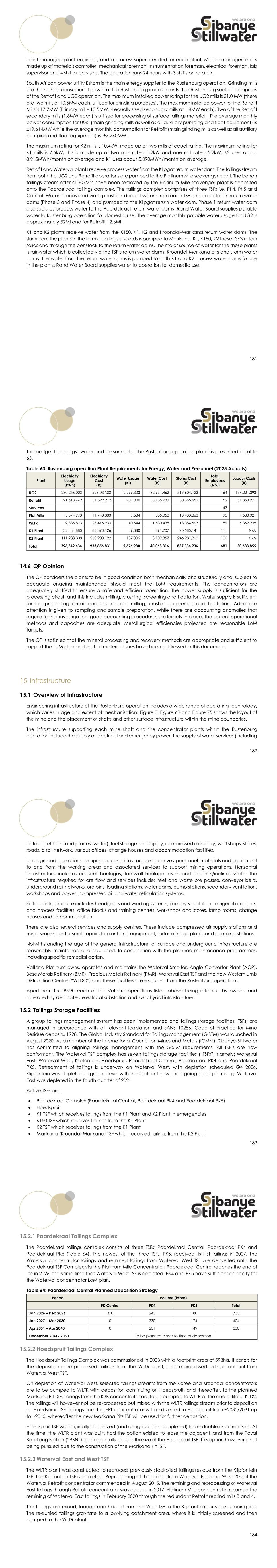 181 plant manager, plant engineer, and a process superintended for each plant. Middle management is made up of materials controller, mechanical foreman, Instrumentation foreman, electrical foreman, lab supervisor and 4 shift supervisors. The operation runs 24 hours with 3 shifts on rotation. South African power utility Eskom is the main energy supplier to the Rustenburg operation. Grinding mills are the highest consumer of power at the Rustenburg process plants. The Rustenburg section comprises of the Retrofit and UG2 operation. The maximum installed power rating for the UG2 mills is 21.0 MW (there are two mills of 10.5Mw each, utilised for grinding purposes). The maximum installed power for the Retrofit Mills is 17.7MW (Primary mill – 10.5MW, 4 equally sized secondary mills at 1.8MW each). Two of the Retrofit secondary mills (1.8MW each) is utilised for processing of surface tailings material). The average monthly power consumption for UG2 (main grinding mills as well as all auxiliary pumping and float equipment) is ±19,614MW while the average monthly consumption for Retrofit (main grinding mills as well as all auxiliary pumping and float equipment) is ±7,740MW . The maximum rating for K2 mills is 10.4kW, made up of two mills of equal rating. The maximum rating for K1 mills is 7.6kW, this is made up of two mills rated 1.2kW and one mill rated 5.2kW. K2 uses about 8,915MWh/month on average and K1 uses about 5,090MWh/month on average. Retrofit and Waterval plants receive process water from the Klipgat return water dam. The tailings stream from both the UG2 and Retrofit operations are pumped to the Platinum Mile scavenger plant. The barren tailings stream after all PGM’s have been removed by the Platinum Mile scavenger plant is deposited onto the Paardekraal tailings complex. The tailings complex comprises of three TSFs i.e. PK4, PK5 and Central. Water is recovered via a penstock decant system from each TSF and collected in return water dams (Phase 3 and Phase 4) and pumped to the Klipgat return water dam. Phase 1 return water dam also supplies process water to the Paardekraal return water dams. Rand Water Board supplies potable water to Rustenburg operation for domestic use. The average monthly potable water usage for UG2 is approximately 32Ml and for Retrofit 12.6Ml. K1 and K2 plants receive water from the K150, K1, K2 and Kroondal-Marikana return water dams. The slurry from the plants in the form of tailings discards is pumped to Marikana, K1, K150, K2 these TSF’s retain solids and through the penstock to the return water dams. The major source of water for the these plants is rainwater which is collected via the TSF’s return water dams, Kroondal-Marikana pits and storm water dams. The water from the return water dams is pumped to both K1 and K2 process water dams for use in the plants. Rand Water Board supplies water to operation for domestic use. 182 The budget for energy, water and personnel for the Rustenburg operation plants is presented in Table 63. Table 63: Rustenburg operation Plant Requirements for Energy, Water and Personnel (2025 Actuals) Plant Electricity Usage (kWh) Electricity Cost (R) Water Usage (Kl) Water Cost (R) Stores Cost (R) Total Employees (No.) Labour Costs (R) UG2 230,256,003 528,037,30 2,299,303 32,931,462 519,604,123 164 134,221,393 Retrofit 21,618,442 61,529,212 201,000 3,135,789 30,865,652 59 51,353,971 Services 43 Plat Mile 5,574,973 11,748,883 9,684 335,058 18,433,863 95 4,633,021 WLTR 9,385,813 23,416,933 40,544 1,530,438 13,384,563 89 6,362,239 K1 Plant 32,484,883 83,390,126 39,380 891,707 90,585,141 111 N/A K2 Plant 111,983,308 260,900,192 137,305 3,109,357 246,281,319 120 N/A Total 396,342,636 933,856,831 2,676,988 40,068,316 887,336,236 681 30,683,855 14.6 QP Opinion The QP considers the plants to be in good condition both mechanically and structurally and, subject to adequate ongoing maintenance, should meet the LoM requirements. The concentrators are adequately staffed to ensure a safe and efficient operation. The power supply is sufficient for the processing circuit and this includes milling, crushing, screening and floatation. Water supply is sufficient for the processing circuit and this includes milling, crushing, screening and floatation. Adequate attention is given to sampling and sample preparation. While there are accounting anomalies that require further investigation, good accounting procedures are largely in place. The current operational methods and capacities are adequate. Metallurgical efficiencies projected are reasonable LoM targets. The QP is satisfied that the mineral processing and recovery methods are appropriate and sufficient to support the LoM plan and that all material issues have been addressed in this document. 15 Infrastructure 15.1 Overview of Infrastructure Engineering infrastructure at the Rustenburg operation includes a wide range of operating technology, which varies in age and extent of mechanisation. Figure 3, Figure 68 and Figure 75 shows the layout of the mine and the placement of shafts and other surface infrastructure within the mine boundaries. The infrastructure supporting each mine shaft and the concentrator plants within the Rustenburg operation include the supply of electrical and emergency power, the supply of water services (including 183 potable, effluent and process water), fuel storage and supply, compressed air supply, workshops, stores, roads, a rail network, various offices, change houses and accommodation facilities. Underground operations comprise access infrastructure to convey personnel, materials and equipment to and from the working areas and associated services to support mining operations. Horizontal infrastructure includes crosscut haulages, footwall haulage levels and declines/inclines shafts. The infrastructure required for ore flow and services includes reef and waste ore passes, conveyor belts, underground rail networks, ore bins, loading stations, water dams, pump stations, 