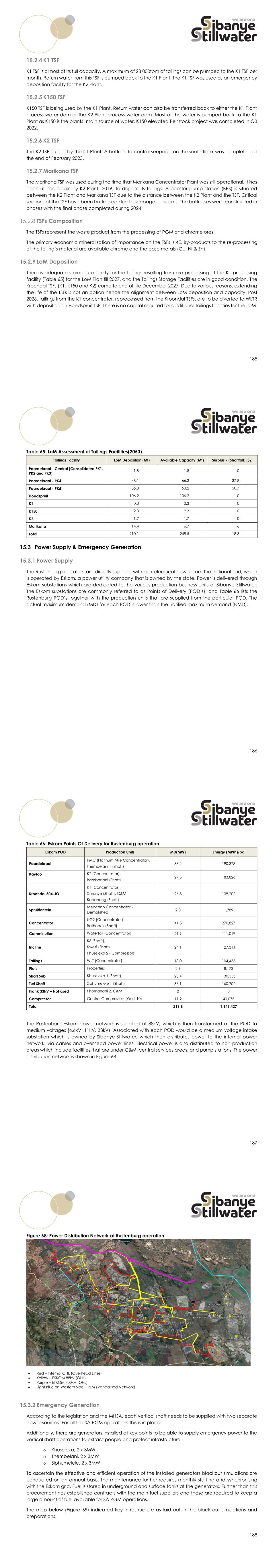 185 15.2.4 K1 TSF K1 TSF is almost at its full capacity. A maximum of 28,000tpm of tailings can be pumped to the K1 TSF per month. Return water from this TSF is pumped back to the K1 Plant. The K1 TSF was used as an emergency deposition facility for the K2 Plant. 15.2.5 K150 TSF K150 TSF is being used by the K1 Plant. Return water can also be transferred back to either the K1 Plant process water dam or the K2 Plant process water dam. Most of the water is pumped back to the K1 Plant as K150 is the plants’ main source of water. K150 elevated Penstock project was completed in Q3 2022. 15.2.6 K2 TSF The K2 TSF is used by the K1 Plant. A buttress to control seepage on the south flank was completed at the end of February 2023. 15.2.7 Marikana TSF The Marikana TSF was used during the time that Marikana Concentrator Plant was still operational. It has been utilised again by K2 Plant (2019) to deposit its tailings. A booster pump station (BPS) is situated between the K2 Plant and Marikana TSF due to the distance between the K2 Plant and the TSF. Critical sections of the TSF have been buttressed due to seepage concerns. The buttresses were constructed in phases with the final phase completed during 2024. 15.2.8 TSFs Composition The TSFs represent the waste product from the processing of PGM and chrome ores. The primary economic mineralisation of importance on the TSFs is 4E. By-products to the re-processing of the tailing’s material are available chrome and the base metals (Cu, Ni & Zn). 15.2.9 LoM Deposition There is adequate storage capacity for the tailings resulting from ore processing at the K1 processing facility (Table 65) for the LoM Plan till 2027, and the Tailings Storage Facilities are in good condition. The Kroondal TSFs (K1, K150 and K2) come to end of life December 2027. Due to various reasons, extending the life of the TSFs is not an option hence the alignment between LoM deposition and capacity. Post 2026, tailings from the K1 concentrator, reprocessed from the Kroondal TSFs, are to be diverted to WLTR with deposition on Hoedspruit TSF. There is no capital required for additional tailings facilities for the LoM. 186 Table 65: LoM Assessment of Tailings Facilities(2050) Tailings Facility LoM Deposition (Mt) Available Capacity (Mt) Surplus / (Shortfall) (%) Paardekraal - Central (Consolidated PK1, PK2 and PK3) 1.8 1.8 0 Paardekraal - PK4 48.1 66.3 37.8 Paardekraal - PK5 35.3 53.2 50.7 Hoedspruit 106.2 106.2 0 K1 0.3 0.3 0 K150 2.3 2.3 0 K2 1.7 1.7 0 Marikana 14.4 16.7 16 Total 210.1 248.5 18.3 15.3 Power Supply & Emergency Generation 15.3.1 Power Supply The Rustenburg operation are directly supplied with bulk electrical power from the national grid, which is operated by Eskom, a power utility company that is owned by the state. Power is delivered through Eskom substations which are dedicated to the various production business units of Sibanye-Stillwater. The Eskom substations are commonly referred to as Points of Delivery (POD’s), and Table 66 lists the Rustenburg POD’s together with the production units that are supplied from the particular POD. The actual maximum demand (MD) for each POD is lower than the notified maximum demand (NMD). 187 Table 66: Eskom Points Of Delivery for Rustenburg operation. Eskom POD Production Units MD(MW) Energy (MWh)/pa Paardekraal PMC (Platinum Mile Concentrator), Thembelani 1 (Shaft) 33.2 190,328 Kaytoo K2 (Concentrator), Bambanani (Shaft) 27.5 183,826 Kroondal 304-JQ K1 (Concentrator), Simunye (Shaft), C&M Kopaneng (Shaft) 26.8 139,202 Spruitfontein Meccano Concentrator - Demolished 2.0 1,789 Concentrator UG2 (Concentrator) Bathopele Shaft) 41.3 270,827 Comminution Waterfall (Concentrator) 21.9 111,019 Incline K6 (Shaft), Kwezi (Shaft) Khuseleka 2 - Compressors 24.1 127,311 Tailings WLT (Concentrator) 18.0 104,435 Plats Properties 2.6 8,173 Shaft Sub Khuseleka 1 (Shaft) 25.4 130,553 Turf Shaft Siphumelele 1 (Shaft) 36.1 160,702 Frank 33kV – Not used Khomanani 2, C&M 0 0 Compressor Central Compressors (West 10) 11.2 40,075 Total 213.8 1,143,427 The Rustenburg Eskom power network is supplied at 88kV, which is then transformed at the POD to medium voltages (6.6kV, 11kV, 33kV). Associated with each POD would be a medium voltage intake substation which is owned by Sibanye-Stillwater, which then distributes power to the internal power network, via cables and overhead power lines. Electrical power is also distributed to non-production areas which include facilities that are under C&M, central services areas, and pump stations. The power distribution network is shown in Figure 68. 188 Figure 68: Power Distribution Network at Rustenburg operation • Red – Internal OHL (Overhead Lines) • Yellow – ESKOM 88kV (OHL) • Purple – ESKOM 400kV (OHL) • Light Blue on Western Side – RLM (Vandalised Network) 15.3.2 Emergency Generation According to the legislation and the MHSA, each vertical shaft needs to be supplied with two separate power sources. For all the SA PGM operations this is in place. Additionally, there are generators installed at key points to be able to supply emergency power to the vertical shaft operations to extract people and protect infrastructure. o Khuseleka, 2 x 3MW o Thembelani, 2 x 3MW o Siphumelele, 2 x 3MW To ascertain the effective and efficient operation of the installed generators blackout simulations are conducted on an annual basis. The maintenance further requires monthly starting and synchronising with the Eskom grid. Fuel is stored in underground and surface tanks at the generators. Further than this procurement has established contracts with the main fuel suppliers and these are required to keep a large amount of fuel available for SA PGM operations. The map below (Figure 69) indicated key infrastructure as laid out in the black out simulations and preparations.