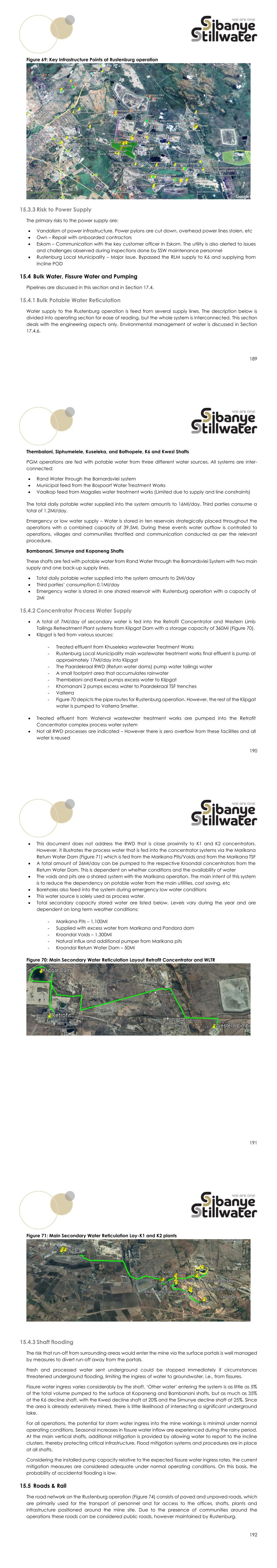 189 Figure 69: Key Infrastructure Points at Rustenburg operation 15.3.3 Risk to Power Supply The primary risks to the power supply are: • Vandalism of power infrastructure. Power pylons are cut down, overhead power lines stolen, etc • Own – Repair with onboarded contractors • Eskom – Communication with the key customer officer in Eskom. The utility is also alerted to issues and challenges observed during inspections done by SSW maintenance personnel • Rustenburg Local Municipality – Major issue. Bypassed the RLM supply to K6 and supplying from Incline POD 15.4 Bulk Water, Fissure Water and Pumping Pipelines are discussed in this section and in Section 17.4. 15.4.1 Bulk Potable Water Reticulation Water supply to the Rustenburg operation is feed from several supply lines. The description below is divided into operating section for ease of reading, but the whole system is interconnected. This section deals with the engineering aspects only. Environmental management of water is discussed in Section 17.4.6. 190 Thembalani, Siphumelele, Kuseleka, and Bathopele, K6 and Kwezi Shafts PGM operations are fed with potable water from three different water sources. All systems are inter- connected: • Rand Water through the Barnardsvlei system • Municipal feed from the Bospoort Water Treatment Works • Vaalkop feed from Magalies water treatment works (Limited due to supply and line constraints) The total daily potable water supplied into the system amounts to 16Ml/day. Third parties consume a total of 1.2Ml/day. Emergency or low water supply – Water is stored in ten reservoirs strategically placed throughout the operations with a combined capacity of 39.5Ml. During these events water outflow is controlled to operations, villages and communities throttled and communication conducted as per the relevant procedure. Bambanani, Simunye and Kopaneng Shafts These shafts are fed with potable water from Rand Water through the Barnardsvlei System with two main supply and one back-up supply lines. • Total daily potable water supplied into the system amounts to 2Ml/day • Third parties’ consumption 0.1Ml/day • Emergency water is stored in one shared reservoir with Rustenburg operation with a capacity of 2Ml 15.4.2 Concentrator Process Water Supply • A total of 7Ml/day of secondary water is fed into the Retrofit Concentrator and Western Limb Tailings Retreatment Plant systems from Klipgat Dam with a storage capacity of 360Ml (Figure 70). • Klipgat is fed from various sources: - Treated effluent from Khuseleka wastewater Treatment Works - Rustenburg Local Municipality main wastewater treatment works final effluent is pump at approximately 17Ml/day into Klipgat - The Paardekraal RWD (Return water dams) pump water tailings water - A small footprint area that accumulates rainwater - Thembelani and Kwezi pumps excess water to Klipgat - Khomanani 2 pumps excess water to Paardekraal TSF trenches - Valterra - Figure 70 depicts the pipe routes for Rustenburg operation. However, the rest of the Klipgat water is pumped to Valterra Smelter. • Treated effluent from Waterval wastewater treatment works are pumped into the Retrofit Concentrator complex process water system • Not all RWD processes are indicated – However there is zero overflow from these facilities and all water is reused 191 • This document does not address the RWD that is close proximity to K1 and K2 concentrators. However, it illustrates the process water that is fed into the concentrator systems via the Marikana Return Water Dam (Figure 71) which is fed from the Marikana Pits/Voids and from the Marikana TSF • A total amount of 26Ml/day can be pumped to the respective Kroondal concentrators from the Return Water Dam. This is dependent on whether conditions and the availability of water • The voids and pits are a shared system with the Marikana operation. The main intent of this system is to reduce the dependency on potable water from the main utilities, cost saving, etc • Boreholes also feed into the system during emergency low water conditions • This water source is solely used as process water. • Total secondary capacity stored water are listed below. Levels vary during the year and are dependent on long term weather conditions: - Marikana Pits – 1,100Ml - Supplied with excess water from Marikana and Pandora dam - Kroondal Voids – 1,300Ml - Natural influx and additional pumper from Marikana pits - Kroondal Return Water Dam – 50Ml Figure 70: Main Secondary Water Reticulation Layout Retrofit Concentrator and WLTR 192 Figure 71: Main Secondary Water Reticulation Lay-K1 and K2 plants 15.4.3 Shaft flooding The risk that run-off from surrounding areas would enter the mine via the surface portals is well managed by measures to divert run-off away from the portals. Fresh and processed water sent underground could be stopped immediately if circumstances threatened underground flooding, limiting the ingress of water to groundwater, i.e., from fissures. Fissure water ingress varies considerably by the shaft. ‘Other water’ entering the system is as little as 5% of the total volume pumped to the surface at Kopaneng and Bambanani shafts, but as much as 35% at the K6 decline shaft, with the Kwezi decline shaft at 20% and the Simunye decline shaft at 25%. Since the area is already extensively mined, there is little likelihood of intersecting a significant underground lake. For all operations, the potential for storm water ingress into the mine workings is minimal under normal operating conditions. Seasonal increases in fissure water inflow are experienced during the rainy period. At the main vertical shafts, additional mitigation is provided by allowing water to report to the incline clusters, thereby protecting critical infrastructure. Flood mitigation systems and procedures are in place at all shafts. Considering the installed pump capacity relative to the expected fissure water ingress rates, the current mitigatio