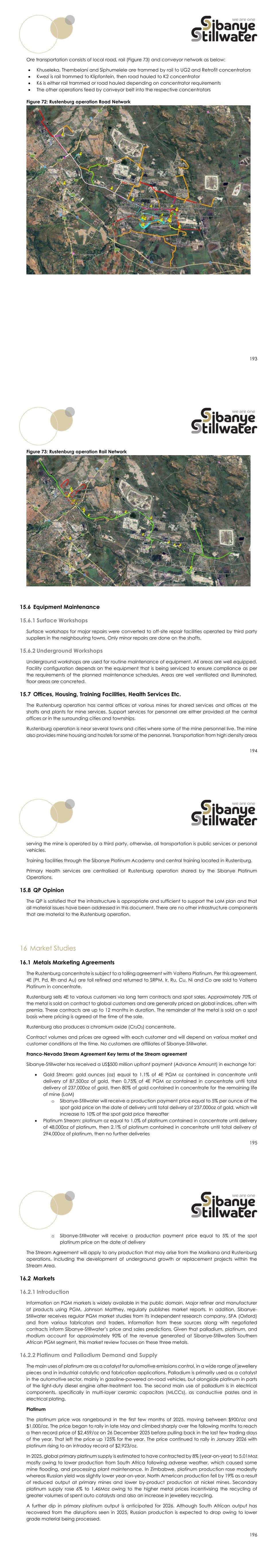 193 Ore transportation consists of local road, rail (Figure 73) and conveyor network as below: • Khuseleka, Thembelani and Siphumelele are trammed by rail to UG2 and Retrofit concentrators • Kwezi is rail trammed to Klipfontein, then road hauled to K2 concentrator • K6 is either rail trammed or road hauled depending on concentrator requirements • The other operations feed by conveyor belt into the respective concentrators Figure 72: Rustenburg operation Road Network 194 Figure 73: Rustenburg operation Rail Network 15.6 Equipment Maintenance 15.6.1 Surface Workshops Surface workshops for major repairs were converted to off-site repair facilities operated by third party suppliers in the neighbouring towns. Only minor repairs are done on the shafts. 15.6.2 Underground Workshops Underground workshops are used for routine maintenance of equipment. All areas are well equipped. Facility configuration depends on the equipment that is being serviced to ensure compliance as per the requirements of the planned maintenance schedules. Areas are well ventilated and illuminated, floor areas are concreted. 15.7 Offices, Housing, Training Facilities, Health Services Etc. The Rustenburg operation has central offices at various mines for shared services and offices at the shafts and plants for mine services. Support services for personnel are either provided at the central offices or in the surrounding cities and townships. Rustenburg operation is near several towns and cities where some of the mine personnel live. The mine also provides mine housing and hostels for some of the personnel. Transportation from high density areas 195 serving the mine is operated by a third party, otherwise, all transportation is public services or personal vehicles. Training facilities through the Sibanye Platinum Academy and central training located in Rustenburg. Primary Health services are centralised at Rustenburg operation shared by the Sibanye Platinum Operations. 15.8 QP Opinion The QP is satisfied that the infrastructure is appropriate and sufficient to support the LoM plan and that all material issues have been addressed in this document. There are no other infrastructure components that are material to the Rustenburg operation. 16 Market Studies 16.1 Metals Marketing Agreements The Rustenburg concentrate is subject to a tolling agreement with Valterra Platinum. Per this agreement, 4E (Pt, Pd, Rh and Au) are toll refined and returned to SRPM. Ir, Ru, Cu, Ni and Co are sold to Valterra Platinum in concentrate. Rustenburg sells 4E to various customers via long term contracts and spot sales. Approximately 70% of the metal is sold on contract to global customers and are generally priced on global indices, often with premia. These contracts are up to 12 months in duration. The remainder of the metal is sold on a spot basis where pricing is agreed at the time of the sale. Rustenburg also produces a chromium oxide (Cr2O3) concentrate. Contract volumes and prices are agreed with each customer and will depend on various market and customer conditions at the time. No customers are affiliates of Sibanye-Stillwater. Franco-Nevada Stream Agreement Key terms of the Stream agreement Sibanye-Stillwater has received a US$500 million upfront payment (Advance Amount) in exchange for: • Gold Stream: gold ounces (oz) equal to 1.1% of 4E PGM oz contained in concentrate until delivery of 87,500oz of gold, then 0.75% of 4E PGM oz contained in concentrate until total delivery of 237,000oz of gold, then 80% of gold contained in concentrate for the remaining life of mine (LoM) o Sibanye-Stillwater will receive a production payment price equal to 5% per ounce of the spot gold price on the date of delivery until total delivery of 237,000oz of gold, which will increase to 10% of the spot gold price thereafter • Platinum Stream: platinum oz equal to 1.0% of platinum contained in concentrate until delivery of 48,000oz of platinum, then 2.1% of platinum contained in concentrate until total delivery of 294,000oz of platinum, then no further deliveries 196 o Sibanye-Stillwater will receive a production payment price equal to 5% of the spot platinum price on the date of delivery The Stream Agreement will apply to any production that may arise from the Marikana and Rustenburg operations, including the development of underground growth or replacement projects within the Stream Area. 16.2 Markets 16.2.1 Introduction Information on PGM markets is widely available in the public domain. Major refiner and manufacturer of products using PGM, Johnson Matthey, regularly publishes market reports. In addition, Sibanye- Stillwater receives regular PGM market studies from its independent research company, SFA (Oxford) and from various fabricators and traders. Information from these sources along with negotiated contracts inform Sibanye-Stillwater’s price and sales predictions. Given that palladium, platinum, and rhodium account for approximately 90% of the revenue generated at Sibanye-Stillwaters Southern African PGM segment, this market review focuses on these three metals. 16.2.2 Platinum and Palladium Demand and Supply The main uses of platinum are as a catalyst for automotive emissions control, in a wide range of jewellery pieces and in industrial catalytic and fabrication applications. Palladium is primarily used as a catalyst in the automotive sector, mainly in gasoline-powered on-road vehicles, but alongside platinum in parts of the light-duty diesel engine after-treatment too. The second main use of palladium is in electrical components, specifically in multi-layer ceramic capacitors (MLCCs), as conductive pastes and in electrical plating. Platinum The platinum price was rangebound in the first few months of 2025, moving between $900/oz and $1,000/oz. The price began to rally in late May and climbed sharply over the following months to reach a then record price of $2,459/oz on 26 December 2025 before pulling back in the last few trading days of