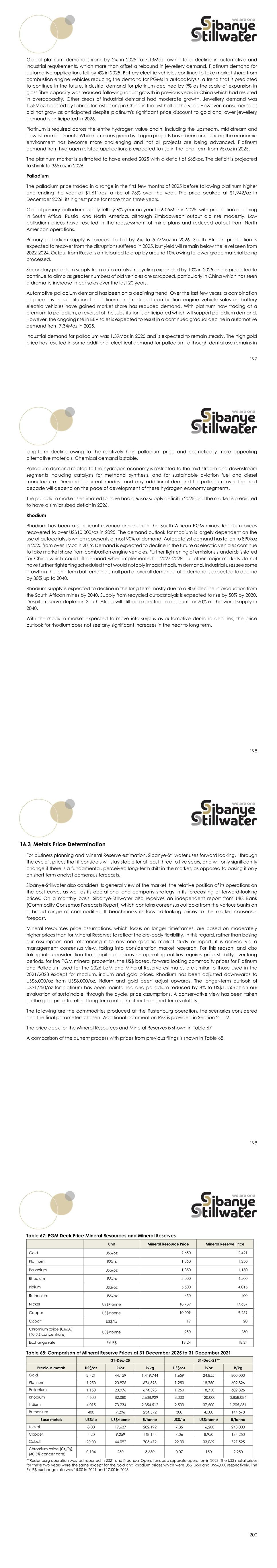197 Global platinum demand shrank by 2% in 2025 to 7.13Moz, owing to a decline in automotive and industrial requirements, which more than offset a rebound in jewellery demand. Platinum demand for automotive applications fell by 4% in 2025. Battery electric vehicles continue to take market share from combustion engine vehicles reducing the demand for PGMs in autocatalysis, a trend that is predicted to continue in the future. Industrial demand for platinum declined by 9% as the scale of expansion in glass fibre capacity was reduced following robust growth in previous years in China which had resulted in overcapacity. Other areas of industrial demand had moderate growth. Jewellery demand was 1.55Moz, boosted by fabricator restocking in China in the first half of the year. However, consumer sales did not grow as anticipated despite platinum's significant price discount to gold and lower jewellery demand is anticipated in 2026. Platinum is required across the entire hydrogen value chain, including the upstream, mid-stream and downstream segments. While numerous green hydrogen projects have been announced the economic environment has become more challenging and not all projects are being advanced. Platinum demand from hydrogen related applications is expected to rise in the long-term from 95koz in 2025. The platinum market is estimated to have ended 2025 with a deficit of 665koz. The deficit is projected to shrink to 365koz in 2026. Palladium The palladium price traded in a range in the first few months of 2025 before following platinum higher and ending the year at $1,611/oz, a rise of 76% over the year. The price peaked at $1,942/oz in December 2026, its highest price for more than three years. Global primary palladium supply fell by 6% year-on-year to 6.05Moz in 2025, with production declining in South Africa, Russia, and North America, although Zimbabwean output did rise modestly. Low palladium prices have resulted in the reassessment of mine plans and reduced output from North American operations. Primary palladium supply is forecast to fall by 6% to 5.77Moz in 2026. South African production is expected to recover from the disruptions suffered in 2025, but yield will remain below the level seen from 2022-2024. Output from Russia is anticipated to drop by around 10% owing to lower grade material being processed. Secondary palladium supply from auto catalyst recycling expanded by 10% in 2025 and is predicted to continue to climb as greater numbers of old vehicles are scrapped, particularly in China which has seen a dramatic increase in car sales over the last 20 years. Automotive palladium demand has been on a declining trend. Over the last few years, a combination of price-driven substitution for platinum and reduced combustion engine vehicle sales as battery electric vehicles have gained market share has reduced demand. With platinum now trading at a premium to palladium, a reversal of the substitution is anticipated which will support palladium demand. However, the ongoing rise in BEV sales is expected to result in a continued gradual decline in automotive demand from 7.34Moz in 2025. Industrial demand for palladium was 1.39Moz in 2025 and is expected to remain steady. The high gold price has resulted in some additional electrical demand for palladium, although dental use remains in 198 long-term decline owing to the relatively high palladium price and cosmetically more appealing alternative materials. Chemical demand is stable. Palladium demand related to the hydrogen economy is restricted to the mid-stream and downstream segments including catalysts for methanol synthesis, and for sustainable aviation fuel and diesel manufacture. Demand is current modest and any additional demand for palladium over the next decade will depend on the pace of development of these hydrogen economy segments. The palladium market is estimated to have had a 65koz supply deficit in 2025 and the market is predicted to have a similar sized deficit in 2026. Rhodium Rhodium has been a significant revenue enhancer in the South African PGM mines. Rhodium prices recovered to over US$10,000/oz in 2025. The demand outlook for rhodium is largely dependent on the use of autocatalysts which represents almost 90% of demand. Autocatalyst demand has fallen to 890koz in 2025 from over 1Moz in 2019. Demand is expected to decline in the future as electric vehicles continue to take market share from combustion engine vehicles. Further tightening of emissions standards is slated for China which could lift demand when implemented in 2027-2028 but other major markets do not have further tightening scheduled that would notably impact rhodium demand. Industrial uses see some growth in the long term but remain a small part of overall demand. Total demand is expected to decline by 30% up to 2040. Rhodium Supply is expected to decline in the long term mostly due to a 40% decline in production from the South African mines by 2040. Supply from recycled autocatalysis is expected to rise by 50% by 2030. Despite reserve depletion South Africa will still be expected to account for 70% of the world supply in 2040. With the rhodium market expected to move into surplus as automotive demand declines, the price outlook for rhodium does not see any significant increases in the near to long term. 199 16.3 Metals Price Determination For business planning and Mineral Reserve estimation, Sibanye-Stillwater uses forward looking, “through the cycle”, prices that it considers will stay stable for at least three to five years, and will only significantly change if there is a fundamental, perceived long-term shift in the market, as opposed to basing it only on short term analyst consensus forecasts. Sibanye-Stillwater also considers its general view of the market, the relative position of its operations on the cost curve, as well as its operational and company strategy in its forecasting of forward-looking prices. On a monthly basis, Sibanye-Stillwater