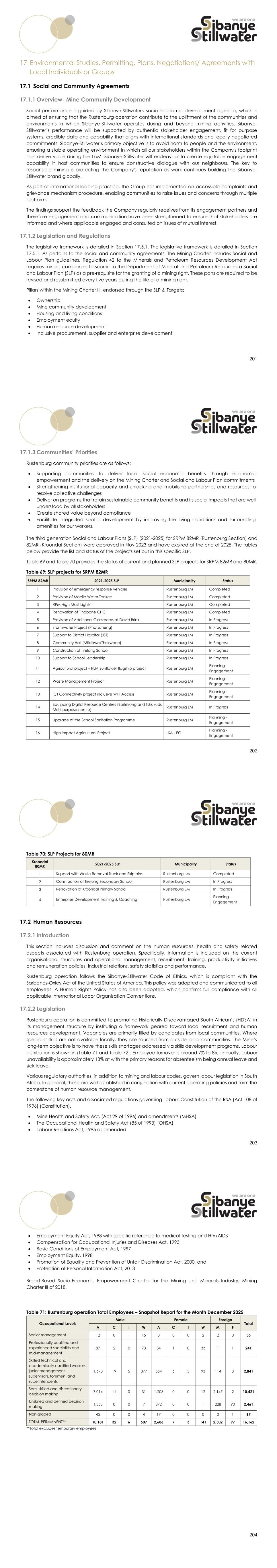 201 17 Environmental Studies, Permitting, Plans, Negotiations/ Agreements with Local Individuals or Groups 17.1 Social and Community Agreements 17.1.1 Overview- Mine Community Development Social performance is guided by Sibanye-Stillwater's socio-economic development agenda, which is aimed at ensuring that the Rustenburg operation contribute to the upliftment of the communities and environments in which Sibanye-Stillwater operates during and beyond mining activities. Sibanye- Stillwater’s performance will be supported by authentic stakeholder engagement, fit for purpose systems, credible data and capability that aligns with international standards and locally negotiated commitments. Sibanye-Stillwater’s primary objective is to avoid harm to people and the environment, ensuring a stable operating environment in which all our stakeholders within the Company's footprint can derive value during the LoM. Sibanye-Stillwater will endeavour to create equitable engagement capability in host communities to ensure constructive dialogue with our neighbours. The key to responsible mining is protecting the Company's reputation as work continues building the Sibanye- Stillwater brand globally. As part of international leading practice, the Group has implemented an accessible complaints and grievance mechanism procedure, enabling communities to raise issues and concerns through multiple platforms. The findings support the feedback the Company regularly receives from its engagement partners and therefore engagement and communication have been strengthened to ensure that stakeholders are informed and where applicable engaged and consulted on issues of mutual interest. 17.1.2 Legislation and Regulations The legislative framework is detailed in Section 17.5.1. The legislative framework is detailed in Section 17.5.1. As pertains to the social and community agreements, The Mining Charter includes Social and Labour Plan guidelines. Regulation 42 to the Minerals and Petroleum Resources Development Act requires mining companies to submit to the Department of Mineral and Petroleum Resources a Social and Labour Plan (SLP) as a pre-requisite for the granting of a mining right. These pans are required to be revised and resubmitted every five years during the life of a mining right. Pillars within the Mining Charter III, endorsed through the SLP & Targets: • Ownership • Mine community development • Housing and living conditions • Employment equity • Human resource development • Inclusive procurement, supplier and enterprise development 202 17.1.3 Communities’ Priorities Rustenburg community priorities are as follows: • Supporting communities to deliver local social economic benefits through economic empowerment and the delivery on the Mining Charter and Social and Labour Plan commitments • Strengthening institutional capacity and unlocking and mobilising partnerships and resources to resolve collective challenges • Deliver on programs that retain sustainable community benefits and its social impacts that are well understood by all stakeholders • Create shared value beyond compliance • Facilitate integrated spatial development by improving the living conditions and surrounding amenities for our workers. The third generation Social and Labour Plans (SLP) (2021-2025) for SRPM 82MR (Rustenburg Section) and 82MR (Kroondal Section) were approved in Nov 2023 and have expired at the end of 2025. The tables below provide the list and status of the projects set out in this specific SLP. Table 69 and Table 70 provides the status of current and planned SLP projects for SRPM 82MR and 80MR. Table 69: SLP projects for SRPM 82MR SRPM 82MR 2021-2025 SLP Municipality Status 1 Provision of emergency response vehicles Rustenburg LM Completed 2 Provision of Mobile Water Tankers Rustenburg LM Completed 3 RPM High Mast Lights Rustenburg LM Completed 4 Renovation of Tlhabane CHC Rustenburg LM Completed 5 Provision of Additional Classrooms at David Brink Rustenburg LM In Progress 6 Stormwater Project (Photsaneng) Rustenburg LM In Progress 7 Support to District Hospital (JST) Rustenburg LM In Progress 8 Community Hall (Mfidikwe/Thekwane) Rustenburg LM In Progress 9 Construction of Tirelong School Rustenburg LM In Progress 10 Support to School Leadership Rustenburg LM In Progress 11 Agricultural project – RLM Sunflower flagship project Rustenburg LM Planning - Engagement 12 Waste Management Project Rustenburg LM Planning - Engagement 13 ICT Connectivity project inclusive WIFI Access Rustenburg LM Planning - Engagement 14 Equipping Digital Resource Centres (Boitekong and Tshukudu Multi-purpose centre) Rustenburg LM In Progress 15 Upgrade of the School Sanitation Programme Rustenburg LM Planning - Engagement 16 High impact Agricultural Project LSA - EC Planning - Engagement 203 Table 70: SLP Projects for 80MR Kroondal 80MR 2021-2025 SLP Municipality Status 1 Support with Waste Removal Truck and Skip bins Rustenburg LM Completed 2 Construction of Tirelong Secondary School Rustenburg LM In Progress 3 Renovation of Kroondal Primary School Rustenburg LM In Progress 4 Enterprise Development Training & Coaching Rustenburg LM Planning – Engagement 17.2 Human Resources 17.2.1 Introduction This section includes discussion and comment on the human resources, health and safety related aspects associated with Rustenburg operation. Specifically, information is included on the current organisational structures and operational management, recruitment, training, productivity initiatives and remuneration policies, industrial relations, safety statistics and performance. Rustenburg operation follows the Sibanye-Stillwater Code of Ethics, which is compliant with the Sarbanes-Oxley Act of the United States of America. This policy was adopted and communicated to all employees. A Human Rights Policy has also been adopted, which confirms full compliance with all applicable International Labor Organisation Conventions. 17.2.2 Legislation