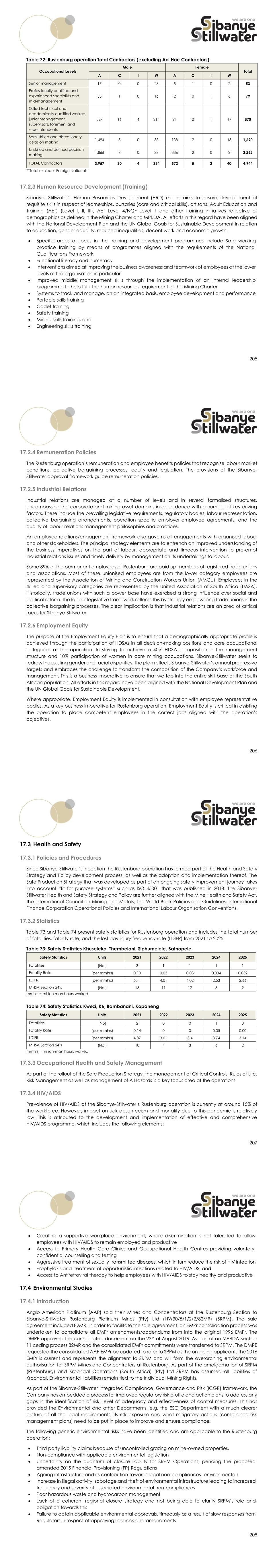 205 Table 72: Rustenburg operation Total Contractors (excluding Ad-Hoc Contractors) Occupational Levels Male Female Total A C I W A C I W Senior management 17 0 0 28 5 1 0 2 53 Professionally qualified and experienced specialists and mid-management 53 1 0 16 2 0 1 6 79 Skilled technical and academically qualified workers, junior management, supervisors, foremen, and superintendents 527 16 4 214 91 0 1 17 870 Semi-skilled and discretionary decision making 1,494 5 0 38 138 2 0 13 1,690 Unskilled and defined decision making 1,866 8 0 38 336 2 0 2 2,252 TOTAL Contractors 3,957 30 4 334 572 5 2 40 4,944 **Total excludes Foreign Nationals 17.2.3 Human Resource Development (Training) Sibanye -Stillwater’s Human Resources Development (HRD) model aims to ensure development of requisite skills in respect of learnerships, bursaries (core and critical skills), artisans, Adult Education and Training (AET) (Level I, II, III), AET Level 4/NQF Level 1 and other training initiatives reflective of demographics as defined in the Mining Charter and MPRDA. All efforts in this regard have been aligned with the National Development Plan and the UN Global Goals for Sustainable Development in relation to education, gender equality, reduced inequalities, decent work and economic growth. • Specific areas of focus in the training and development programmes include Safe working practice training by means of programmes aligned with the requirements of the National Qualifications Framework • Functional literacy and numeracy • Interventions aimed at improving the business awareness and teamwork of employees at the lower levels of the organisation in particular • Improved middle management skills through the implementation of an internal leadership programme to help fulfil the human resources requirement of the Mining Charter • Systems to track and manage, on an integrated basis, employee development and performance • Portable skills training • Cadet training • Safety training • Mining skills training, and • Engineering skills training 206 17.2.4 Remuneration Policies The Rustenburg operation’s remuneration and employee benefits policies that recognise labour market conditions, collective bargaining processes, equity and legislation. The provisions of the Sibanye- Stillwater approval framework guide remuneration policies. 17.2.5 Industrial Relations Industrial relations are managed at a number of levels and in several formalised structures, encompassing the corporate and mining asset domains in accordance with a number of key driving factors. These include the prevailing legislative requirements, regulatory bodies, labour representation, collective bargaining arrangements, operation specific employer-employee agreements, and the quality of labour relations management philosophies and practices. An employee relations/engagement framework also governs all engagements with organised labour and other stakeholders. The principal strategy elements are to entrench an improved understanding of the business imperatives on the part of labour, appropriate and timeous intervention to pre-empt industrial relations issues and timely delivery by management on its undertakings to labour. Some 89% of the permanent employees of Rustenburg are paid up members of registered trade unions and associations. Most of these unionised employees are from the lower category employees are represented by the Association of Mining and Construction Workers Union (AMCU). Employees in the skilled and supervisory categories are represented by the United Association of South Africa (UASA). Historically, trade unions with such a power base have exercised a strong influence over social and political reform. The labour legislative framework reflects this by strongly empowering trade unions in the collective bargaining processes. The clear implication is that industrial relations are an area of critical focus for Sibanye-Stillwater. 17.2.6 Employment Equity The purpose of the Employment Equity Plan is to ensure that a demographically appropriate profile is achieved through the participation of HDSAs in all decision-making positions and core occupational categories at the operation. In striving to achieve a 40% HDSA composition in the management structure and 10% participation of women in core mining occupations, Sibanye-Stillwater seeks to redress the existing gender and racial disparities. The plan reflects Sibanye-Stillwater’s annual progressive targets and embraces the challenge to transform the composition of the Company’s workforce and management. This is a business imperative to ensure that we tap into the entire skill base of the South African population. All efforts in this regard have been aligned with the National Development Plan and the UN Global Goals for Sustainable Development. Where appropriate, Employment Equity is implemented in consultation with employee representative bodies. As a key business imperative for Rustenburg operation, Employment Equity is critical in assisting the operation to place competent employees in the correct jobs aligned with the operation’s objectives. 207 17.3 Health and Safety 17.3.1 Policies and Procedures Since Sibanye-Stillwater’s inception the Rustenburg operation has formed part of the Health and Safety Strategy and Policy development process, as well as the adoption and implementation thereof. The Safe Production Strategy that was developed as part of an ongoing safety improvement journey takes into account “fit for purpose systems” such as ISO 45001 that was published in 2018. The Sibanye- Stillwater Health and Safety Strategy and Policy are further aligned with the Mine Health and Safety Act, the International Council on Mining and Metals, the World Bank Policies and Guidelines, International Finance Corporation Operational Policies and International Labour Organisation Conventions. 17.3.2 Statistics Table 73 and Table 74 present safety statistics for Rustenburg operation a