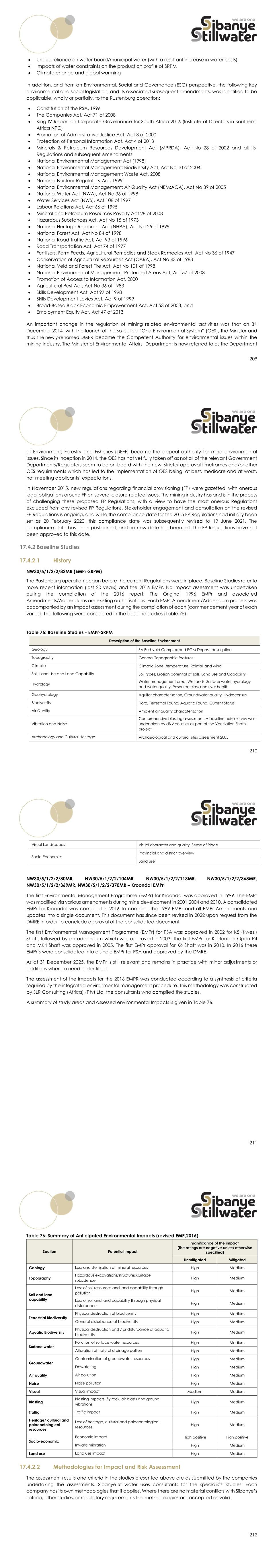 209 • Undue reliance on water board/municipal water (with a resultant increase in water costs) • Impacts of water constraints on the production profile of SRPM • Climate change and global warming In addition, and from an Environmental, Social and Governance (ESG) perspective, the following key environmental and social legislation, and its associated subsequent amendments, was identified to be applicable, wholly or partially, to the Rustenburg operation: • Constitution of the RSA, 1996 • The Companies Act, Act 71 of 2008 • King IV Report on Corporate Governance for South Africa 2016 (Institute of Directors in Southern Africa NPC) • Promotion of Administrative Justice Act, Act 3 of 2000 • Protection of Personal Information Act, Act 4 of 2013 • Minerals & Petroleum Resources Development Act (MPRDA), Act No 28 of 2002 and all its Regulations and subsequent Amendments • National Environmental Management Act (1998) • National Environmental Management: Biodiversity Act, Act No 10 of 2004 • National Environmental Management: Waste Act, 2008 • National Nuclear Regulatory Act, 1999 • National Environmental Management: Air Quality Act (NEM:AQA), Act No 39 of 2005 • National Water Act (NWA), Act No 36 of 1998 • Water Services Act (NWS), Act 108 of 1997 • Labour Relations Act, Act 66 of 1995 • Mineral and Petroleum Resources Royalty Act 28 of 2008 • Hazardous Substances Act, Act No 15 of 1973 • National Heritage Resources Act (NHRA), Act No 25 of 1999 • National Forest Act, Act No 84 of 1998 • National Road Traffic Act, Act 93 of 1996 • Road Transportation Act, Act 74 of 1977 • Fertilisers, Farm Feeds, Agricultural Remedies and Stock Remedies Act, Act No 36 of 1947 • Conservation of Agricultural Resources Act (CARA), Act No 43 of 1983 • National Veld and Forest Fire Act, Act No 101 of 1998 • National Environmental Management: Protected Areas Act, Act 57 of 2003 • Promotion of Access to Information Act, 2000 • Agricultural Pest Act, Act No 36 of 1983 • Skills Development Act, Act 97 of 1998 • Skills Development Levies Act, Act 9 of 1999 • Broad-Based Black Economic Empowerment Act, Act 53 of 2003, and • Employment Equity Act, Act 47 of 2013 An important change in the regulation of mining related environmental activities was that on 8th December 2014, with the launch of the so-called “One Environmental System” (OES), the Minister and thus the newly-renamed DMPR became the Competent Authority for environmental issues within the mining industry. The Minister of Environmental Affairs -Department is now referred to as the Department 210 of Environment, Forestry and Fisheries (DEFF) became the appeal authority for mine environmental issues. Since its inception in 2014, the OES has not yet fully taken off as not all of the relevant Government Departments/Regulators seem to be on-board with the new, stricter approval timeframes and/or other OES requirements which has led to the implementation of OES being, at best, mediocre and at worst, not meeting applicants’ expectations. In November 2015, new regulations regarding financial provisioning (FP) were gazetted, with onerous legal obligations around FP on several closure-related issues. The mining industry has and is in the process of challenging these proposed FP Regulations, with a view to have the most onerous Regulations excluded from any revised FP Regulations. Stakeholder engagement and consultation on the revised FP Regulations is ongoing, and while the compliance date for the 2015 FP Regulations had initially been set as 20 February 2020, this compliance date was subsequently revised to 19 June 2021. The compliance date has been postponed, and no new date has been set. The FP Regulations have not been approved to this date. 17.4.2 Baseline Studies 17.4.2.1 History NW30/5/1/2/2/82MR (EMPr-SRPM) The Rustenburg operation began before the current Regulations were in place. Baseline Studies refer to more recent information (last 20 years) and the 2016 EMPr. No impact assessment was undertaken during the compilation of the 2016 report. The Original 1996 EMPr and associated Amendments/Addendums are existing authorisations. Each EMPr Amendment/Addendum process was accompanied by an impact assessment during the compilation of each (commencement year of each varies). The following were considered in the baseline studies (Table 75). Table 75: Baseline Studies - EMPr-SRPM Description of the Baseline Environment Geology SA Bushveld Complex and PGM Deposit description Topography General Topographic features Climate Climatic Zone, temperature, Rainfall and wind Soil, Land Use and Land Capability Soil types, Erosion potential of soils, Land use and Capability Hydrology Water management area, Wetlands, Surface water hydrology and water quality, Resource class and river health Geohydrology Aquifer characterisation, Groundwater quality, Hydrocensus Biodiversity Flora, Terrestrial Fauna, Aquatic Fauna, Current Status Air Quality Ambient air quality characterisation Vibration and Noise Comprehensive blasting assessment, A baseline noise survey was undertaken by dB Acoustics as part of the Ventilation Shafts project Archaeology and Cultural Heritage Archaeological and cultural sites assessment 2005 211 Visual Landscapes Visual character and quality, Sense of Place Socio-Economic Provincial and district overview Land use NW30/5/1/2/2/80MR, NW30/5/1/2/2/104MR, NW30/5/1/2/2/113MR, NW30/5/1/2/2/368MR, NW30/5/1/2/2/369MR, NW30/5/1/2/2/370MR – Kroondal EMPr The first Environmental Management Programme (EMPr) for Kroondal was approved in 1999. The EMPr was modified via various amendments during mine development in 2001,2004 and 2010. A consolidated EMPr for Kroondal was compiled in 2016 to combine the 1999 EMPr and all EMPr Amendments and updates into a single document. This document has since been revised in 2022 upon request from the DMRE in order to conclude approval of the consolidated document. The first