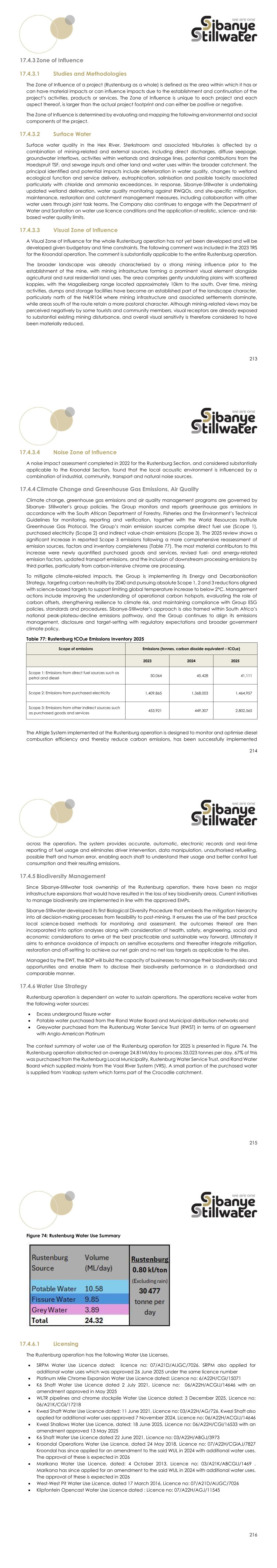 213 17.4.3 Zone of Influence 17.4.3.1 Studies and Methodologies The Zone of Influence of a project (Rustenburg as a whole) is defined as the area within which it has or can have material impacts or can influence impacts due to the establishment and continuation of the project’s activities, products or services. The Zone of Influence is unique to each project and each aspect thereof, is larger than the actual project footprint and can either be positive or negative. The Zone of Influence is determined by evaluating and mapping the following environmental and social components of the project. 17.4.3.2 Surface Water Surface water quality in the Hex River, Sterkstroom and associated tributaries is affected by a combination of mining-related and external sources, including direct discharges, diffuse seepage, groundwater interflows, activities within wetlands and drainage lines, potential contributions from the Hoedspruit TSF, and sewage inputs and other land and water uses within the broader catchment. The principal identified and potential impacts include deterioration in water quality, changes to wetland ecological function and service delivery, eutrophication, salinisation and possible toxicity associated particularly with chloride and ammonia exceedances. In response, Sibanye-Stillwater is undertaking updated wetland delineation, water quality monitoring against RWQOs, and site-specific mitigation, maintenance, restoration and catchment management measures, including collaboration with other water users through joint task teams. The Company also continues to engage with the Department of Water and Sanitation on water use licence conditions and the application of realistic, science- and risk- based water quality limits. 17.4.3.3 Visual Zone of Influence A Visual Zone of Influence for the whole Rustenburg operation has not yet been developed and will be developed given budgetary and time constraints. The following comment was included in the 2023 TRS for the Kroondal operation. The comment is substantially applicable to the entire Rustenburg operation. The broader landscape was already characterised by a strong mining influence prior to the establishment of the mine, with mining infrastructure forming a prominent visual element alongside agricultural and rural residential land uses. The area comprises gently undulating plains with scattered koppies, with the Magaliesberg range located approximately 10km to the south. Over time, mining activities, dumps and storage facilities have become an established part of the landscape character, particularly north of the N4/R104 where mining infrastructure and associated settlements dominate, while areas south of the route retain a more pastoral character. Although mining-related views may be perceived negatively by some tourists and community members, visual receptors are already exposed to substantial existing mining disturbance, and overall visual sensitivity is therefore considered to have been materially reduced. 214 17.4.3.4 Noise Zone of Influence A noise impact assessment completed in 2022 for the Rustenburg Section, and considered substantially applicable to the Kroondal Section, found that the local acoustic environment is influenced by a combination of industrial, community, transport and natural noise sources. 17.4.4 Climate Change and Greenhouse Gas Emissions, Air Quality Climate change, greenhouse gas emissions and air quality management programs are governed by Sibanye- Stillwater’s group policies. The Group monitors and reports greenhouse gas emissions in accordance with the South African Department of Forestry, Fisheries and the Environment’s Technical Guidelines for monitoring, reporting and verification, together with the World Resources Institute Greenhouse Gas Protocol. The Group’s main emission sources comprise direct fuel use (Scope 1), purchased electricity (Scope 2) and indirect value-chain emissions (Scope 3). The 2025 review shows a significant increase in reported Scope 3 emissions following a more comprehensive reassessment of emission sources, factors and inventory completeness (Table 77). The most material contributors to this increase were newly quantified purchased goods and services, revised fuel- and energy-related emission factors, updated transport emissions, and the inclusion of downstream processing emissions by third parties, particularly from carbon-intensive chrome ore processing. To mitigate climate-related impacts, the Group is implementing its Energy and Decarbonisation Strategy, targeting carbon neutrality by 2040 and pursuing absolute Scope 1, 2 and 3 reductions aligned with science-based targets to support limiting global temperature increase to below 2°C. Management actions include improving the understanding of operational carbon hotspots, evaluating the role of carbon offsets, strengthening resilience to climate risk, and maintaining compliance with Group ESG policies, standards and procedures. Sibanye-Stillwater’s approach is also framed within South Africa’s national peak-plateau-decline emissions pathway, and the Group continues to align its emissions management, disclosure and target-setting with regulatory expectations and broader government climate policy. Table 77: Rustenburg tCO2e Emissions Inventory 2025 Scope of emissions Emissions (tonnes, carbon dioxide equivalent – tCO2e) 2023 2024 2025 Scope 1: Emissions from direct fuel sources such as petrol and diesel 50,064 45,428 41,111 Scope 2: Emissions from purchased electricity 1,409,865 1,368,003 1,464,957 Scope 3: Emissions from other indirect sources such as purchased goods and services 453,921 449,307 2,802,565 The Afrigle System implemented at the Rustenburg operation is designed to monitor and optimise diesel combustion efficiency and thereby reduce carbon emissions, has been successfully implemented 215 across the operation. The system provides accurate, automatic, electronic records and real-time reporting of fuel usage and