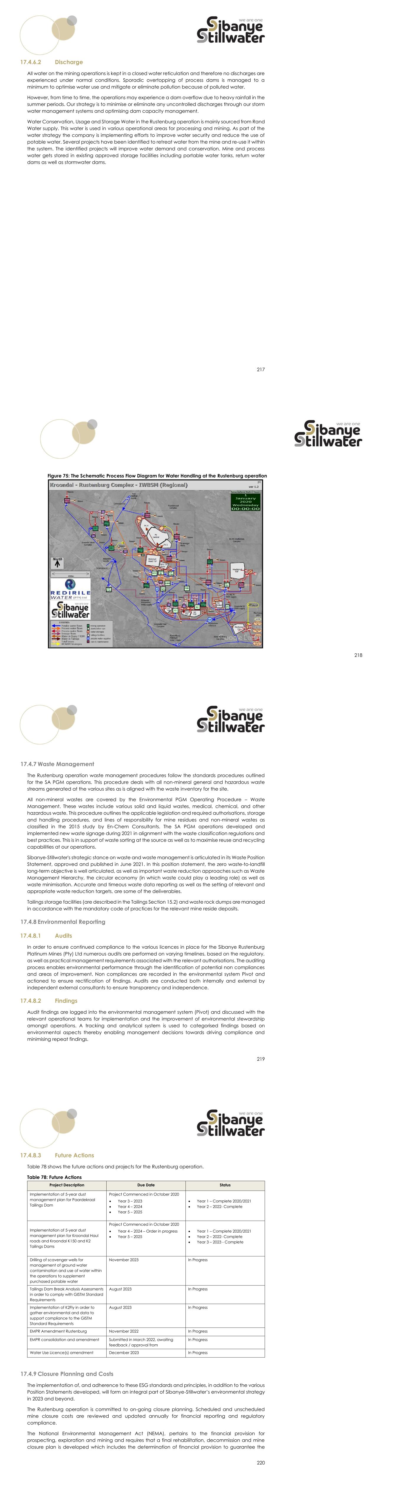 217 17.4.6.2 Discharge All water on the mining operations is kept in a closed water reticulation and therefore no discharges are experienced under normal conditions. Sporadic overtopping of process dams is managed to a minimum to optimise water use and mitigate or eliminate pollution because of polluted water. However, from time to time, the operations may experience a dam overflow due to heavy rainfall in the summer periods. Our strategy is to minimise or eliminate any uncontrolled discharges through our storm water management systems and optimising dam capacity management. Water Conservation, Usage and Storage Water in the Rustenburg operation is mainly sourced from Rand Water supply. This water is used in various operational areas for processing and mining. As part of the water strategy the company is implementing efforts to improve water security and reduce the use of potable water. Several projects have been identified to retreat water from the mine and re-use it within the system. The identified projects will improve water demand and conservation. Mine and process water gets stored in existing approved storage facilities including portable water tanks, return water dams as well as stormwater dams. 218 Figure 75: The Schematic Process Flow Diagram for Water Handling at the Rustenburg operation 219 17.4.7 Waste Management The Rustenburg operation waste management procedures follow the standards procedures outlined for the SA PGM operations. This procedure deals with all non-mineral general and hazardous waste streams generated at the various sites as is aligned with the waste inventory for the site. All non-mineral wastes are covered by the Environmental PGM Operating Procedure – Waste Management. These wastes include various solid and liquid wastes, medical, chemical, and other hazardous waste. This procedure outlines the applicable legislation and required authorisations, storage and handling procedures, and lines of responsibility for mine residues and non-mineral wastes as classified in the 2015 study by En-Chem Consultants. The SA PGM operations developed and implemented new waste signage during 2021 in alignment with the waste classification regulations and best practices. This is in support of waste sorting at the source as well as to maximise reuse and recycling capabilities at our operations. Sibanye-Stillwater's strategic stance on waste and waste management is articulated in its Waste Position Statement, approved and published in June 2021. In this position statement, the zero waste-to-landfill long-term objective is well articulated, as well as important waste reduction approaches such as Waste Management Hierarchy, the circular economy (in which waste could play a leading role) as well as waste minimisation. Accurate and timeous waste data reporting as well as the setting of relevant and appropriate waste reduction targets, are some of the deliverables. Tailings storage facilities (are described in the Tailings Section 15.2) and waste rock dumps are managed in accordance with the mandatory code of practices for the relevant mine reside deposits. 17.4.8 Environmental Reporting 17.4.8.1 Audits In order to ensure continued compliance to the various licences in place for the Sibanye Rustenburg Platinum Mines (Pty) Ltd numerous audits are performed on varying timelines, based on the regulatory, as well as practical management requirements associated with the relevant authorisations. The auditing process enables environmental performance through the identification of potential non compliances and areas of improvement. Non compliances are recorded in the environmental system Pivot and actioned to ensure rectification of findings. Audits are conducted both internally and external by independent external consultants to ensure transparency and independence. 17.4.8.2 Findings Audit findings are logged into the environmental management system (Pivot) and discussed with the relevant operational teams for implementation and the improvement of environmental stewardship amongst operations. A tracking and analytical system is used to categorised findings based on environmental aspects thereby enabling management decisions towards driving compliance and minimising repeat findings. 220 17.4.8.3 Future Actions Table 78 shows the future actions and projects for the Rustenburg operation. Table 78: Future Actions Project Description Due Date Status Implementation of 5-year dust management plan for Paardekraal Tailings Dam Project Commenced in October 2020 • Year 3 – 2023 • Year 4 – 2024 • Year 5 – 2025 • Year 1 – Complete 2020/2021 • Year 2 – 2022- Complete Implementation of 5-year dust management plan for Kroondal Haul roads and Kroondal K150 and K2 Tailings Dams Project Commenced in October 2020 • Year 4 – 2024 – Order in progress • Year 5 – 2025 • Year 1 – Complete 2020/2021 • Year 2 – 2022- Complete • Year 3 – 2023 - Complete Drilling of scavenger wells for management of ground water contamination and use of water within the operations to supplement purchased potable water November 2023 In Progress Tailings Dam Break Analysis Assessments in order to comply with GISTM Standard Requirements August 2023 In Progress Implementation of K2Fly in order to gather environmental and data to support compliance to the GISTM Standard Requirements August 2023 In Progress EMPR Amendment Rustenburg November 2022 In Progress EMPR consolidation and amendment Submitted in March 2022, awaiting feedback / approval from In Progress Water Use Licence(s) amendment December 2023 In Progress 17.4.9 Closure Planning and Costs The implementation of, and adherence to these ESG standards and principles, in addition to the various Position Statements developed, will form an integral part of Sibanye-Stillwater’s environmental strategy in 2023 and beyond. The Rustenburg operation is committed to on-going closure planning. Scheduled and unscheduled mine closure costs are reviewe