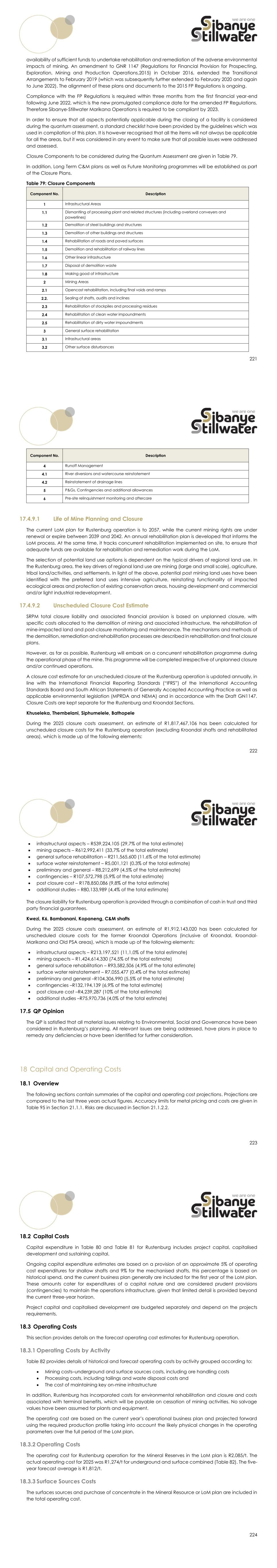 221 availability of sufficient funds to undertake rehabilitation and remediation of the adverse environmental impacts of mining. An amendment to GNR 1147 (Regulations for Financial Provision for Prospecting, Exploration, Mining and Production Operations,2015) in October 2016, extended the Transitional Arrangements to February 2019 (which was subsequently further extended to February 2020 and again to June 2022). The alignment of these plans and documents to the 2015 FP Regulations is ongoing. Compliance with the FP Regulations is required within three months from the first financial year-end following June 2022, which is the new promulgated compliance date for the amended FP Regulations. Therefore Sibanye-Stillwater Marikana Operations is required to be compliant by 2023. In order to ensure that all aspects potentially applicable during the closing of a facility is considered during the quantum assessment, a standard checklist have been provided by the guidelines which was used in compilation of this plan. It is however recognised that all the items will not always be applicable for all the areas, but it was considered in any event to make sure that all possible issues were addressed and assessed. Closure Components to be considered during the Quantum Assessment are given in Table 79. In addition, Long Term C&M plans as well as Future Monitoring programmes will be established as part of the Closure Plans. Table 79: Closure Components Component No. Description 1 Infrastructural Areas 1.1 Dismantling of processing plant and related structures (including overland conveyers and powerlines) 1.2 Demolition of steel buildings and structures 1.3 Demolition of other buildings and structures 1.4 Rehabilitation of roads and paved surfaces 1.5 Demolition and rehabilitation of railway lines 1.6 Other linear infrastructure 1.7 Disposal of demolition waste 1.8 Making good of infrastructure 2 Mining Areas 2.1 Opencast rehabilitation, including final voids and ramps 2.2. Sealing of shafts, audits and inclines 2.3 Rehabilitation of stockpiles and processing residues 2.4 Rehabilitation of clean water impoundments 2.5 Rehabilitation of dirty water impoundments 3 General surface rehabilitation 3.1 Infrastructural areas 3.2 Other surface disturbances 222 Component No. Description 4 Runoff Management 4.1 River diversions and watercourse reinstatement 4.2 Reinstatement of drainage lines 5 P&Gs, Contingencies and additional allowances 6 Pre-site relinquishment monitoring and aftercare 17.4.9.1 Life of Mine Planning and Closure The current LoM plan for Rustenburg operation is to 2057, while the current mining rights are under renewal or expire between 2039 and 2042. An annual rehabilitation plan is developed that informs the LoM process. At the same time, it tracks concurrent rehabilitation implemented on site, to ensure that adequate funds are available for rehabilitation and remediation work during the LoM. The selection of potential land use options is dependent on the typical drivers of regional land use. In the Rustenburg area, the key drivers of regional land use are mining (large and small scale), agriculture, tribal land/activities, and settlements. In light of the above, potential post mining land uses have been identified with the preferred land uses intensive agriculture, reinstating functionality of impacted ecological areas and protection of existing conservation areas, housing development and commercial and/or light industrial redevelopment. 17.4.9.2 Unscheduled Closure Cost Estimate SRPM total closure liability and associated financial provision is based on unplanned closure, with specific costs allocated to the demolition of mining and associated infrastructure, the rehabilitation of mine-impacted land and post-closure monitoring and maintenance. The mechanisms and methods of the demolition, remediation and rehabilitation processes are described in rehabilitation and final closure plans. However, as far as possible, Rustenburg will embark on a concurrent rehabilitation programme during the operational phase of the mine. This programme will be completed irrespective of unplanned closure and/or continued operations. A closure cost estimate for an unscheduled closure at the Rustenburg operation is updated annually, in line with the International Financial Reporting Standards (“IFRS”) of the International Accounting Standards Board and South African Statements of Generally Accepted Accounting Practice as well as applicable environmental legislation (MPRDA and NEMA) and in accordance with the Draft GN1147. Closure Costs are kept separate for the Rustenburg and Kroondal Sections. Khuseleka, Thembelani, Siphumelele, Bathopele During the 2025 closure costs assessment, an estimate of R1,817,467,106 has been calculated for unscheduled closure costs for the Rustenburg operation (excluding Kroondal shafts and rehabilitated areas), which is made up of the following elements: 223 • infrastructural aspects – R539,224,105 (29,7% of the total estimate) • mining aspects – R612,992,411 (33,7% of the total estimate) • general surface rehabilitation – R211,565,600 (11,6% of the total estimate) • surface water reinstatement – R5,001,121 (0.3% of the total estimate) • preliminary and general – R8,212,699 (4,5% of the total estimate) • contingencies – R107,572,798 (5,9% of the total estimate) • post closure cost – R178,850,086 (9,8% of the total estimate) • additional studies – R80,133,989 (4,4% of the total estimate) The closure liability for Rustenburg operation is provided through a combination of cash in trust and third party financial guarantees. Kwezi, K6, Bambanani, Kopaneng, C&M shafts During the 2025 closure costs assessment, an estimate of R1,912,143,020 has been calculated for unscheduled closure costs for the former Kroondal Operations (inclusive of Kroondal, Kroondal- Marikana and Old PSA areas), which is made up of the following elements: • infrastructural aspects – R