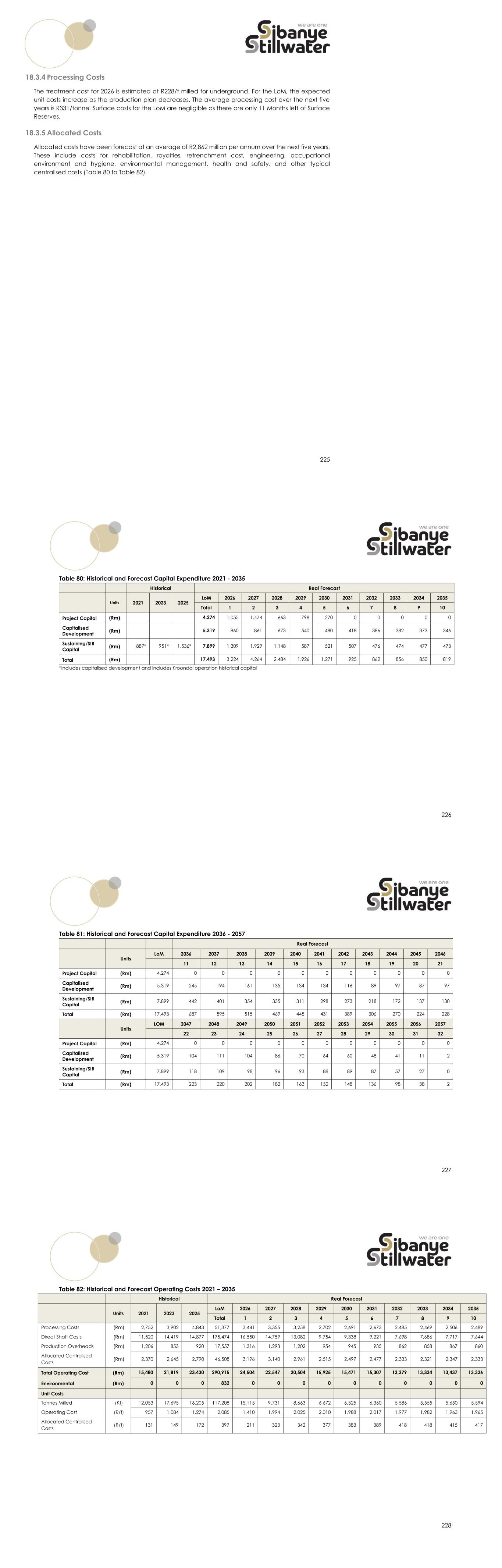 225 18.3.4 Processing Costs The treatment cost for 2026 is estimated at R228/t milled for underground. For the LoM, the expected unit costs increase as the production plan decreases. The average processing cost over the next five years is R331/tonne. Surface costs for the LoM are negligible as there are only 11 Months left of Surface Reserves. 18.3.5 Allocated Costs Allocated costs have been forecast at an average of R2,862 million per annum over the next five years. These include costs for rehabilitation, royalties, retrenchment cost, engineering, occupational environment and hygiene, environmental management, health and safety, and other typical centralised costs (Table 80 to Table 82). 226 Table 80: Historical and Forecast Capital Expenditure 2021 - 2035 Historical Real Forecast Units 2021 2023 2025 LoM 2026 2027 2028 2029 2030 2031 2032 2033 2034 2035 Total 1 2 3 4 5 6 7 8 9 10 Project Capital (Rm) 4,274 1,055 1,474 663 798 270 0 0 0 0 0 Capitalised Development (Rm) 5,319 860 861 673 540 480 418 386 382 373 346 Sustaining/SIB Capital (Rm) 887* 951* 1,536* 7,899 1,309 1,929 1,148 587 521 507 476 474 477 473 Total (Rm) 17,493 3,224 4,264 2,484 1,926 1,271 925 862 856 850 819 *Includes capitalised development and includes Kroondal operation historical capital 227 Table 81: Historical and Forecast Capital Expenditure 2036 - 2057 Real Forecast Units LoM 2036 2037 2038 2039 2040 2041 2042 2043 2044 2045 2046 11 12 13 14 15 16 17 18 19 20 21 Project Capital (Rm) 4,274 0 0 0 0 0 0 0 0 0 0 0 Capitalised Development (Rm) 5,319 245 194 161 135 134 134 116 89 97 87 97 Sustaining/SIB Capital (Rm) 7,899 442 401 354 335 311 298 273 218 172 137 130 Total (Rm) 17,493 687 595 515 469 445 431 389 306 270 224 228 Units LOM 2047 2048 2049 2050 2051 2052 2053 2054 2055 2056 2057 22 23 24 25 26 27 28 29 30 31 32 Project Capital (Rm) 4,274 0 0 0 0 0 0 0 0 0 0 0 Capitalised Development (Rm) 5,319 104 111 104 86 70 64 60 48 41 11 2 Sustaining/SIB Capital (Rm) 7,899 118 109 98 96 93 88 89 87 57 27 0 Total (Rm) 17,493 223 220 202 182 163 152 148 136 98 38 2 228 Table 82: Historical and Forecast Operating Costs 2021 – 2035 Historical Real Forecast Units 2021 2023 2025 LoM 2026 2027 2028 2029 2030 2031 2032 2033 2034 2035 Total 1 2 3 4 5 6 7 8 9 10 Processing Costs (Rm) 2,752 3,902 4,843 51,377 3,441 3,355 3,258 2,702 2,691 2,673 2,485 2,469 2,506 2,489 Direct Shaft Costs (Rm) 11,520 14,419 14,877 175,474 16,550 14,759 13,082 9,754 9,338 9,221 7,698 7,686 7,717 7,644 Production Overheads (Rm) 1,206 853 920 17,557 1,316 1,293 1,202 954 945 935 862 858 867 860 Allocated Centralised Costs (Rm) 2.370 2,645 2,790 46,508 3,196 3,140 2,961 2,515 2,497 2,477 2,333 2,321 2,347 2,333 Total Operating Cost (Rm) 15,480 21,819 23,430 290,915 24,504 22,547 20,504 15,925 15,471 15,307 13,379 13,334 13,437 13,326 Environmental (Rm) 0 0 0 832 0 0 0 0 0 0 0 0 0 0 Unit Costs Tonnes Milled (Kt) 12,053 17,695 16,205 117,208 15,115 9,731 8,663 6,672 6,525 6,360 5,586 5,555 5,650 5,594 Operating Cost (R/t) 957 1,084 1,274 2,085 1,410 1,994 2,025 2,010 1,988 2,017 1,977 1,982 1,963 1,965 Allocated Centralised Costs (R/t) 131 149 172 397 211 323 342 377 383 389 418 418 415 417