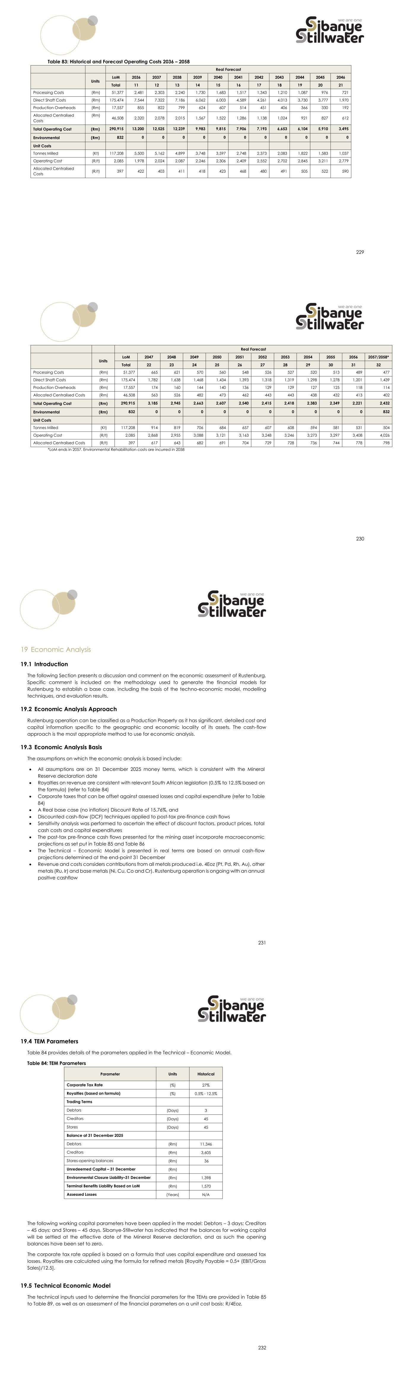 229 Table 83: Historical and Forecast Operating Costs 2036 – 2058 Real Forecast Units LoM 2036 2037 2038 2039 2040 2041 2042 2043 2044 2045 2046 Total 11 12 13 14 15 16 17 18 19 20 21 Processing Costs (Rm) 51,377 2,481 2,303 2,240 1,730 1,683 1,517 1,343 1,210 1,087 976 721 Direct Shaft Costs (Rm) 175,474 7,544 7,322 7,186 6,062 6,003 4,589 4,261 4,013 3,730 3,777 1,970 Production Overheads (Rm) 17,557 855 822 799 624 607 514 451 406 366 330 192 Allocated Centralised Costs (Rm) 46,508 2,320 2,078 2,015 1,567 1,522 1,286 1,138 1,024 921 827 612 Total Operating Cost (Rm) 290,915 13,200 12,525 12,239 9,983 9,815 7,906 7,193 6,653 6,104 5,910 3,495 Environmental (Rm) 832 0 0 0 0 0 0 0 0 0 0 0 Unit Costs Tonnes Milled (Kt) 117,208 5,500 5,162 4,899 3,748 3,597 2,748 2,373 2,083 1,822 1,583 1,037 Operating Cost (R/t) 2,085 1,978 2,024 2,087 2,246 2,306 2,409 2,552 2,702 2,845 3,211 2,779 Allocated Centralised Costs (R/t) 397 422 403 411 418 423 468 480 491 505 522 590 230 Real Forecast Units LoM 2047 2048 2049 2050 2051 2052 2053 2054 2055 2056 2057/2058* Total 22 23 24 25 26 27 28 29 30 31 32 Processing Costs (Rm) 51,377 665 621 570 560 548 526 527 520 513 489 477 Direct Shaft Costs (Rm) 175,474 1,782 1,638 1,468 1,434 1,393 1,318 1,319 1,298 1,278 1,201 1,439 Production Overheads (Rm) 17,557 174 160 144 140 136 129 129 127 125 118 114 Allocated Centralised Costs (Rm) 46,508 563 526 482 473 462 443 443 438 432 413 402 Total Operating Cost (Rm) 290,915 3,185 2,945 2,663 2,607 2,540 2,415 2,418 2,383 2,349 2,221 2,432 Environmental (Rm) 832 0 0 0 0 0 0 0 0 0 0 832 Unit Costs Tonnes Milled (Kt) 117,208 914 819 706 684 657 607 608 594 581 531 504 Operating Cost (R/t) 2,085 2,868 2,955 3,088 3,121 3,163 3,248 3,246 3,273 3,297 3,408 4,026 Allocated Centralised Costs (R/t) 397 617 643 682 691 704 729 728 736 744 778 798 *LoM ends in 2057. Environmental Rehabilitation costs are incurred in 2058 231 19 Economic Analysis 19.1 Introduction The following Section presents a discussion and comment on the economic assessment of Rustenburg. Specific comment is included on the methodology used to generate the financial models for Rustenburg to establish a base case, including the basis of the techno-economic model, modelling techniques, and evaluation results. 19.2 Economic Analysis Approach Rustenburg operation can be classified as a Production Property as it has significant, detailed cost and capital information specific to the geographic and economic locality of its assets. The cash-flow approach is the most appropriate method to use for economic analysis. 19.3 Economic Analysis Basis The assumptions on which the economic analysis is based include: • All assumptions are on 31 December 2025 money terms, which is consistent with the Mineral Reserve declaration date • Royalties on revenue are consistent with relevant South African legislation (0.5% to 12.5% based on the formula) (refer to Table 84) • Corporate taxes that can be offset against assessed losses and capital expenditure (refer to Table 84) • A Real base case (no inflation) Discount Rate of 15.76%, and • Discounted cash-flow (DCF) techniques applied to post-tax pre-finance cash flows • Sensitivity analysis was performed to ascertain the effect of discount factors, product prices, total cash costs and capital expenditures • The post-tax pre-finance cash flows presented for the mining asset incorporate macroeconomic projections as set put in Table 85 and Table 86 • The Technical – Economic Model is presented in real terms are based on annual cash-flow projections determined at the end-point 31 December • Revenue and costs considers contributions from all metals produced i.e. 4Eoz (Pt, Pd, Rh, Au), other metals (Ru, Ir) and base metals (Ni, Cu, Co and Cr). Rustenburg operation is ongoing with an annual positive cashflow 232 19.4 TEM Parameters Table 84 provides details of the parameters applied in the Technical – Economic Model. Table 84: TEM Parameters Parameter Units Historical Corporate Tax Rate (%) 27% Royalties (based on formula) (%) 0.5% - 12.5% Trading Terms Debtors (Days) 3 Creditors (Days) 45 Stores (Days) 45 Balance at 31 December 2025 Debtors (Rm) 11,346 Creditors (Rm) 3,605 Stores-opening balances (Rm) 36 Unredeemed Capital – 31 December (Rm) Environmental Closure Liability–31 December (Rm) 1,398 Terminal Benefits Liability Based on LoM (Rm) 1,570 Assessed Losses (Years) N/A The following working capital parameters have been applied in the model: Debtors – 3 days; Creditors – 45 days; and Stores – 45 days. Sibanye-Stillwater has indicated that the balances for working capital will be settled at the effective date of the Mineral Reserve declaration, and as such the opening balances have been set to zero. The corporate tax rate applied is based on a formula that uses capital expenditure and assessed tax losses. Royalties are calculated using the formula for refined metals [Royalty Payable = 0.5+ (EBIT/Gross Sales)/12.5]. 19.5 Technical Economic Model The technical inputs used to determine the financial parameters for the TEMs are provided in Table 85 to Table 89, as well as an assessment of the financial parameters on a unit cost basis: R/4Eoz.
