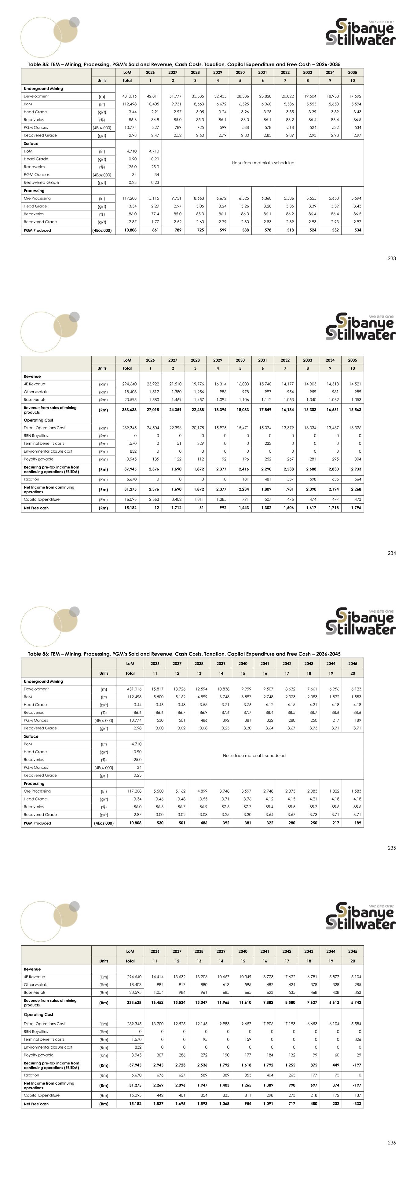 233 Table 85: TEM – Mining, Processing, PGM’s Sold and Revenue, Cash Costs, Taxation, Capital Expenditure and Free Cash – 2026-2035 LoM 2026 2027 2028 2029 2030 2031 2032 2033 2034 2035 Units Total 1 2 3 4 5 6 7 8 9 10 Underground Mining Development (m) 431,016 42,811 51,777 35,535 32,455 28,336 23,828 20,822 19,504 18,938 17,592 RoM (kt) 112,498 10,405 9,731 8,663 6,672 6,525 6,360 5,586 5,555 5,650 5,594 Head Grade (g/t) 3.44 2.91 2.97 3.05 3.24 3.26 3.28 3.35 3.39 3.39 3.43 Recoveries (%) 86.6 84.8 85.0 85.3 86.1 86.0 86.1 86.2 86.4 86.4 86.5 PGM Ounces (4Eoz'000) 10,774 827 789 725 599 588 578 518 524 532 534 Recovered Grade (g/t) 2.98 2.47 2.52 2.60 2.79 2.80 2.83 2.89 2.93 2.93 2.97 Surface No surface material is scheduled RoM (kt) 4,710 4,710 Head Grade (g/t) 0.90 0.90 Recoveries (%) 25.0 25.0 PGM Ounces (4Eoz'000) 34 34 Recovered Grade (g/t) 0.23 0.23 Processing Ore Processing (kt) 117,208 15,115 9,731 8,663 6,672 6,525 6,360 5,586 5,555 5,650 5,594 Head Grade (g/t) 3.34 2.29 2.97 3.05 3.24 3.26 3.28 3.35 3.39 3.39 3.43 Recoveries (%) 86.0 77.4 85.0 85.3 86.1 86.0 86.1 86.2 86.4 86.4 86.5 Recovered Grade (g/t) 2.87 1.77 2.52 2.60 2.79 2.80 2.83 2.89 2.93 2.93 2.97 PGM Produced (4Eoz'000) 10,808 861 789 725 599 588 578 518 524 532 534 234 LoM 2026 2027 2028 2029 2030 2031 2032 2033 2034 2035 Units Total 1 2 3 4 5 6 7 8 9 10 Revenue 4E Revenue (Rm) 294,640 23,922 21,510 19,776 16,314 16,000 15,740 14,177 14,303 14,518 14,521 Other Metals (Rm) 18,403 1,512 1,380 1,256 986 978 997 954 959 981 989 Base Metals (Rm) 20,595 1,580 1,469 1,457 1,094 1,106 1,112 1,053 1,040 1,062 1,053 Revenue from sales of mining products (Rm) 333,638 27,015 24,359 22,488 18,394 18,083 17,849 16,184 16,303 16,561 16,563 Operating Cost Direct Operations Cost (Rm) 289,345 24,504 22,396 20,175 15,925 15,471 15,074 13,379 13,334 13,437 13,326 RBN Royalties (Rm) 0 0 0 0 0 0 0 0 0 0 0 Terminal benefits costs (Rm) 1,570 0 151 329 0 0 233 0 0 0 0 Environmental closure cost (Rm) 832 0 0 0 0 0 0 0 0 0 0 Royalty payable (Rm) 3,945 135 122 112 92 196 252 267 281 295 304 Recurring pre-tax income from continuing operations (EBITDA) (Rm) 37,945 2,376 1,690 1,872 2,377 2,416 2,290 2,538 2,688 2,830 2,933 Taxation (Rm) 6,670 0 0 0 0 181 481 557 598 635 664 Net Income from continuing operations (Rm) 31,275 2,376 1,690 1,872 2,377 2,234 1,809 1,981 2,090 2,194 2,268 Capital Expenditure (Rm) 16,093 2,363 3,402 1,811 1,385 791 507 476 474 477 473 Net Free cash (Rm) 15,182 12 -1,712 61 992 1,443 1,302 1,506 1,617 1,718 1,796 235 Table 86: TEM – Mining, Processing, PGM’s Sold and Revenue, Cash Costs, Taxation, Capital Expenditure and Free Cash – 2036-2045 LoM 2036 2037 2038 2039 2040 2041 2042 2043 2044 2045 Units Total 11 12 13 14 15 16 17 18 19 20 Underground Mining Development (m) 431,016 15,817 13,726 12,594 10,838 9,999 9,507 8,632 7,661 6,956 6,123 RoM (kt) 112,498 5,500 5,162 4,899 3,748 3,597 2,748 2,373 2,083 1,822 1,583 Head Grade (g/t) 3.44 3.46 3.48 3.55 3.71 3.76 4.12 4.15 4.21 4.18 4.18 Recoveries (%) 86.6 86.6 86.7 86.9 87.6 87.7 88.4 88.5 88.7 88.6 88.6 PGM Ounces (4Eoz'000) 10,774 530 501 486 392 381 322 280 250 217 189 Recovered Grade (g/t) 2.98 3.00 3.02 3.08 3.25 3.30 3.64 3.67 3.73 3.71 3.71 Surface No surface material is scheduled RoM (kt) 4,710 Head Grade (g/t) 0.90 Recoveries (%) 25.0 PGM Ounces (4Eoz'000) 34 Recovered Grade (g/t) 0.23 Processing Ore Processing (kt) 117,208 5,500 5,162 4,899 3,748 3,597 2,748 2,373 2,083 1,822 1,583 Head Grade (g/t) 3.34 3.46 3.48 3.55 3.71 3.76 4.12 4.15 4.21 4.18 4.18 Recoveries (%) 86.0 86.6 86.7 86.9 87.6 87.7 88.4 88.5 88.7 88.6 88.6 Recovered Grade (g/t) 2.87 3.00 3.02 3.08 3.25 3.30 3.64 3.67 3.73 3.71 3.71 PGM Produced (4Eoz’000) 10,808 530 501 486 392 381 322 280 250 217 189 236 LoM 2036 2037 2038 2039 2040 2041 2042 2043 2044 2045 Units Total 11 12 13 14 15 16 17 18 19 20 Revenue 4E Revenue (Rm) 294,640 14,414 13,632 13,206 10,667 10,349 8,773 7,622 6,781 5,877 5,104 Other Metals (Rm) 18,403 984 917 880 613 595 487 424 378 328 285 Base Metals (Rm) 20,595 1,054 986 961 685 665 623 535 468 408 353 Revenue from sales of mining products (Rm) 333,638 16,452 15,534 15,047 11,965 11,610 9,882 8,580 7,627 6,613 5,742 Operating Cost Direct Operations Cost (Rm) 289,345 13,200 12,525 12,145 9,983 9,657 7,906 7,193 6,653 6,104 5,584 RBN Royalties (Rm) 0 0 0 0 0 0 0 0 0 0 0 Terminal benefits costs (Rm) 1,570 0 0 95 0 159 0 0 0 0 326 Environmental closure cost (Rm) 832 0 0 0 0 0 0 0 0 0 0 Royalty payable (Rm) 3,945 307 286 272 190 177 184 132 99 60 29 Recurring pre-tax income from continuing operations (EBITDA) (Rm) 37,945 2,945 2,723 2,536 1,792 1,618 1,792 1,255 875 449 -197 Taxation (Rm) 6,670 676 627 589 389 353 404 265 177 75 0 Net Income from continuing operations (Rm) 31,275 2,269 2,096 1,947 1,403 1,265 1,389 990 697 374 -197 Capital Expenditure (Rm) 16,093 442 401 354 335 311 298 273 218 172 137 Net Free cash (Rm) 15,182 1,827 1,695 1,593 1,068 954 1,091 717 480 202 -333