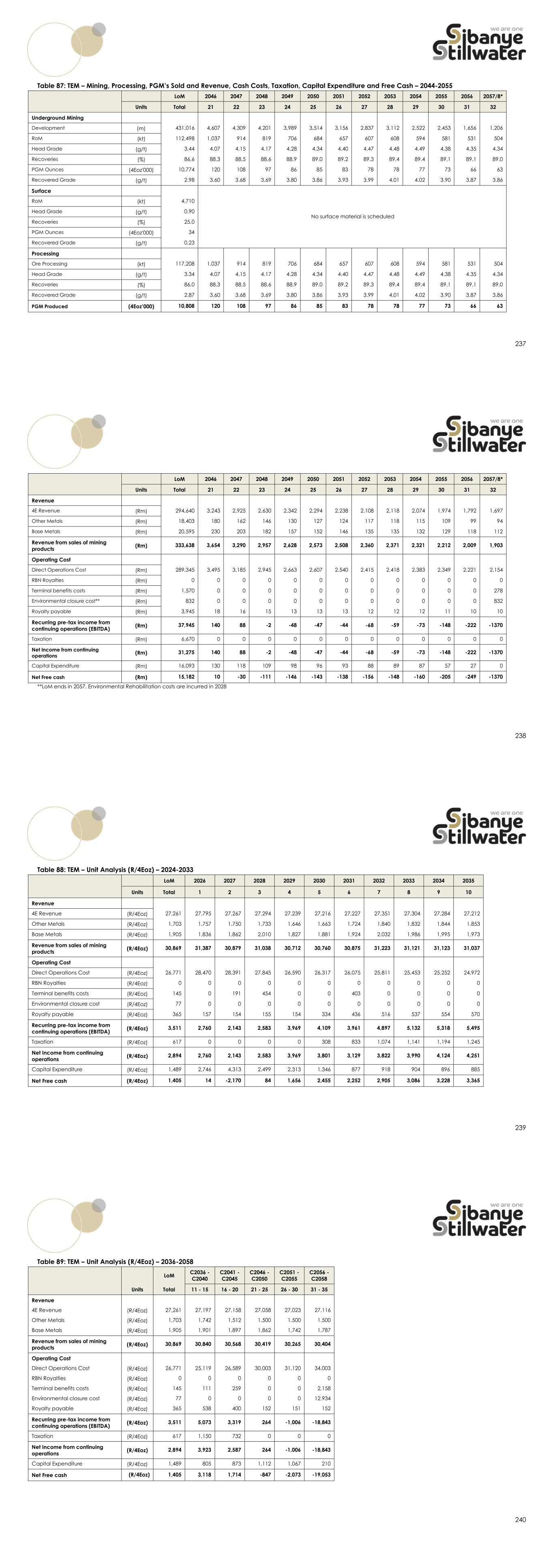 237 Table 87: TEM – Mining, Processing, PGM’s Sold and Revenue, Cash Costs, Taxation, Capital Expenditure and Free Cash – 2044-2055 LoM 2046 2047 2048 2049 2050 2051 2052 2053 2054 2055 2056 2057/8* Units Total 21 22 23 24 25 26 27 28 29 30 31 32 Underground Mining Development (m) 431,016 4,607 4,309 4,201 3,989 3,514 3,156 2,837 3,112 2,522 2,453 1,656 1,206 RoM (kt) 112,498 1,037 914 819 706 684 657 607 608 594 581 531 504 Head Grade (g/t) 3.44 4.07 4.15 4.17 4.28 4.34 4.40 4.47 4.48 4.49 4.38 4.35 4.34 Recoveries (%) 86.6 88.3 88.5 88.6 88.9 89.0 89.2 89.3 89.4 89.4 89.1 89.1 89.0 PGM Ounces (4Eoz'000) 10,774 120 108 97 86 85 83 78 78 77 73 66 63 Recovered Grade (g/t) 2.98 3.60 3.68 3.69 3.80 3.86 3.93 3.99 4.01 4.02 3.90 3.87 3.86 Surface No surface material is scheduled RoM (kt) 4,710 Head Grade (g/t) 0.90 Recoveries (%) 25.0 PGM Ounces (4Eoz'000) 34 Recovered Grade (g/t) 0.23 Processing Ore Processing (kt) 117,208 1,037 914 819 706 684 657 607 608 594 581 531 504 Head Grade (g/t) 3.34 4.07 4.15 4.17 4.28 4.34 4.40 4.47 4.48 4.49 4.38 4.35 4.34 Recoveries (%) 86.0 88.3 88.5 88.6 88.9 89.0 89.2 89.3 89.4 89.4 89.1 89.1 89.0 Recovered Grade (g/t) 2.87 3.60 3.68 3.69 3.80 3.86 3.93 3.99 4.01 4.02 3.90 3.87 3.86 PGM Produced (4Eoz’000) 10,808 120 108 97 86 85 83 78 78 77 73 66 63 238 LoM 2046 2047 2048 2049 2050 2051 2052 2053 2054 2055 2056 2057/8* Units Total 21 22 23 24 25 26 27 28 29 30 31 32 Revenue 4E Revenue (Rm) 294,640 3,243 2,925 2,630 2,342 2,294 2,238 2,108 2,118 2,074 1,974 1,792 1,697 Other Metals (Rm) 18,403 180 162 146 130 127 124 117 118 115 109 99 94 Base Metals (Rm) 20,595 230 203 182 157 152 146 135 135 132 129 118 112 Revenue from sales of mining products (Rm) 333,638 3,654 3,290 2,957 2,628 2,573 2,508 2,360 2,371 2,321 2,212 2,009 1,903 Operating Cost Direct Operations Cost (Rm) 289,345 3,495 3,185 2,945 2,663 2,607 2,540 2,415 2,418 2,383 2,349 2,221 2,154 RBN Royalties (Rm) 0 0 0 0 0 0 0 0 0 0 0 0 0 Terminal benefits costs (Rm) 1,570 0 0 0 0 0 0 0 0 0 0 0 278 Environmental closure cost** (Rm) 832 0 0 0 0 0 0 0 0 0 0 0 832 Royalty payable (Rm) 3,945 18 16 15 13 13 13 12 12 12 11 10 10 Recurring pre-tax income from continuing operations (EBITDA) (Rm) 37,945 140 88 -2 -48 -47 -44 -68 -59 -73 -148 -222 -1370 Taxation (Rm) 6,670 0 0 0 0 0 0 0 0 0 0 0 0 Net Income from continuing operations (Rm) 31,275 140 88 -2 -48 -47 -44 -68 -59 -73 -148 -222 -1370 Capital Expenditure (Rm) 16,093 130 118 109 98 96 93 88 89 87 57 27 0 Net Free cash (Rm) 15,182 10 -30 -111 -146 -143 -138 -156 -148 -160 -205 -249 -1370 **LoM ends in 2057. Environmental Rehabilitation costs are incurred in 2028 239 Table 88: TEM – Unit Analysis (R/4Eoz) – 2024-2033 LoM 2026 2027 2028 2029 2030 2031 2032 2033 2034 2035 Units Total 1 2 3 4 5 6 7 8 9 10 Revenue 4E Revenue (R/4Eoz) 27,261 27,795 27,267 27,294 27,239 27,216 27,227 27,351 27,304 27,284 27,212 Other Metals (R/4Eoz) 1,703 1,757 1,750 1,733 1,646 1,663 1,724 1,840 1,832 1,844 1,853 Base Metals (R/4Eoz) 1,905 1,836 1,862 2,010 1,827 1,881 1,924 2,032 1,986 1,995 1,973 Revenue from sales of mining products (R/4Eoz) 30,869 31,387 30,879 31,038 30,712 30,760 30,875 31,223 31,121 31,123 31,037 Operating Cost Direct Operations Cost (R/4Eoz) 26,771 28,470 28,391 27,845 26,590 26,317 26,075 25,811 25,453 25,252 24,972 RBN Royalties (R/4Eoz) 0 0 0 0 0 0 0 0 0 0 0 Terminal benefits costs (R/4Eoz) 145 0 191 454 0 0 403 0 0 0 0 Environmental closure cost (R/4Eoz) 77 0 0 0 0 0 0 0 0 0 0 Royalty payable (R/4Eoz) 365 157 154 155 154 334 436 516 537 554 570 Recurring pre-tax income from continuing operations (EBITDA) (R/4Eoz) 3,511 2,760 2,143 2,583 3,969 4,109 3,961 4,897 5,132 5,318 5,495 Taxation (R/4Eoz) 617 0 0 0 0 308 833 1,074 1,141 1,194 1,245 Net Income from continuing operations (R/4Eoz) 2,894 2,760 2,143 2,583 3,969 3,801 3,129 3,822 3,990 4,124 4,251 Capital Expenditure (R/4Eoz) 1,489 2,746 4,313 2,499 2,313 1,346 877 918 904 896 885 Net Free cash (R/4Eoz) 1,405 14 -2,170 84 1,656 2,455 2,252 2,905 3,086 3,228 3,365 240 Table 89: TEM – Unit Analysis (R/4Eoz) – 2036-2058 LoM C2036 - C2040 C2041 - C2045 C2046 - C2050 C2051 - C2055 C2056 - C2058 Units Total 11 - 15 16 - 20 21 - 25 26 - 30 31 - 35 Revenue 4E Revenue (R/4Eoz) 27,261 27,197 27,158 27,058 27,023 27,116 Other Metals (R/4Eoz) 1,703 1,742 1,512 1,500 1,500 1,500 Base Metals (R/4Eoz) 1,905 1,901 1,897 1,862 1,742 1,787 Revenue from sales of mining products (R/4Eoz) 30,869 30,840 30,568 30,419 30,265 30,404 Operating Cost Direct Operations Cost (R/4Eoz) 26,771 25,119 26,589 30,003 31,120 34,003 RBN Royalties (R/4Eoz) 0 0 0 0 0 0 Terminal benefits costs (R/4Eoz) 145 111 259 0 0 2,158 Environmental closure cost (R/4Eoz) 77 0 0 0 0 12,934 Royalty payable (R/4Eoz) 365 538 400 152 151 152 Recurring pre-tax income from continuing operations (EBITDA) (R/4Eoz) 3,511 5,073 3,319 264 -1,006 -18,843 Taxation (R/4Eoz) 617 1,150 732 0 0 0 Net Income from continuing operations (R/4Eoz) 2,894 3,923 2,587 264 -1,006 -18,843 Capital Expenditure (R/4Eoz) 1,489 805 873 1,112 1,067 210 Net Free cash (R/4Eoz) 1,405 3,118 1,714 -847 -2,073 -19,053